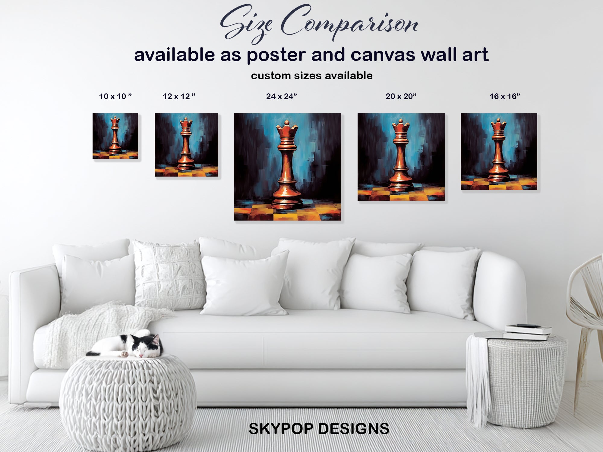 Elevate your space with this striking chess queen canvas wall art, capturing the strategic essence of the game in a modern abstract style. The rich brown and gold tones of the chess piece pop against a cool teal and dark background, creating a visually captivating focal point. This piece transforms any room, from a sophisticated living room or inspiring office to a dedicated game room or quiet library. The bold, textured strokes give this poster a unique presence, making it a conversation starter and a statement of intellectual engagement. Perfect for those who appreciate the art of chess, this canvas wall art brings a sense of power and contemplation to your decor. Its abstract interpretation of a classic game piece makes it a versatile addition to contemporary and minimalist interiors, adding depth and color psychology to your environment. Showcase your love for strategy and refinement with this stunning wall art, ideal for gifting to chess enthusiasts or celebrating a birthday. This high-quality canvas print offers exceptional detail and a premium feel, enhancing any wall. Transform your home with this inspired piece of art that blends classic themes with modern artistic expression. Add a touch of strategic elegance to your home today with this unique chess queen poster.