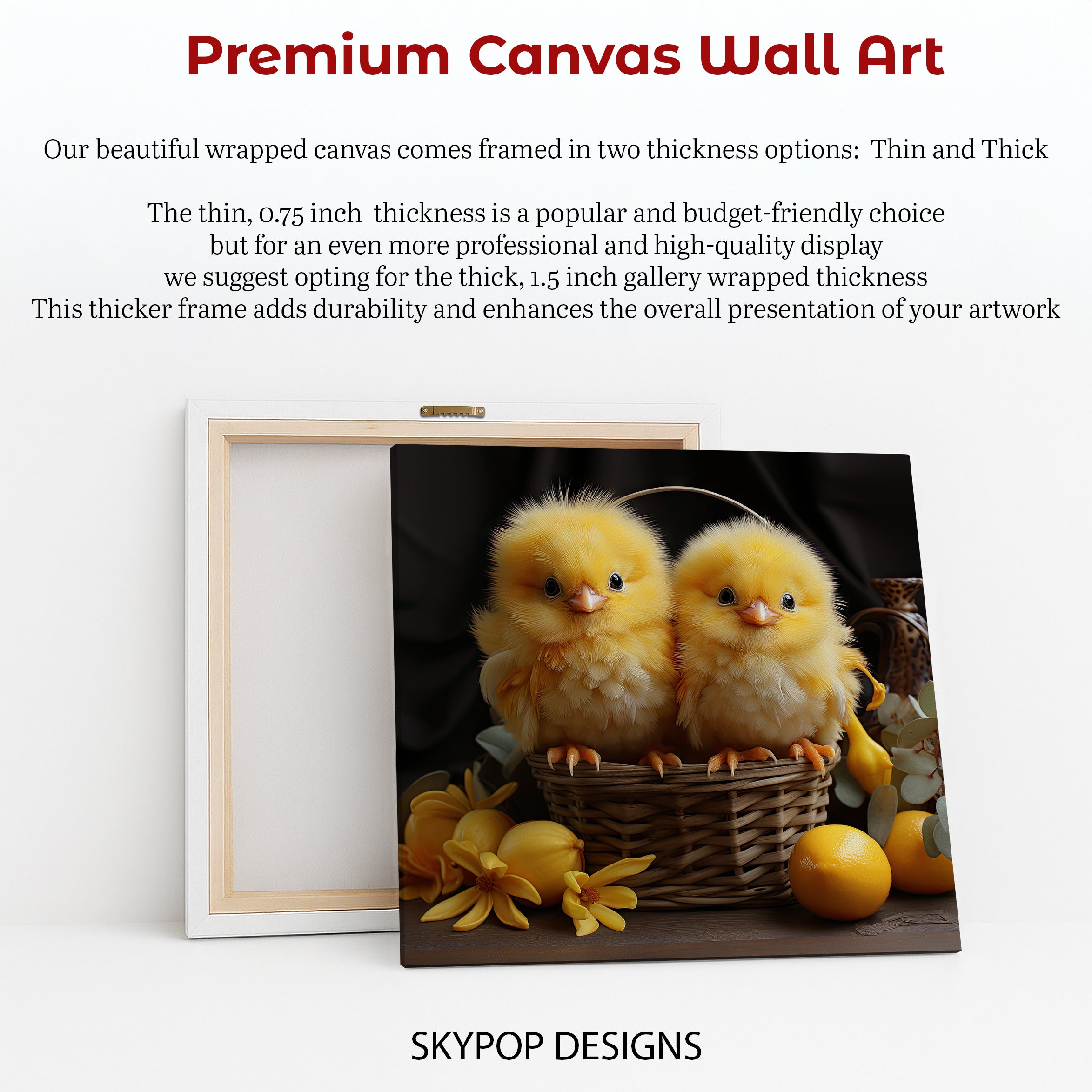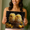 Bring a touch of cuteness to your home with this charming chicks canvas wall art. This delightful poster features two fluffy yellow chicks nestled in a rustic woven basket, surrounded by vibrant yellow flowers and fruit, creating a cheerful and endearing scene. The striking yellow colors evoke feelings of happiness and warmth, making this canvas wall art a perfect addition to any space. Ideal for a children's room or nursery, this whimsical animal art poster will surely bring smiles. It's also a wonderful fit for farmhouse or country decor, adding a sweet, pastoral touch. This versatile artwork as a poster or canvas print can transform your kitchen or living room into a more inviting and lively area. The detailed textures of the feathers and basket are beautifully captured, offering a high-quality piece of wall decor. It makes a fantastic gift for baby showers, birthdays, or housewarmings. Celebrate springtime or add a splash of joy year-round with this captivating chicks poster. Elevate your walls with this heartwarming artwork that radiates pure innocence and charm. This canvas print is a simple yet beautiful way to express your love for all things cute.