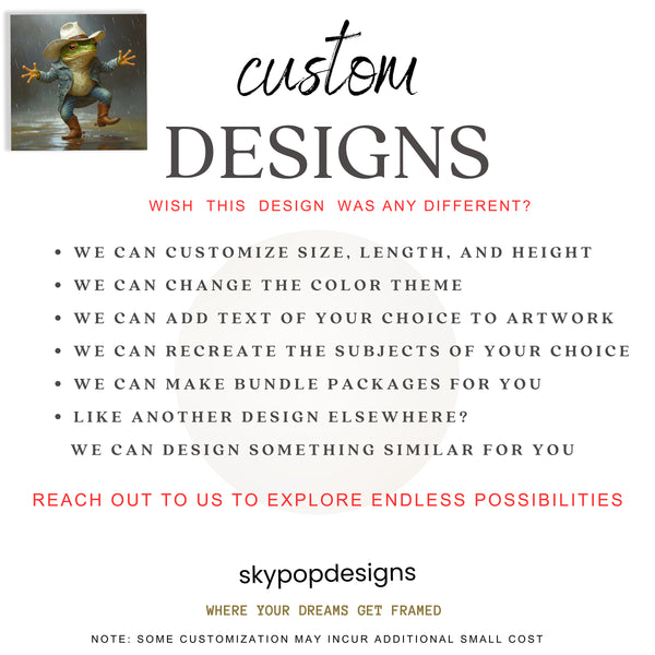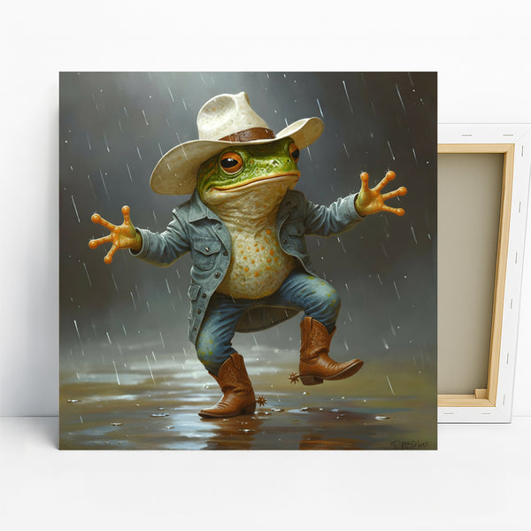 Embrace the fun with this unique cowboy frog canvas wall art. This captivating poster features a charming frog dressed as a cowboy, complete with a hat, denim jacket, and boots, dancing in the rain. The vibrant colors and whimsical style add a playful touch to any space, making it perfect for your living room, game room, or entryway. This animal art is ideal for those who love a touch of country or rustic decor, bringing a smile to your face every day. The striking image of the frog evokes a sense of joy and freedom, transforming your walls into a delightful focal point. This canvas wall art is perfect for a children's room, adding a splash of fun and imagination. Showcase your personality with this eye-catching poster that’s sure to be a conversation starter. Its detailed design and high-quality printing ensure this artwork will be a cherished addition to your home decor. This frog wall art is a fantastic gift for birthdays, housewarmings, or any occasion. Elevate your home decor with this unique blend of retro charm and whimsical animal art. Transform your space and celebrate the joy of simple pleasures with this delightful frog canvas print. Add this fun and quirky artwork to your collection and bring a little whimsy into your life.