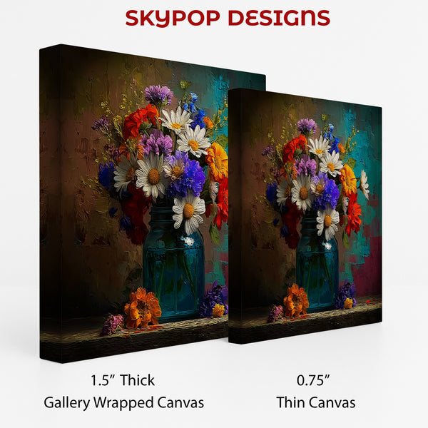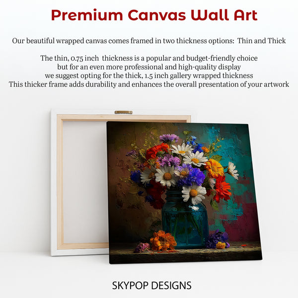 Brighten your home with this stunning floral canvas wall art featuring a vibrant bouquet of wildflowers. The impressionistic style and rich multicolor palette bring life and energy to any space, making this poster a captivating focal point. Perfect for a living room, dining room, or bedroom, this canvas art adds a touch of bohemian charm and country warmth to your decor. The deep blue jar holding the colorful flowers creates a striking contrast, while the textured brushstrokes evoke the beauty of nature. This piece is ideal for those who love farmhouse or country decor, enhancing a natural and inviting atmosphere. The diverse array of flowers, including daisies, chrysanthemums, and cornflowers, showcases a beautiful balance of colors like reds, oranges, purples, and whites, evoking feelings of joy and serenity. This versatile artwork also makes a thoughtful housewarming or birthday gift, offering lasting beauty and inspiration. Elevate your walls with this exquisite floral canvas wall art and capture the essence of a summer garden. The quality printing ensures the intricate details and vivid colors of the flowers pop, creating a truly artistic statement. Transform your room with this beautiful piece of wall art that brings the outdoors in, offering a refreshing and cheerful vibe. Enhance your home's aesthetic with this captivating bouquet poster that celebrates the simple beauty of nature. Add this eye-catching floral art to your collection and enjoy its timeless appeal.