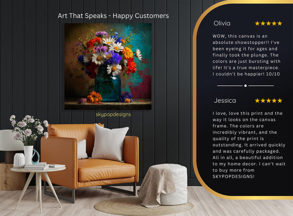 Keywords: Floral Art, Impressionism Art, Nature Art, Bohemian Decor, Country Decor, Farmhouse Decor, Living Room Wall Art, Dining Room Art, Bedroom Art, Kitchen Wall Decor, Multicolor Art, Blue Floral Art, Green Floral Art, Orange Floral Art, Flower Bouquet Art, Wildflower Art, Canvas Wall Art, Floral Poster, Home Decor, Wall Decor, Housewarming Gift, Birthday Gift, Joyful Art, Serene Art, Textured Art, Vibrant Colors, Multicolor Flowers, Floral Interior Design, Art for Home, Botanical Art