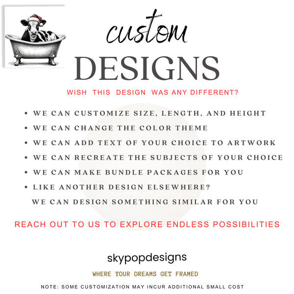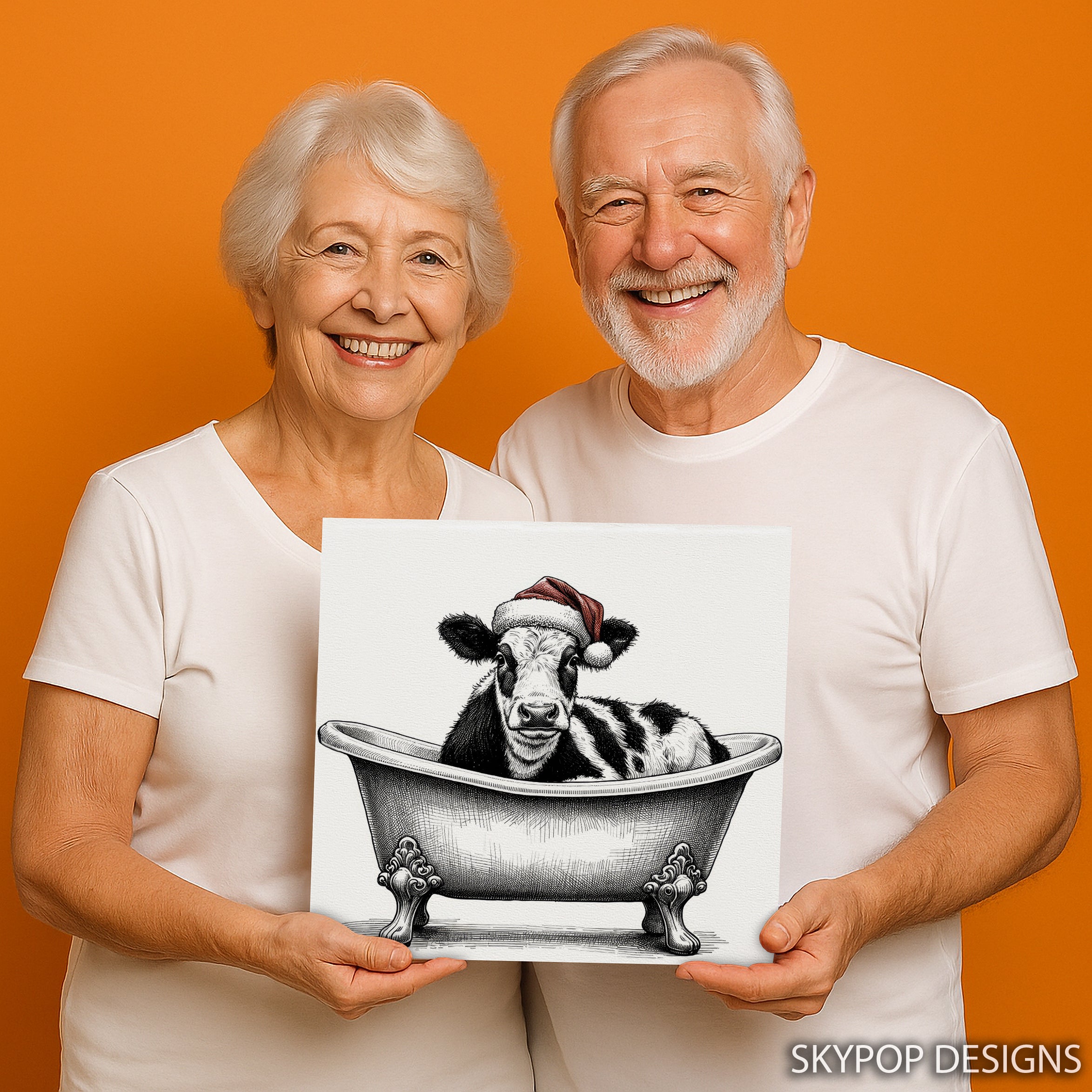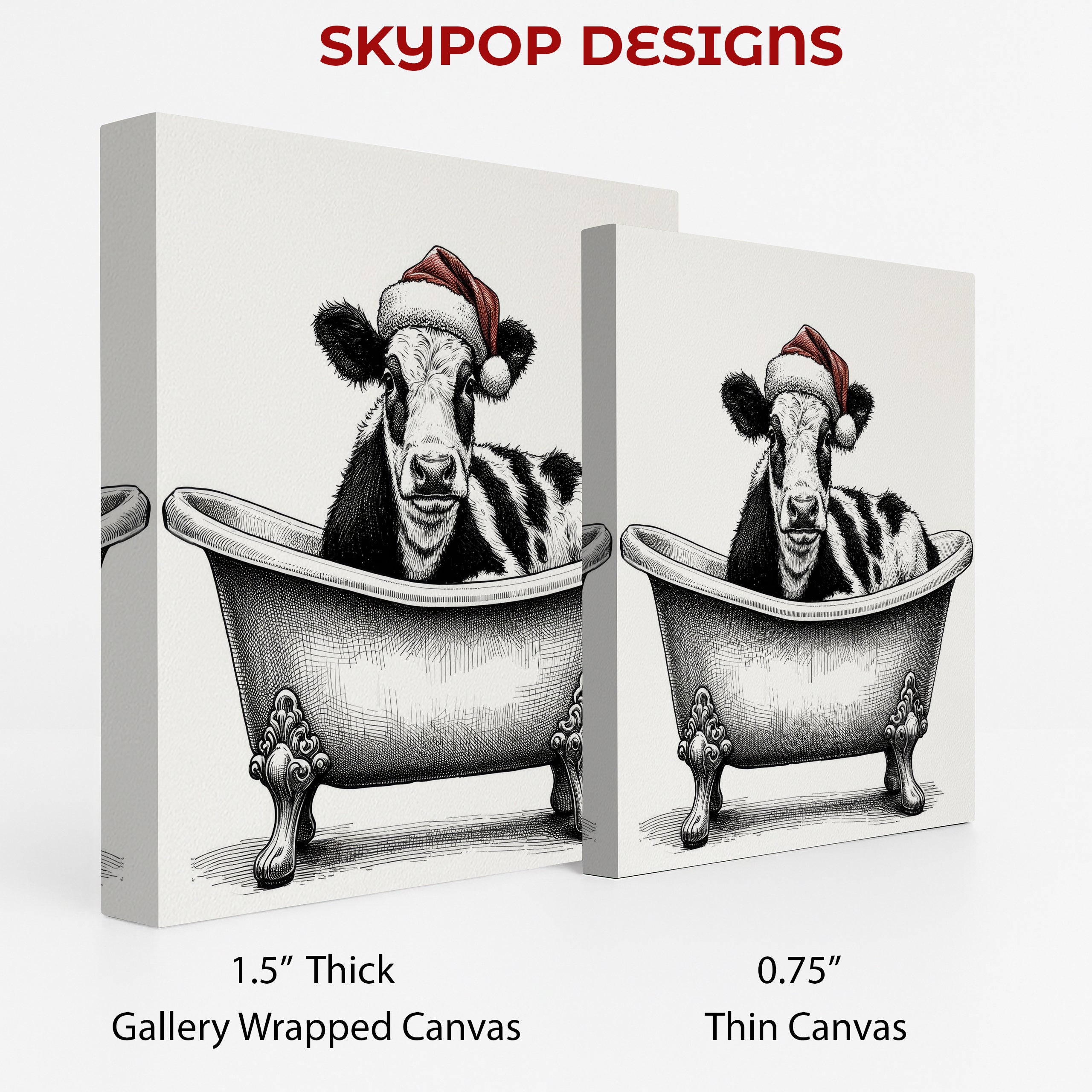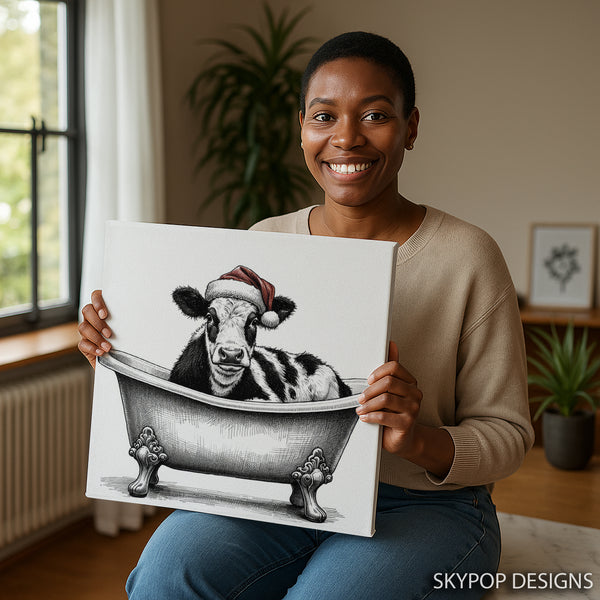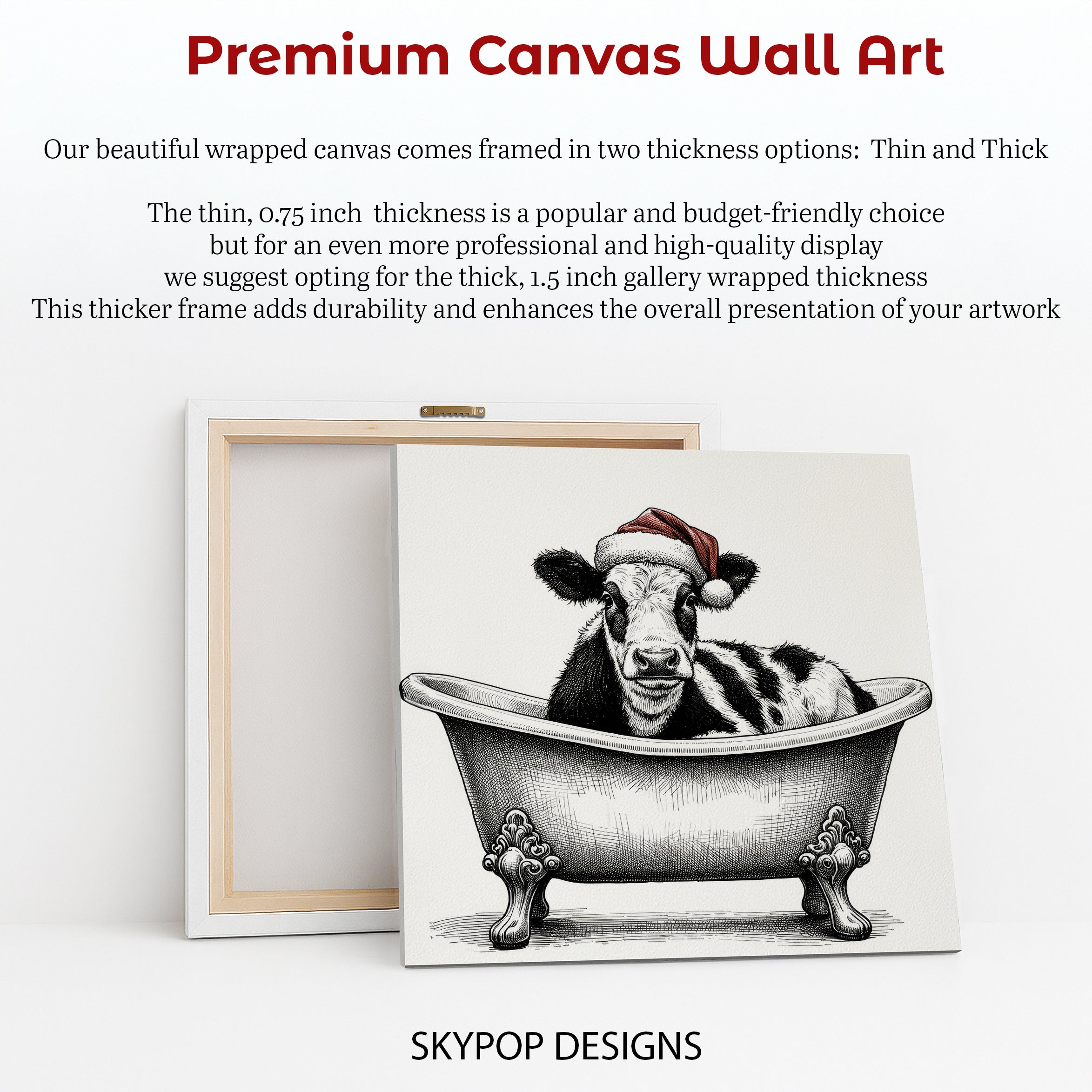 Keywords: Highland Cow Art, Christmas Cow Decor, Whimsical Wall Art, Vintage Bathroom Art, Farmhouse Decor, Country Style Art, Rustic Home Decor, Animal Art Print, Black and White Art, Red Accent Art, Holiday Wall Art, Santa Hat Cow, Clawfoot Tub Art, Canvas Wall Art, Living Room Decor, Bedroom Wall Art, Bathroom Wall Art, Children's Room Decor, Cow Lover Gift, Farmer Gift, Unique Holiday Gift, Festive Artwork, Humorous Wall Art, Cozy Home Art, Statement Wall Art, Textured Canvas Art, Animal Prints, Holiday Cheer, Seasonal Decor, Playful Charm