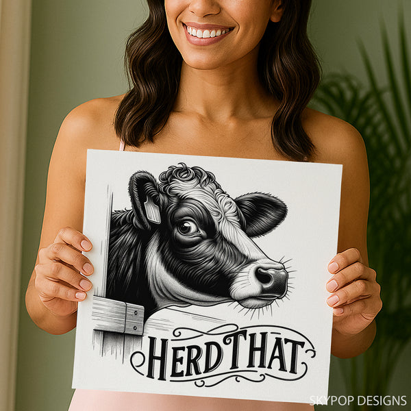 Inject farm charm into your home with this striking Highland Cow canvas wall art, featuring a vintage-inspired design with a playful "Herd That" quote. This captivating poster or canvas wall art, rendered in bold black and white, brings a touch of rustic country decor to any space, making it perfect for farmhouse kitchens or cozy living rooms. The detailed linework and stippling technique on the highland cow create a unique, almost graffiti-like texture, adding depth and artistic flair that elevates your wall decor. This animal art poster also works beautifully in a dining room or entryway, offering a conversation starter and a warm welcome. The monochrome palette enhances its versatility, fitting seamlessly with various interior styles from minimalist to farmhouse chic. It's an ideal piece to celebrate the beauty of farm animals and to showcase your love for vintage aesthetics, transforming your walls into a gallery of personality. Surprise a friend or family member with this unique canvas wall art, a perfect farmhouse-themed gift for housewarmings or birthdays. This high-quality print captures every intricate detail, promising a statement piece that embodies both tradition and modern artistic expression. Elevate your home decor with this stunning highland cow artwork today and bring a touch of the countryside indoors. This versatile wall art is available in various sizes to perfectly suit your desired wall space.