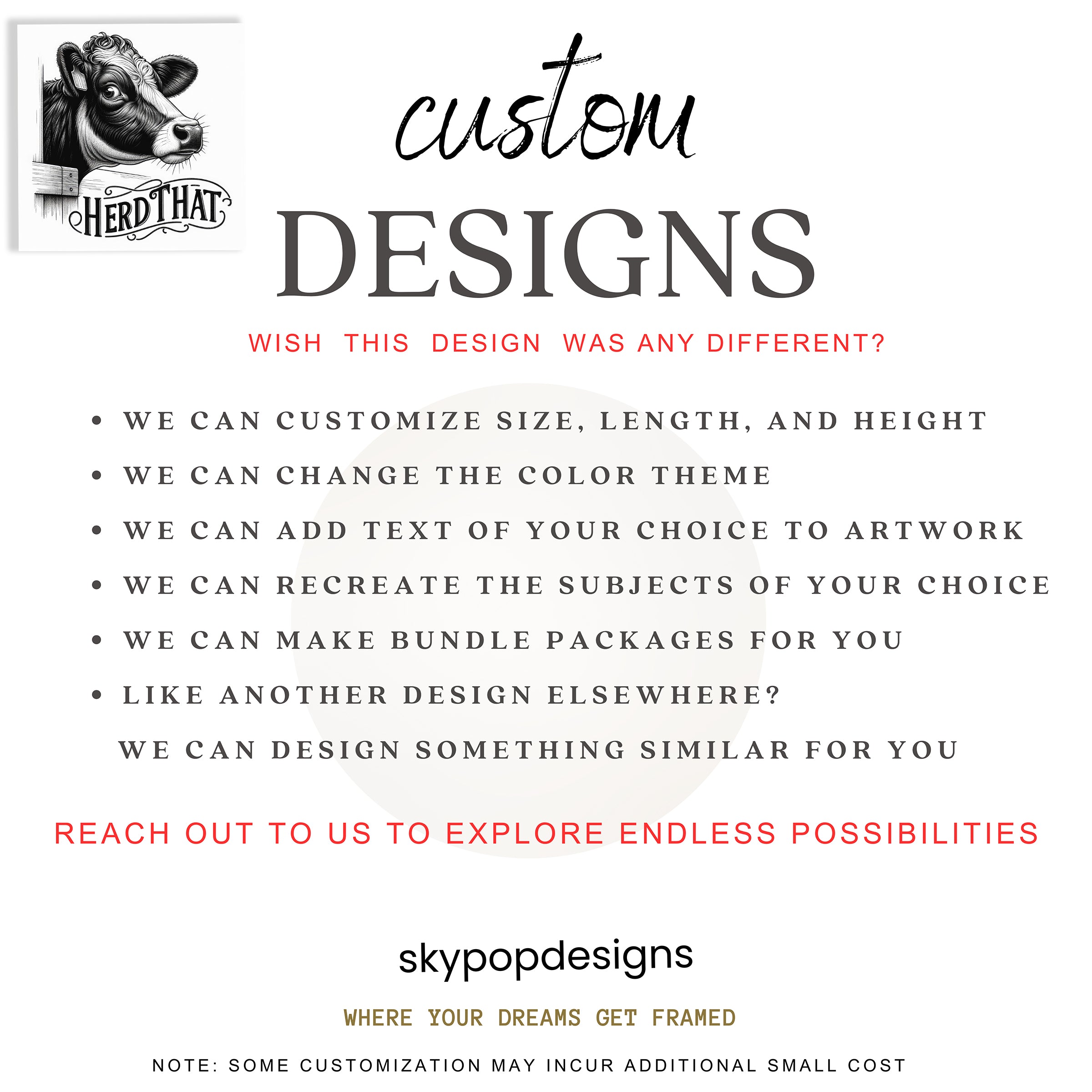 Looking for a custom design, or do you love a particular design but need it in a different size or orientation? Perhaps you've found a design elsewhere and wish for us to create something similar for you? Drop us a message! We're dedicated to meeting your needs and will work closely with you to ensure your vision comes to life.