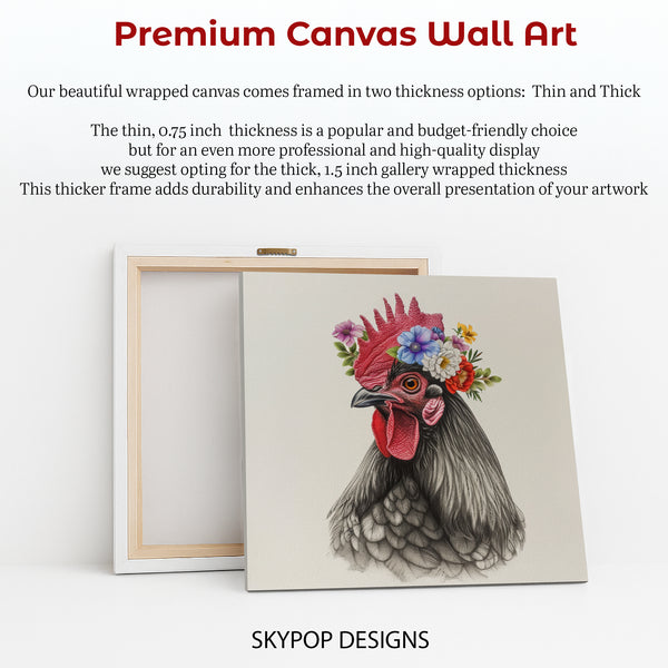 Bring a touch of rustic charm to your home with this unique Rooster canvas wall art. This striking poster showcases a detailed illustration of a rooster adorned with a vibrant crown of colorful flowers, creating a beautiful juxtaposition of nature and farm life. The intricate details in the rooster's feathers and the realistic depiction of the blossoms make this canvas wall art a captivating piece for any room. It's perfect for transforming your kitchen into a cozy farmhouse haven or adding personality to your dining room or living room decor. This versatile wall art also makes an ideal gift for housewarmings or birthdays for anyone who appreciates country-style decor or unique animal art. The blend of black, white, red, and vibrant multicolor floral accents creates a visually appealing piece that can complement various color schemes. Showcase your love for nature and farm animals with this stunning piece that will surely be a conversation starter. Elevate your home's aesthetic with this high-quality canvas print that brings the beauty of the outdoors inside. This rooster poster offers a fresh take on traditional farm animal art, making it a trendy addition to your home decor. Transform your space with this eye-catching artwork and add a touch of floral elegance to your walls. Get this captivating canvas wall art to brighten your home today.