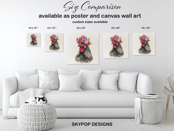Rooster Flower Crown Art, Canvas or Poster, Farmhouse Rustic Decor, Kitchen Dining Room Living Room Wall Art, Multicolor Red White Black