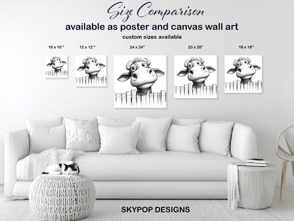 Bring a touch of whimsical charm to your home with this captivating Highland Cow canvas wall art. The striking black and white sketch features an adorable, curious Highland Cow peeking over a rustic wooden fence, perfect for transforming your living room or bedroom. This unique piece of animal art adds personality and warmth, making it an ideal poster for contemporary, bohemian, or even farmhouse decor styles. The detailed hatching technique gives this canvas wall art a textured and artistic feel, enhancing its visual appeal. It’s a delightful addition to a child's room or a cozy kitchen, sparking joy and conversation. The monochromatic palette makes this wall art versatile, fitting seamlessly with various color schemes. This Highland Cow poster is a charming way to celebrate farm life and nature in your home decor. It makes a thoughtful gift for animal lovers, housewarmings, or birthdays. High-quality printing ensures the intricate details of the cow and fence are perfectly captured on this stunning canvas poster. Elevate your space with this endearing creature and create a welcoming atmosphere. Add this playful Highland Cow artwork to your collection today and enjoy its cheerful presence.