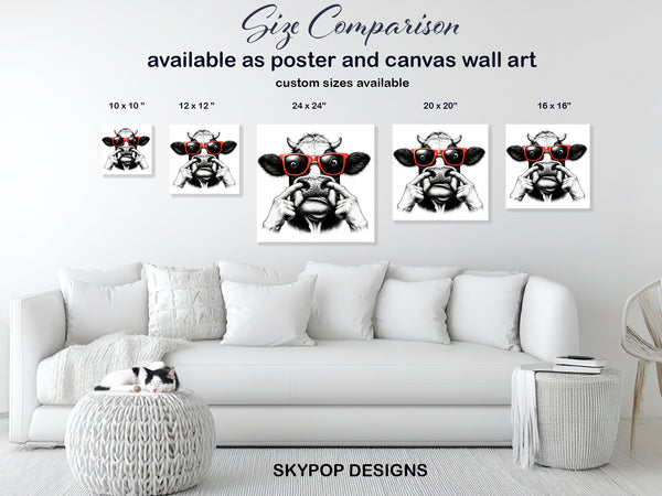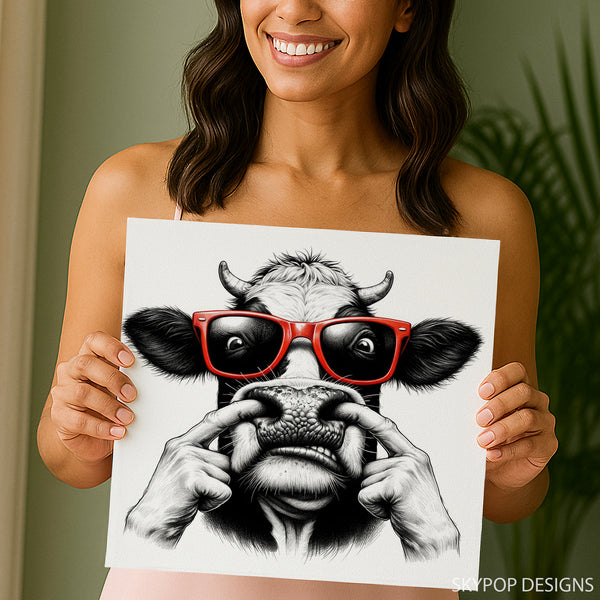 Liven up your space with this striking Highland Cow canvas wall art, a perfect conversation starter that brings a dose of playful personality. This captivating poster showcases a black and white Highland Cow sporting vibrant red glasses and is rendered in a bold, graphic style akin to street art. It's the ideal wall decor to transform a modern living room, add edgy flair to a kitchen, or inject fun into an office space. The strong contrast of black and white, punctuated by the pop of red, creates a visually dynamic piece that enhances any contemporary or bohemian setting. This unique animal art is a fantastic way to showcase your fun side and celebrate quirky charm, making it a standout addition to any home. Consider this eye-catching print as a memorable gift for birthdays, housewarmings, or just because, adding a touch of humor and style. The detailed linework and expressive character of this canvas wall art ensure it will elevate your home decor. Whether you are looking for modern wall decor or unique art for your game room, this Highland Cow poster delivers. Embrace the bold and the whimsical with this exceptional piece of art that promises to bring smiles and style to your walls. Make your space unforgettable with this unique Highland Cow canvas art - a true statement piece for the modern home.