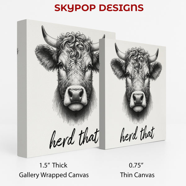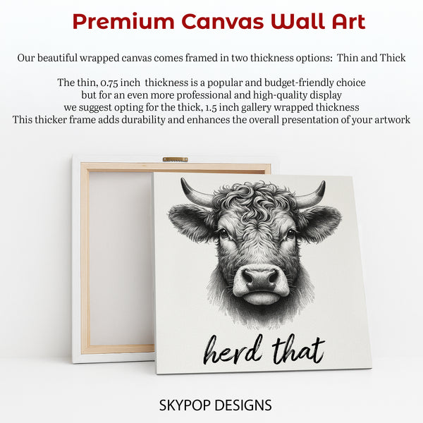 Transform your space with this striking Highland Cow canvas wall art, featuring a bold black and white portrait with the witty phrase herd that. This captivating poster or canvas wall art brings a touch of farmhouse charm and rustic appeal to any room. The detailed linework of the Highland Cow's shaggy coat and powerful horns adds a striking visual element, while the modern script makes a statement. Perfect for living rooms, kitchens, or entryways, this versatile artwork elevates your home decor with its unique blend of vintage artistry and contemporary attitude. This piece is ideal for homes embracing farmhouse, rustic, or even bohemian interior styles, offering a conversation-starting focal point. Showcase your love for farm animals with this high-quality canvas print that radiates personality and a touch of rebel spirit. The dramatic black and white palette creates a timeless look that complements various color schemes, enhancing the overall ambiance of your space. Whether you're seeking a unique housewarming gift or a standout piece for your own collection, this Highland Cow artwork delivers. Celebrate country living and bold design with this impressive poster and canvas wall art. Elevate your home's style and bring character to your walls today with this memorable herd that wall art.