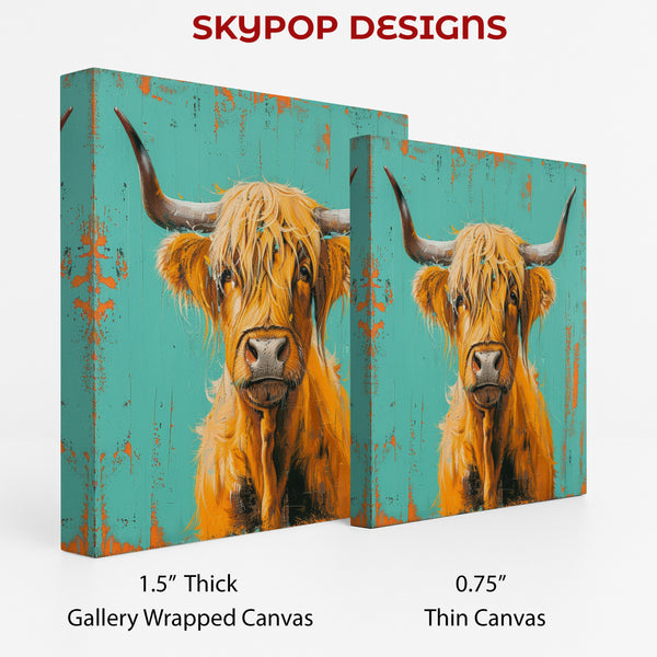 Highland Cow Art, Canvas or Poster, Farmhouse Decor, Living Room Bedroom Entryway Kitchen Art, Teal Orange Brown Multicolor, Animal Wall Art