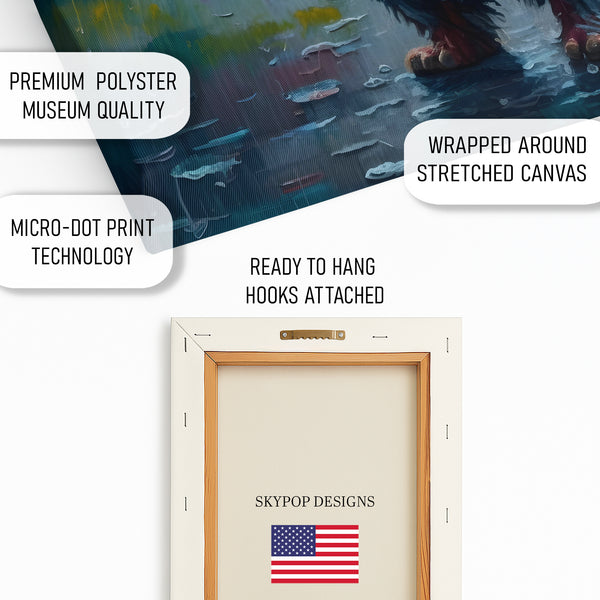 Transform your space with this captivating highland cow canvas wall art, showcasing a whimsical musician caught in a moody downpour. This striking poster or canvas wall art uses a blend of blues, browns, and multicolor accents to evoke a unique, artistic atmosphere. The expressive highland cow playing a guitar in the rain creates a heartwarming and slightly melancholic scene, perfect for adding personality to your living room or bedroom. Ideal for bohemian or modern decor styles, this piece adds a touch of charm and individuality to any home. The vibrant splashes of color against the dark, rainy backdrop create a visually engaging composition that is both calming and inspiring. This canvas print is perfect for anyone who loves unique animal art and wants to create a cozy, inviting ambiance. It also makes a fantastic gift for animal lovers, musicians, or anyone celebrating a birthday or housewarming. Printed on high-quality canvas, this artwork captures the painterly details and emotional depth of the original piece. Elevate your wall decor with this one-of-a-kind highland cow artwork that is sure to spark conversation and bring a smile to your face. Add a touch of quirky charm and artistic flair to your home with this delightful highland cow poster today.