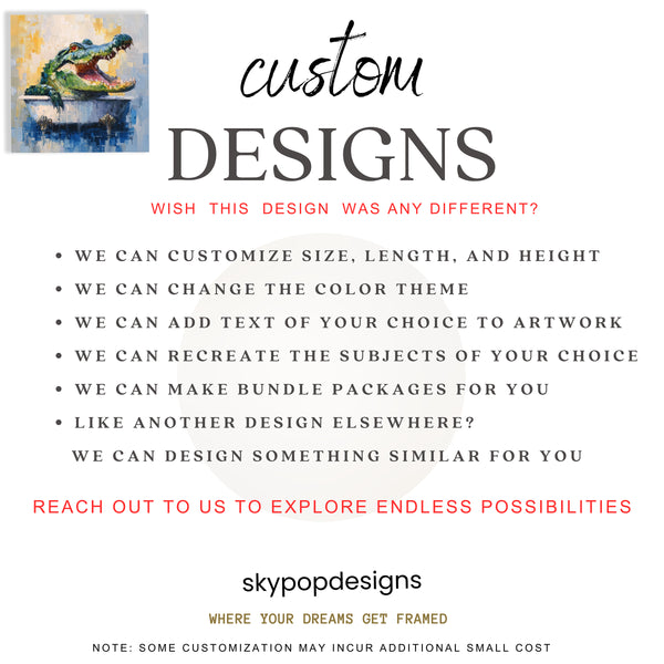 Keywords: Crocodile wall art, Animal art canvas, Impasto art print, Contemporary art decor, Modern home art, Eclectic wall decor, Bohemian art piece, Bathroom wall art, Living room art, Game room decor, Entryway art, Multicolor art, Blue green art, Yellow green art, Crocodile art print, Animal theme decor, Home decor art, Canvas wall art, Living room decor, Unique wall art, Whimsical home decor, Bold brushstrokes, Textured art, Art for sale, Birthday gift art, Housewarming gift, Wildlife art, Statement art, Expressive art, Colorful wall decor