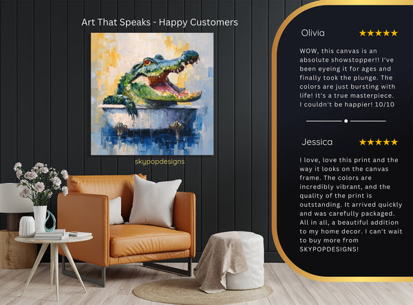 Bring a splash of unexpected personality to your home with this striking crocodile canvas wall art. This captivating piece showcases a vibrant crocodile enjoying a surprisingly domestic moment, rendered in a bold impasto style with rich textures. The striking combination of greens, blues, and yellows creates a dynamic visual that will transform any living room or game room into a conversation starter. This animal art poster is perfect for those looking to add a touch of eclectic charm or bohemian flair to their decor. The high-quality canvas printing ensures the deep textures and vivid colors pop, making this wall art a standout addition to your collection. It’s an ideal piece for modern bathrooms that crave a whimsical twist or entryways that need an unforgettable welcome. Celebrate unique animal art with this eye-catching crocodile piece that brings both humor and artistry into your space. This versatile wall art also makes a fantastic gift for birthdays or housewarmings, delighting anyone with a sense of fun and appreciation for bold art. Elevate your surroundings with this unique crocodile canvas art that offers a fresh perspective on everyday scenes. The bold brushstrokes and energetic color palette enhance the lively nature of the artwork, ensuring it captures attention. Add this stunning crocodile poster to your decor and instantly inject fun and character into your home.