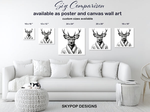 Transform your space with this striking deer canvas wall art featuring a sophisticated deer wearing a plush robe. The bold black and white linework gives this animal art a contemporary feel, perfect for modern or minimalist decor styles. This unique poster or canvas wall art adds a touch of whimsy and intrigue to any room, making it an ideal focal point for living rooms or offices. The detailed illustration of the deer's antlers and textured robe enhances its artistic appeal, creating a captivating visual experience. This piece is versatile for various decor styles, from Scandinavian to contemporary, and adds personality to minimalist interiors. Celebrate nature with a touch of unexpected elegance that will spark conversation among guests. The high-quality canvas print showcases exceptional detail and clarity, ensuring a lasting impression. It's a perfect gift for animal lovers, art enthusiasts, or anyone looking to add a unique statement piece to their home decor. Elevate your walls with this eye-catching deer artwork, a timeless addition that brings a sense of calm and sophistication. Whether displayed in an entryway, bedroom, or creative space, this artwork promises to inspire and delight. Discover the perfect blend of nature and sophisticated design with this captivating deer canvas wall art. This distinct poster or canvas wall art is an exceptional choice for enriching your home's aesthetic with its graphic charm.
