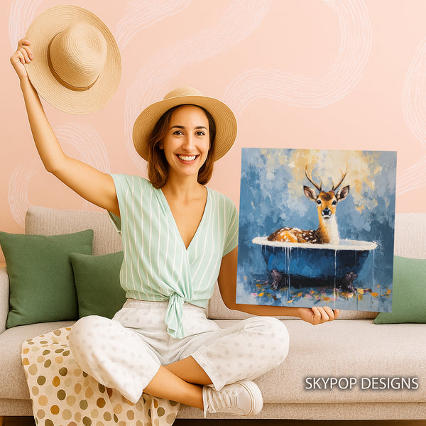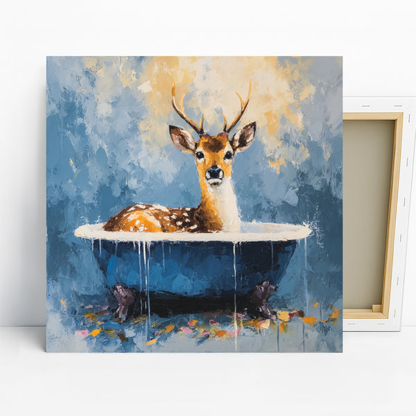 Keywords: Deer Art, Whimsical Wall Art, Animal Canvas Print, Blue Gold Decor, Multicolor Art, Brown Deer Art, Contemporary Art, Modern Decor, Bohemian Style, Eclectic Home, Living Room Art, Bedroom Wall Art, Bathroom Decor, Entryway Art, Deer Bathtime, Canvas Wall Art, Charming Artwork, Textured Brushstrokes, Vibrant Colors, Soothing Atmosphere, Inviting Decor, Conversation Starter, Mood Enhancer, Joyful Art, Playful Tranquility, High-Quality Canvas, Personalized Wall Decor, Housewarming Gift, Unique Art Poster, Art Lovers