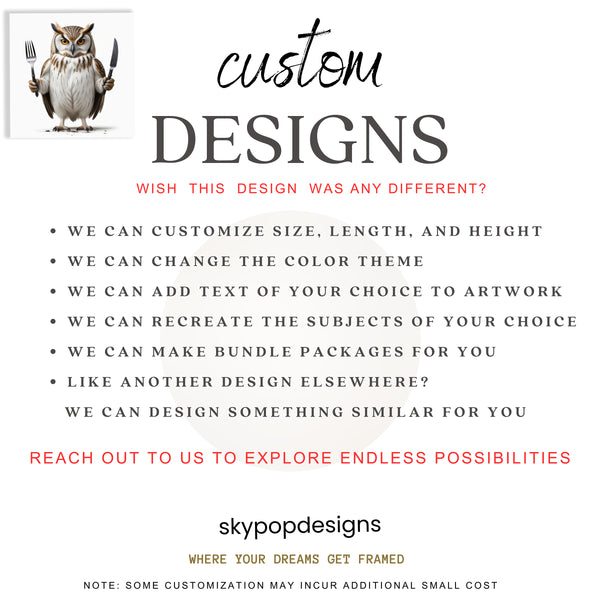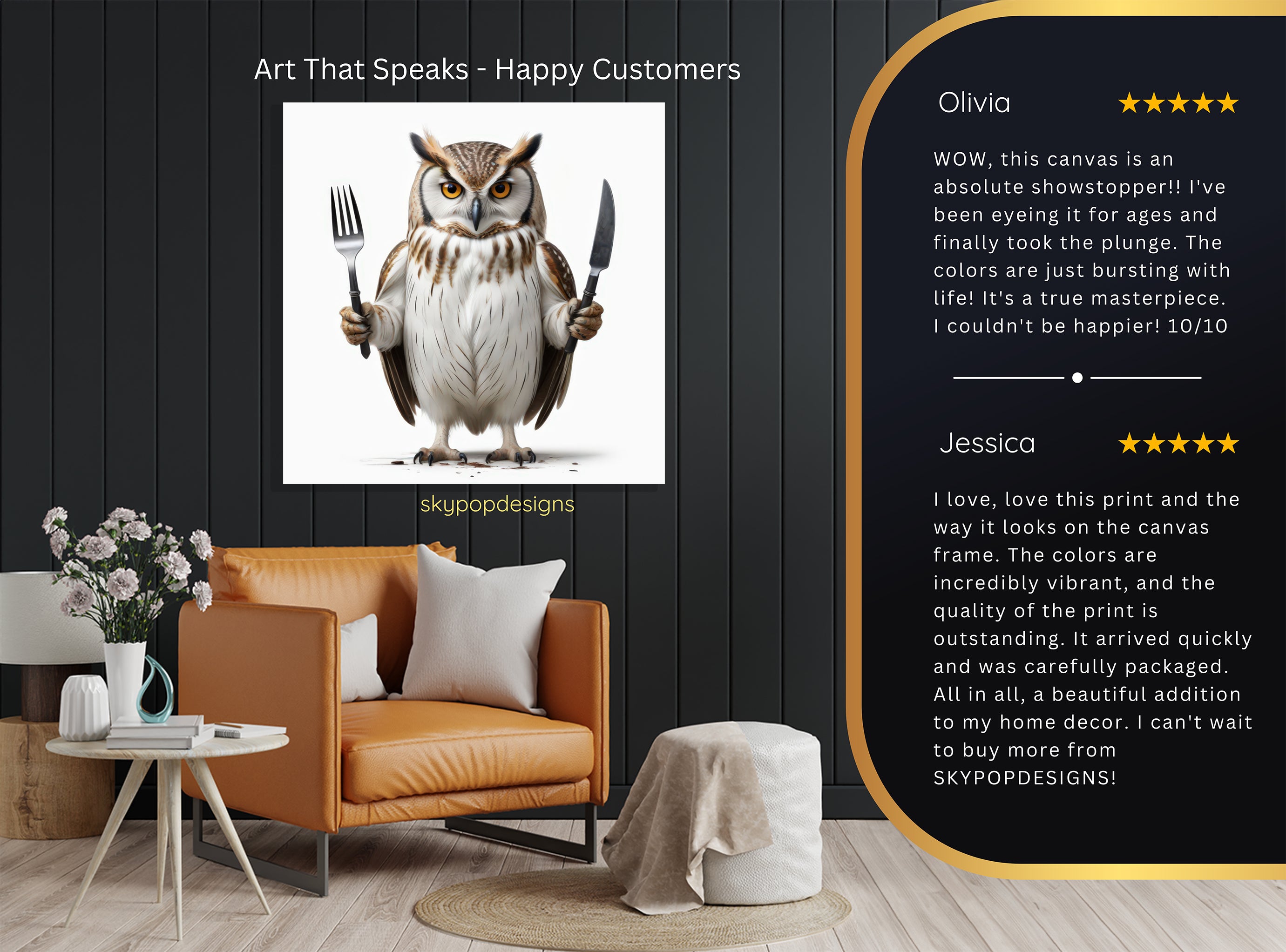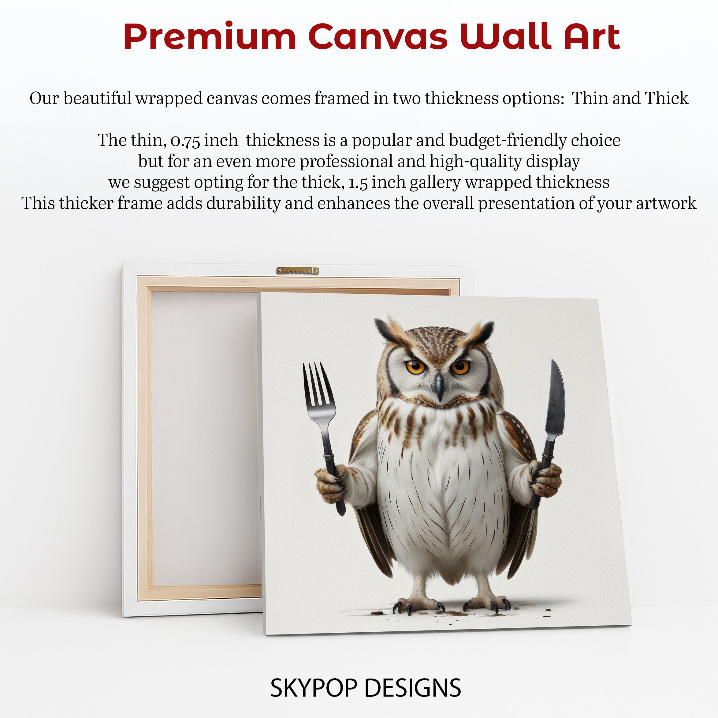 Keywords: Owl art, Canvas wall art, Contemporary art, Whimsical art, Animal art, Modern decor, Minimalist decor, Living room art, Office decor, Dining room art, Entryway art, Brown art, White art, Yellow art, Multicolor art, Fork and knife art, Ready to eat art, Nature art, Wall decor, Home decor, Unique art, Art for home, Art gift, Housewarming gift, Birthday gift, Playful art, Sophisticated decor, Amber eyes art, Feather art, Statement art