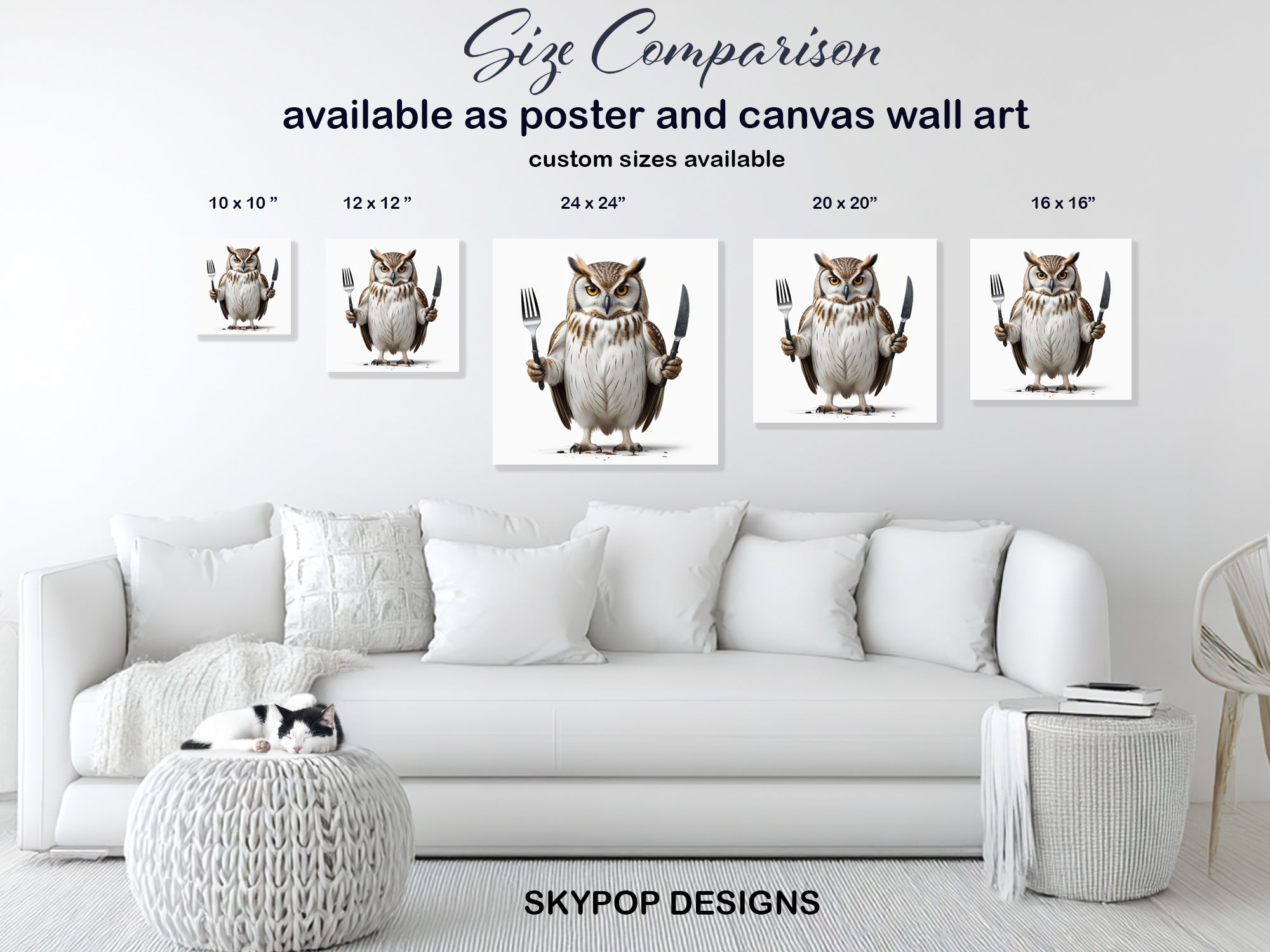 Transform your living space with this striking owl canvas wall art. This captivating piece features a uniquely depicted owl, ready to dine with a fork and knife, making a bold statement in any room. The contemporary style and whimsical nature of this animal art create an eye-catching focal point, perfect for modern and minimalist decor. Use this poster or canvas wall art to infuse your office, dining room, or entryway with personality and a touch of playful sophistication. The vibrant amber eyes of the owl stand out against its natural brown and white plumage, adding a pop of color and life to your walls. This versatile artwork is ideal for those who appreciate distinctive nature art and modern home decor trends. It’s a fantastic conversation starter and a unique gift for housewarmings or birthdays. Imagine the character this owl canvas art will bring to your home, enhancing your interior design and inspiring a sense of curious charm. The high-quality print ensures the intricate details of the feathers and the sharp focus on the owl are beautifully rendered. Elevate your wall decor with this imaginative and engaging piece of owl art. Discover the perfect blend of artistic expression and animal admiration for your home today. This owl poster is sure to be a cherished addition to your collection of unique wall art.