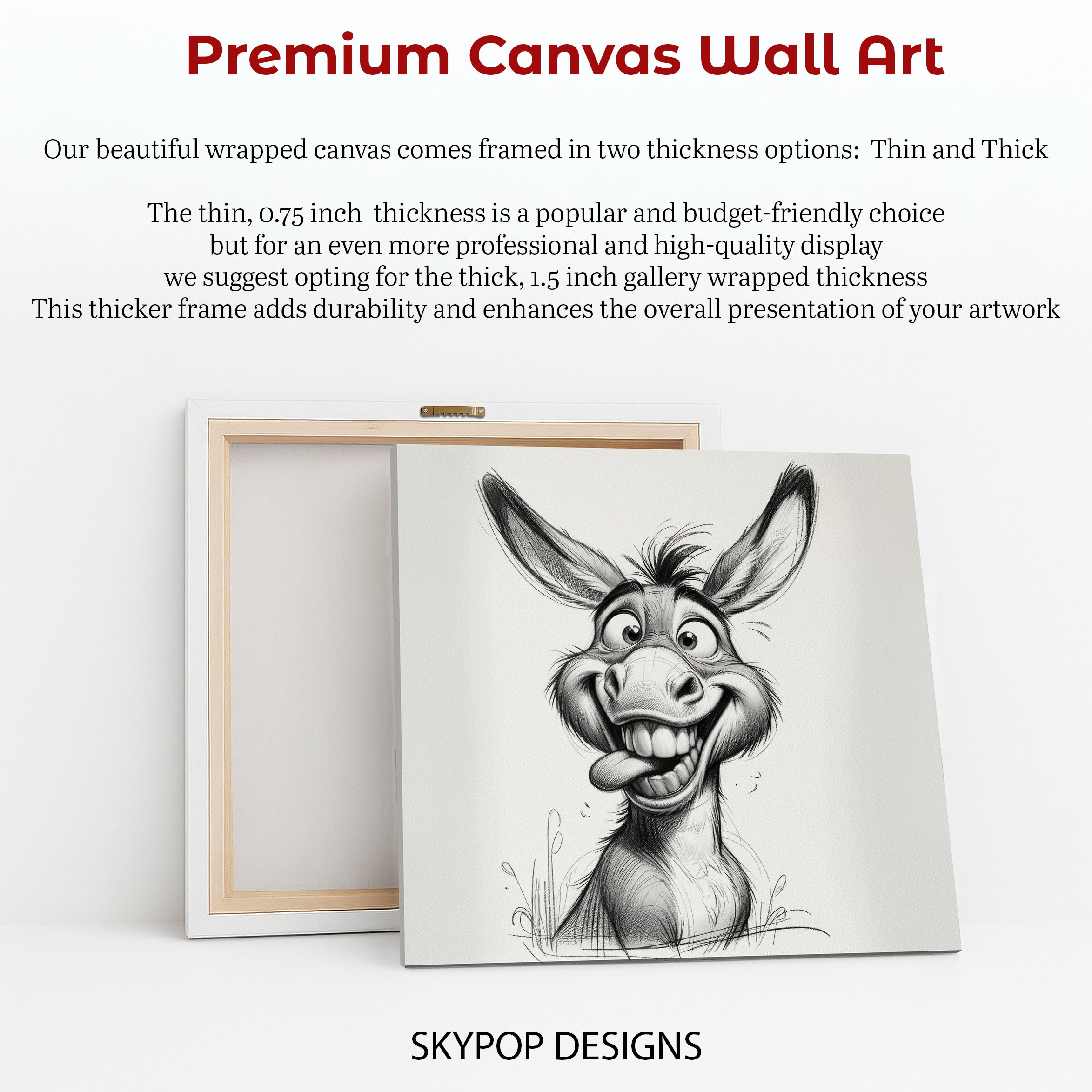 Bring a smile to your face with this hilarious donkey canvas wall art. This striking black and white sketch captures the pure joy of a cartoon donkey mid-laugh, making it a perfect conversation starter for any room. The whimsical animal art style is complemented by a minimalist design, making this poster ideal for modern lovers of unique decor. This canvas wall art will instantly transform your living room, bedroom, or office with its playful energy and expressive charcoal-like rendering. It’s not just art; it’s a mood booster that brings a sense of lighthearted fun into your home. Perfect for a bohemian or contemporary space, this versatile piece adds personality without overwhelming. The detailed linework and exaggerated features of the donkey create a captivating focal point. This poster is a great gift for animal lovers or anyone who appreciates a good chuckle, perfect for housewarmings or birthdays. High-quality printing ensures the sharp details of this charming artwork stand out on any wall. Elevate your interior design with this unique and expressive wall art that celebrates the simple pleasures of life. Make this funny donkey the star of your wall decor collection today.