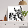 Bring a smile to your face with this eye-catching donkey canvas wall art featuring a playful donkey saying Hello Sweet Cheeks. This striking black and white poster art uses a minimalist design to create a bold statement piece for any room. The intricate detail in the donkey's fur and expressive eyes makes this canvas wall art a true work of art, perfect for adding personality to your living room, office, or even kitchen wall decor.