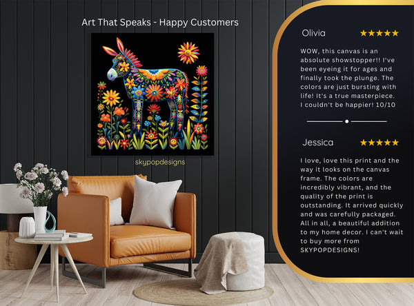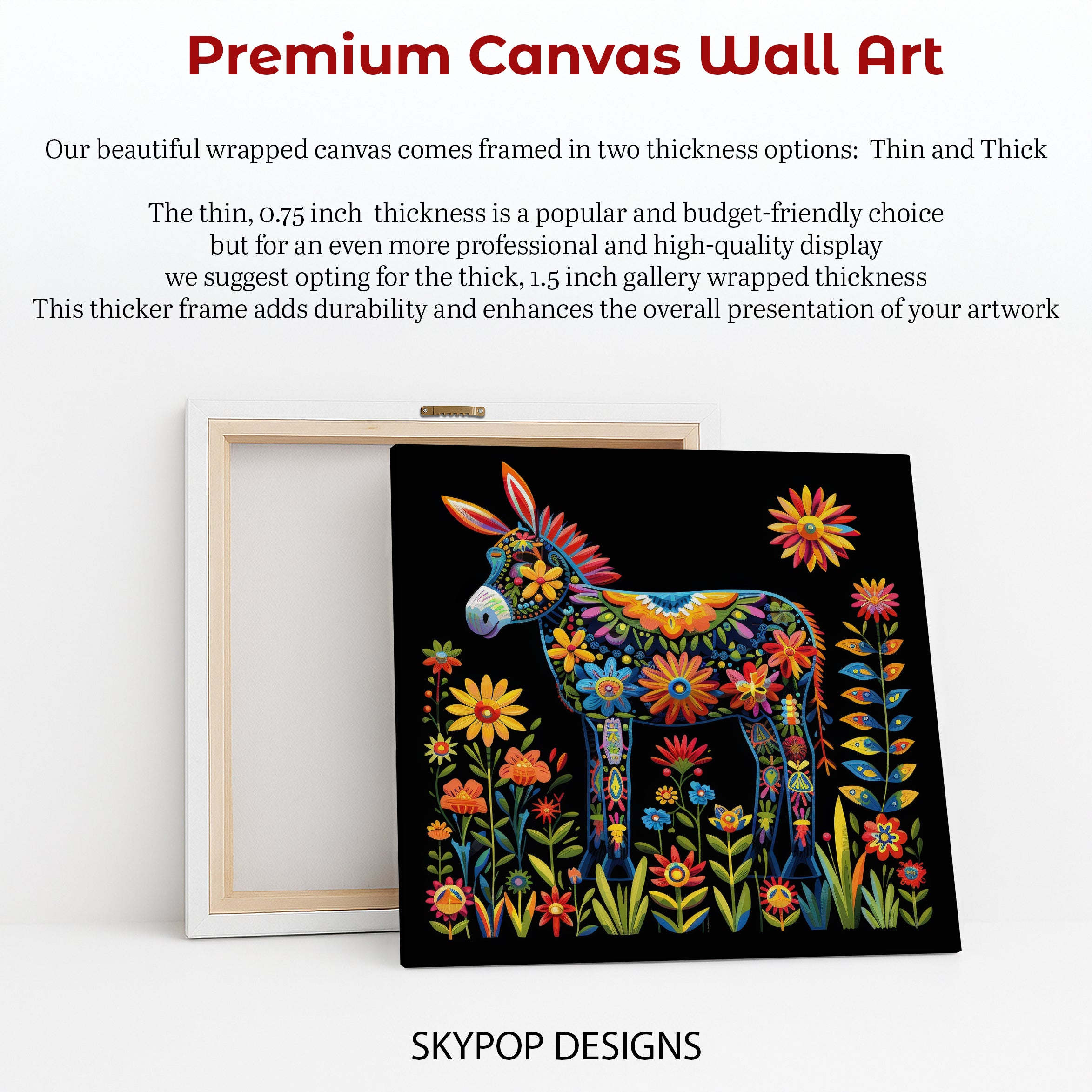 Bring vibrant energy into your home with this captivating donkey canvas wall art featuring a beautifully decorated donkey surrounded by colorful flowers. This unique poster or canvas art piece is perfect for transforming any living room or dining room into a lively and inviting space. The bold, multicolor palette and striking floral motifs create a stunning focal point that celebrates joy and festivity. Ideal for bohemian or eclectic decor styles, this artwork adds a playful yet sophisticated touch to your walls. The intricate details and dynamic composition make this poster a conversation starter, perfect for entryways or as a cheerful addition to your bedroom. This high-quality canvas wall art is printed with exceptional clarity, ensuring the vibrant colors and textures pop. Looking for a unique housewarming gift or a birthday surprise? This piece is an ideal choice that brings cheer and personality. Enhance your home's aesthetic with this eye-catching donkey and flower artwork that combines folk art charm with modern graphic appeal. Elevate your space today with this stunning wall art and celebrate life's colorful moments. It’s more than just decor; it’s a statement of vibrant living.
