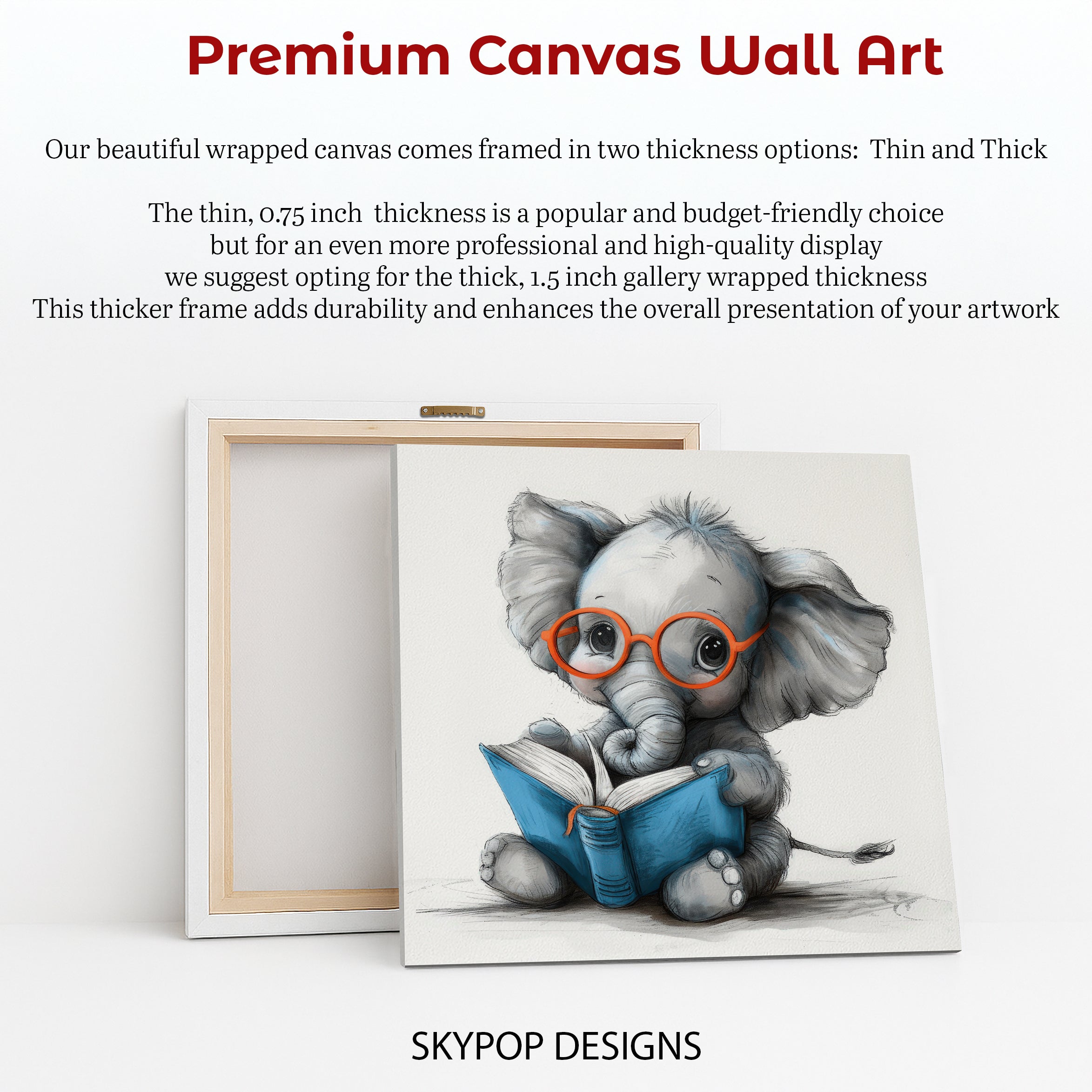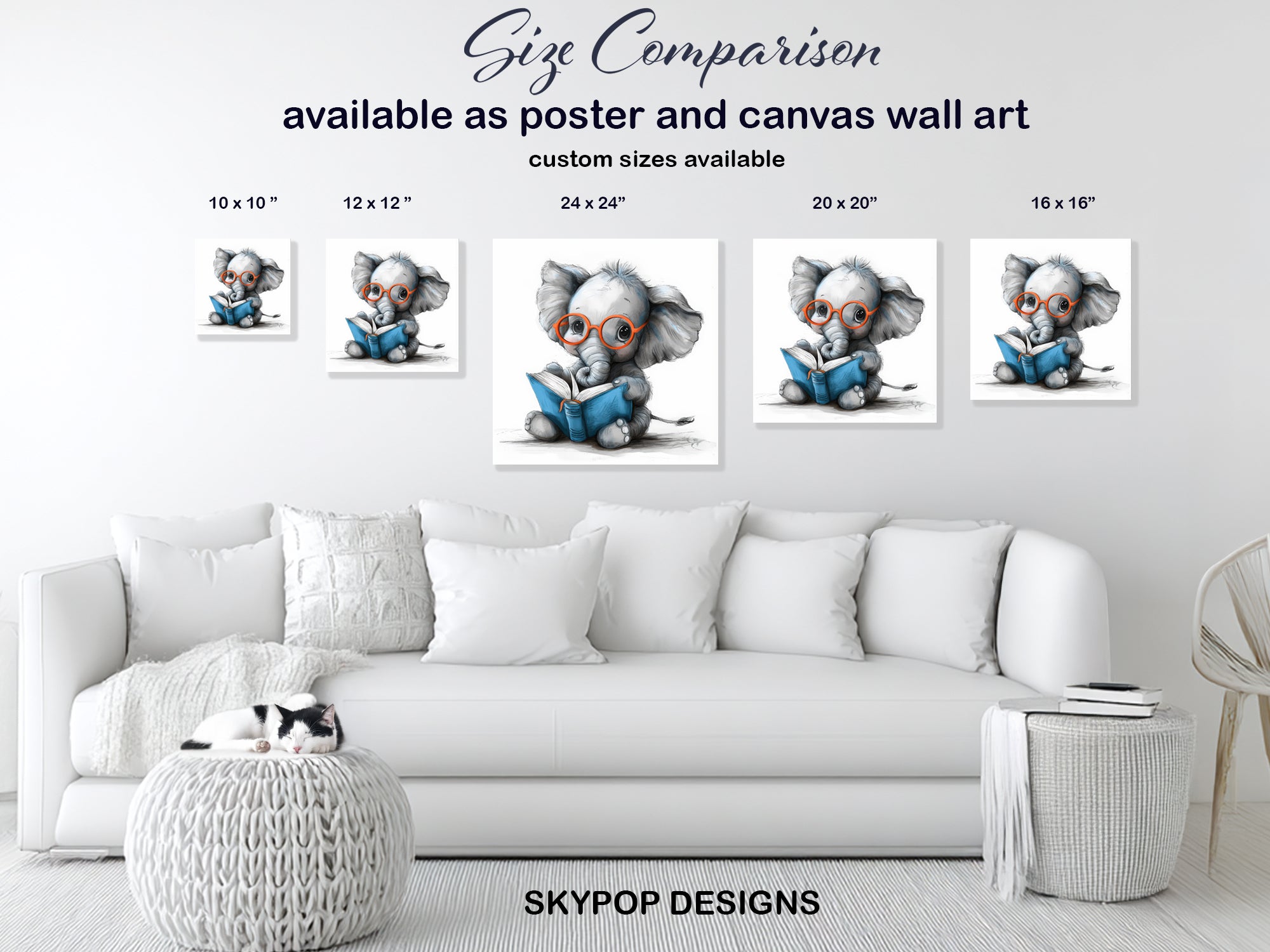 Transform your space with this adorable elephant canvas wall art, featuring a charming elephant engrossed in reading a book. The soft grey tones and vibrant orange glasses create a whimsical and inviting atmosphere, perfect for any room. This captivating poster art is ideal for children's rooms, nurseries, or any space needing a touch of playful sophistication. The combination of vintage sketch style and bright colors makes this elephant wall art a unique statement piece. It's perfect for contemporary, Scandinavian, or farmhouse decor styles, adding personality and warmth. The detailed rendering of the elephant's texture and the bright blue book makes this canvas art a conversation starter. Consider this unique animal art as a thoughtful gift for book lovers, birthdays, or housewarmings. Enhance your living room or bedroom decor with this delightful elephant poster. The playful nature of this artwork inspires imagination and creates a cozy reading nook ambiance. Elevate your wall decor with this charming and high-quality canvas print that brings joy and character to your home. Discover the magic of this sweet elephant reading, a truly unique addition to your art collection.