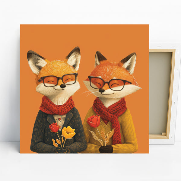 Capture the charm and whimsy with this delightful fox canvas wall art, perfect for adding a playful touch to your home. This enchanting poster features a sophisticated fox couple, complete with spectacles and cozy scarves, holding colorful blooms, creating a heartwarming scene. The artwork's vintage aesthetic and animal art style blend seamlessly with bohemian and farmhouse decor, making it a versatile piece for your living room, bedroom, or entryway. The warm orange backdrop and rich brown and gold accents evoke a sense of cozy autumnal vibes, while the pops of red from the flowers add a vibrant contrast. This unique canvas wall art is also an ideal gift for animal lovers, housewarmings, or any occasion celebrating friendship and love. Its striking detail and textured appearance give it a lifelike quality, transforming any space into a cozy retreat. This versatile artwork complements a variety of interior styles, from modern to traditional, enhancing the ambiance with its cheerful and inviting nature. High-quality print ensures longevity and vibrant colors, making this fox poster a cherished addition to your wall decor collection. Elevate your home decor and showcase your unique style with this captivating fox wall art. Transform your child's room or any space needing a touch of personality with this charming and timeless piece.