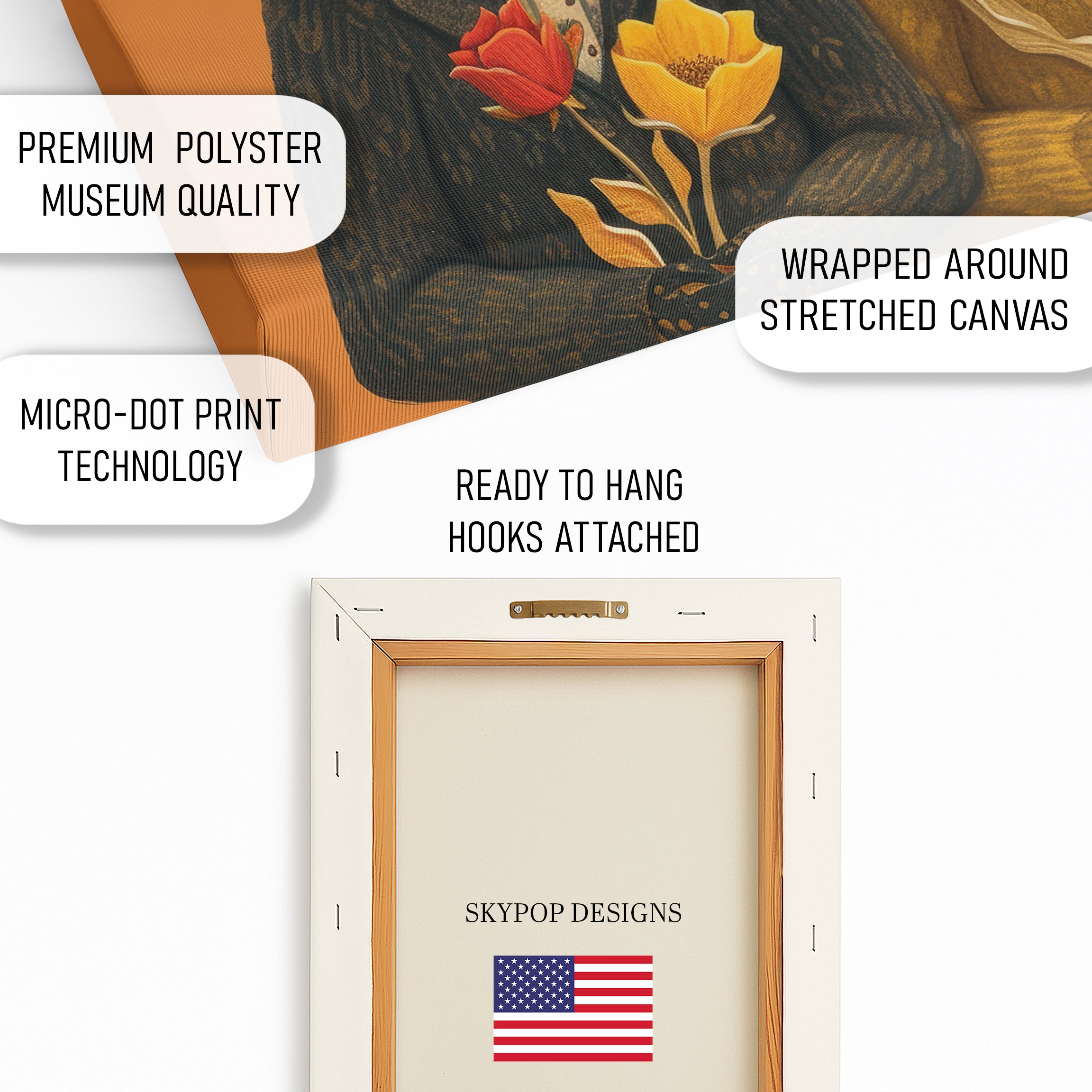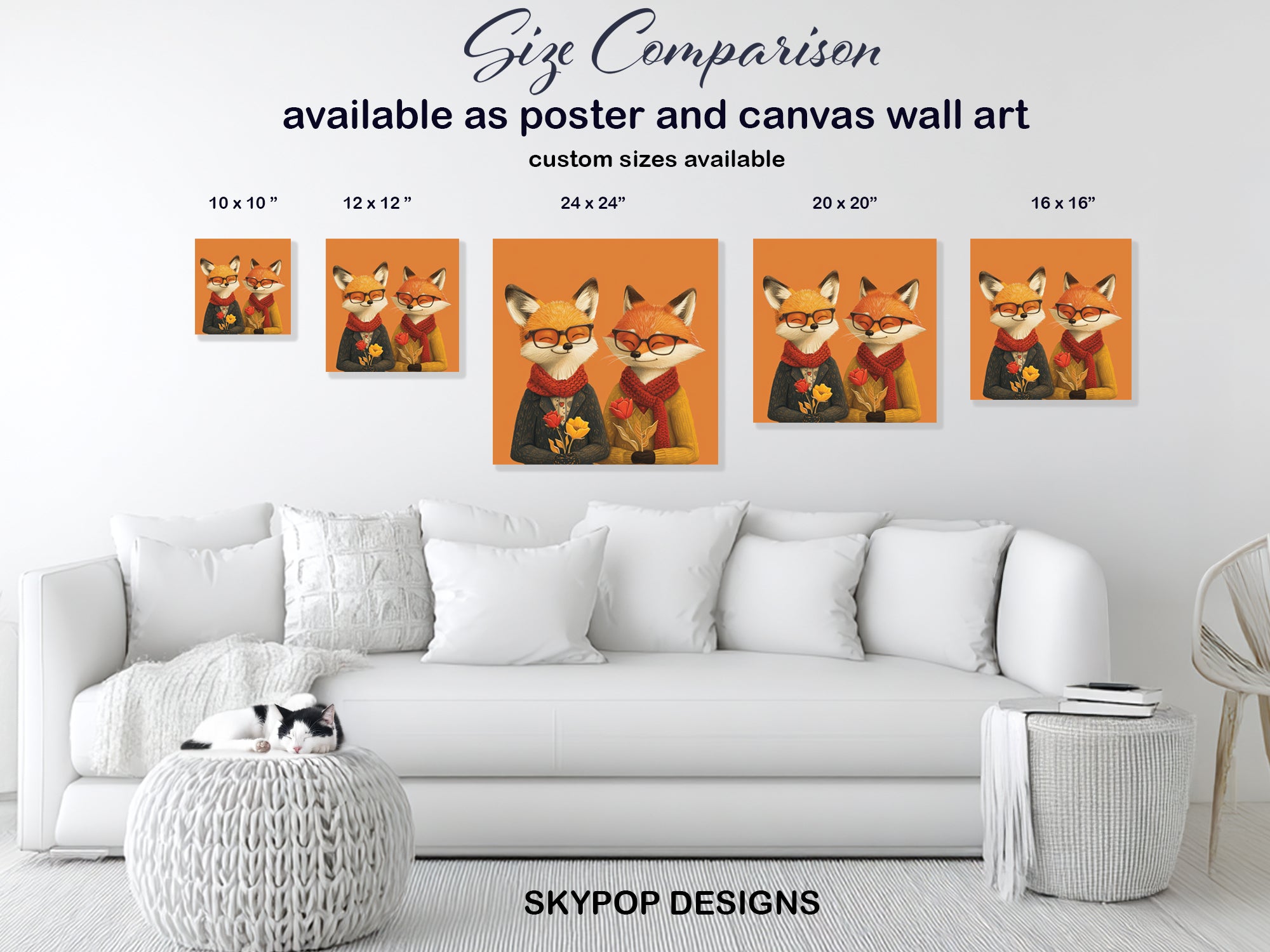 Keywords: Whimsical Wall Art, Animal Art Print, Vintage Poster, Bohemian Decor, Farmhouse Decor, Rustic Home Accents, Living Room Art, Bedroom Wall Art, Entryway Decor, Kids Room Art, Orange Wall Decor, Red Accents, Brown Art, Gold Art, Fox Art, Fox Couple Print, Dapper Fox Art, Spectacle Fox Poster, Cozy Scarf Art, Floral Art Print, Autumnal Vibes, Heartwarming Scene, Unique Wall Decor, Housewarming Gift, Animal Lover Gift, Friendship Gift, Love Gift, Textured Canvas, Colorful Blooms, Modern Traditional Decor