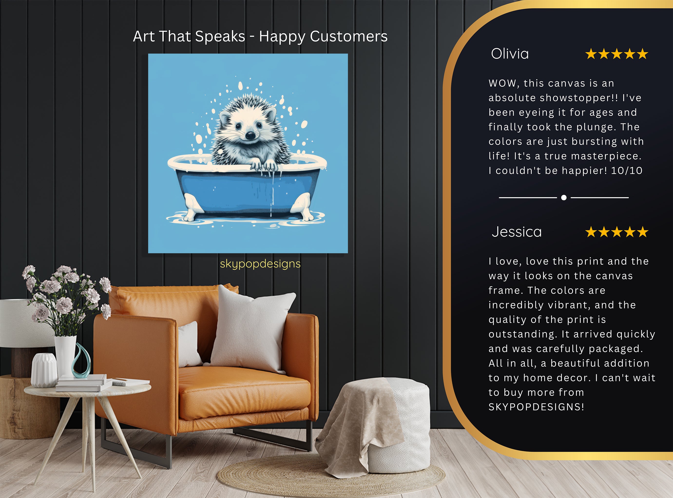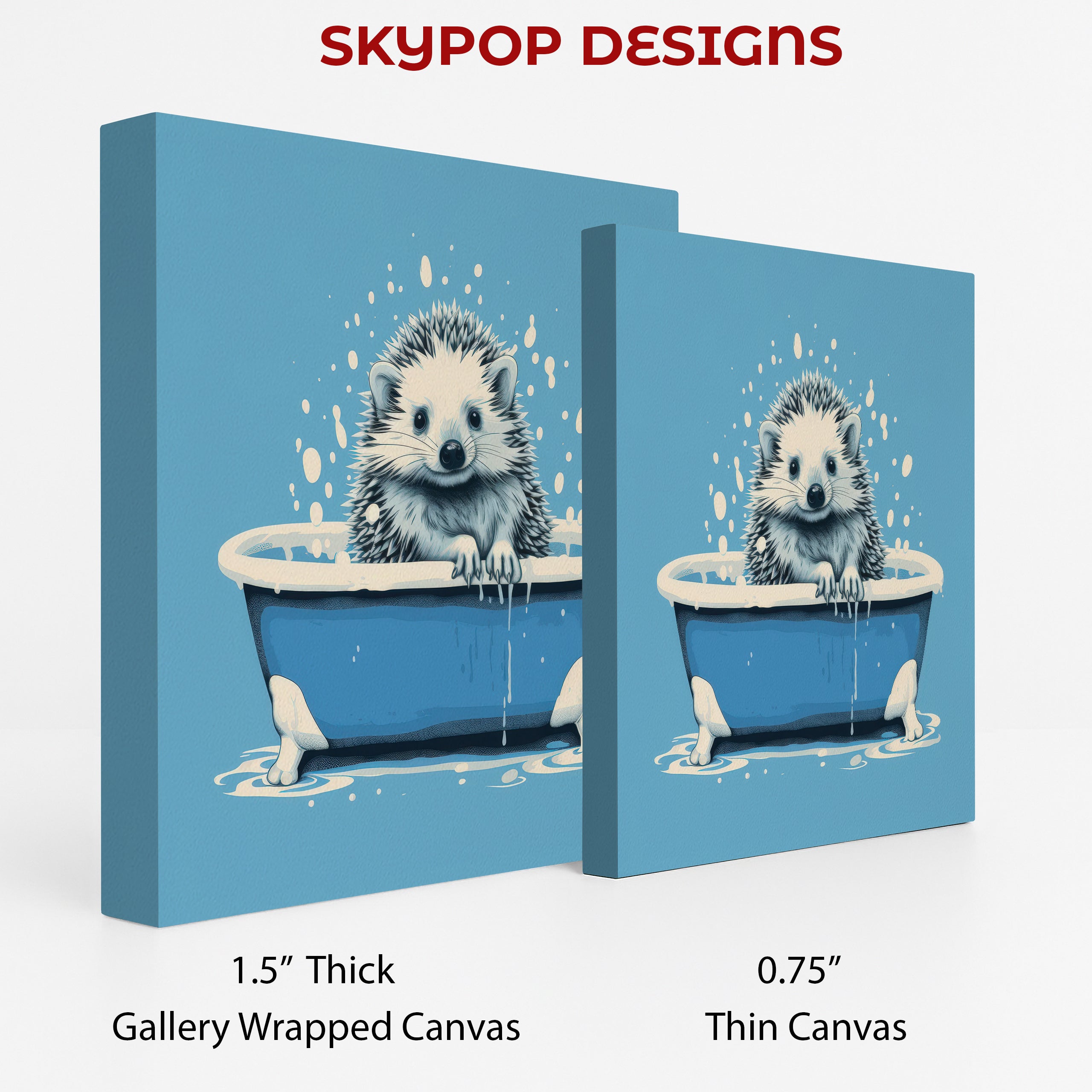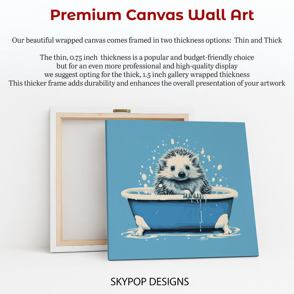 Keywords: Hedgehog art, Bath time art, Canvas wall art, Animal art, Whimsical art, Modern decor, Farmhouse decor, Bohemian decor, Bathroom art, Children's room decor, Bedroom decor, Living room art, Blue art, White art, Grey art, Black art, Hedgehog poster, Cute animal print, Home decor, Wall decor, Nursery art, Kids room art, Animal prints, Artistic flair, Unique wall decor, Gift for animal lover, Relaxation art, Playful art, Serene aesthetic, Contemporary art