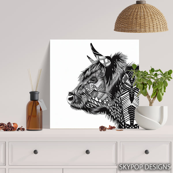 Highland Cow Art, Canvas or Poster, Geometric Ethnic Modern Farmhouse Decor, Living Room Bedroom Office Entryway Wall Art, Black and White