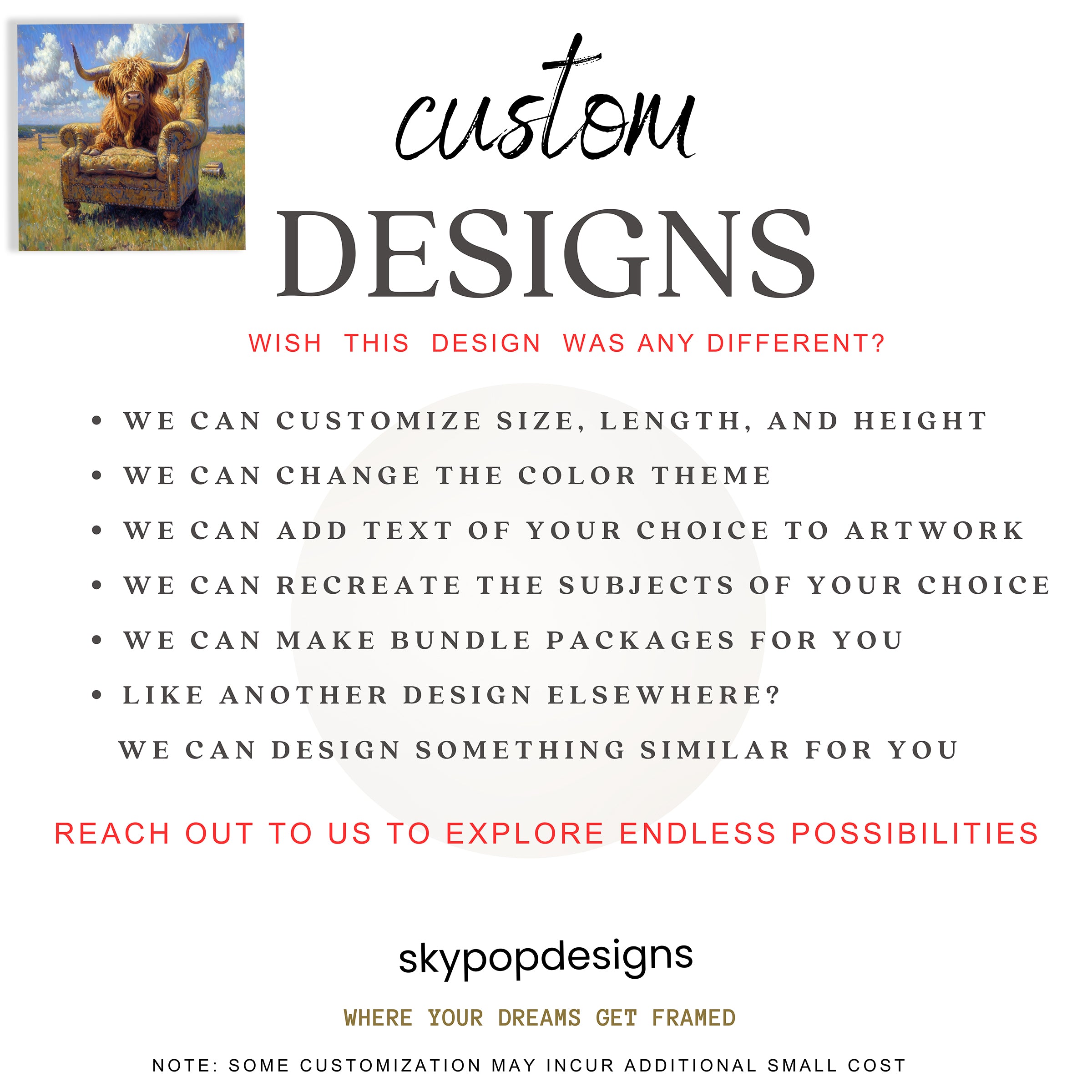 Keywords: Highland Cow Art, Canvas Wall Art, Animal Art, Nature Art, Whimsical Art, Rustic Decor, Farmhouse Decor, Bohemian Decor, Living Room Art, Bedroom Art, Entryway Decor, Office Wall Art, Brown Art, Multicolor Art, Yellow Art, Blue Sky Art, Shaggy Cow Art, Ornate Chair Art, Textured Brushstrokes, Joyful Art, Tranquil Art, Calm Art, Contentment Art, Natural Beauty Art, Imaginative Artistry, Playful Sophistication, Cozy Retreat, Housewarming Gift, Birthday Gift, Home Decor