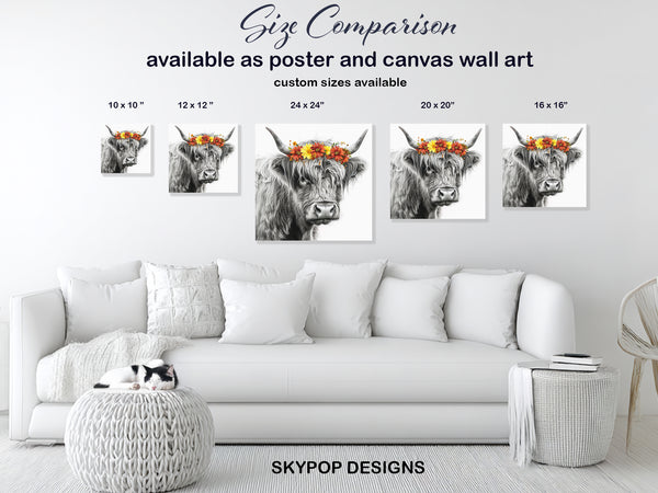 Highland Cow Floral Crown Art, Poster or Canvas, Whimsical Farmhouse Decor, Living Room Bedroom Hallway Art, Brown Yellow Orange Multicolor