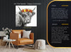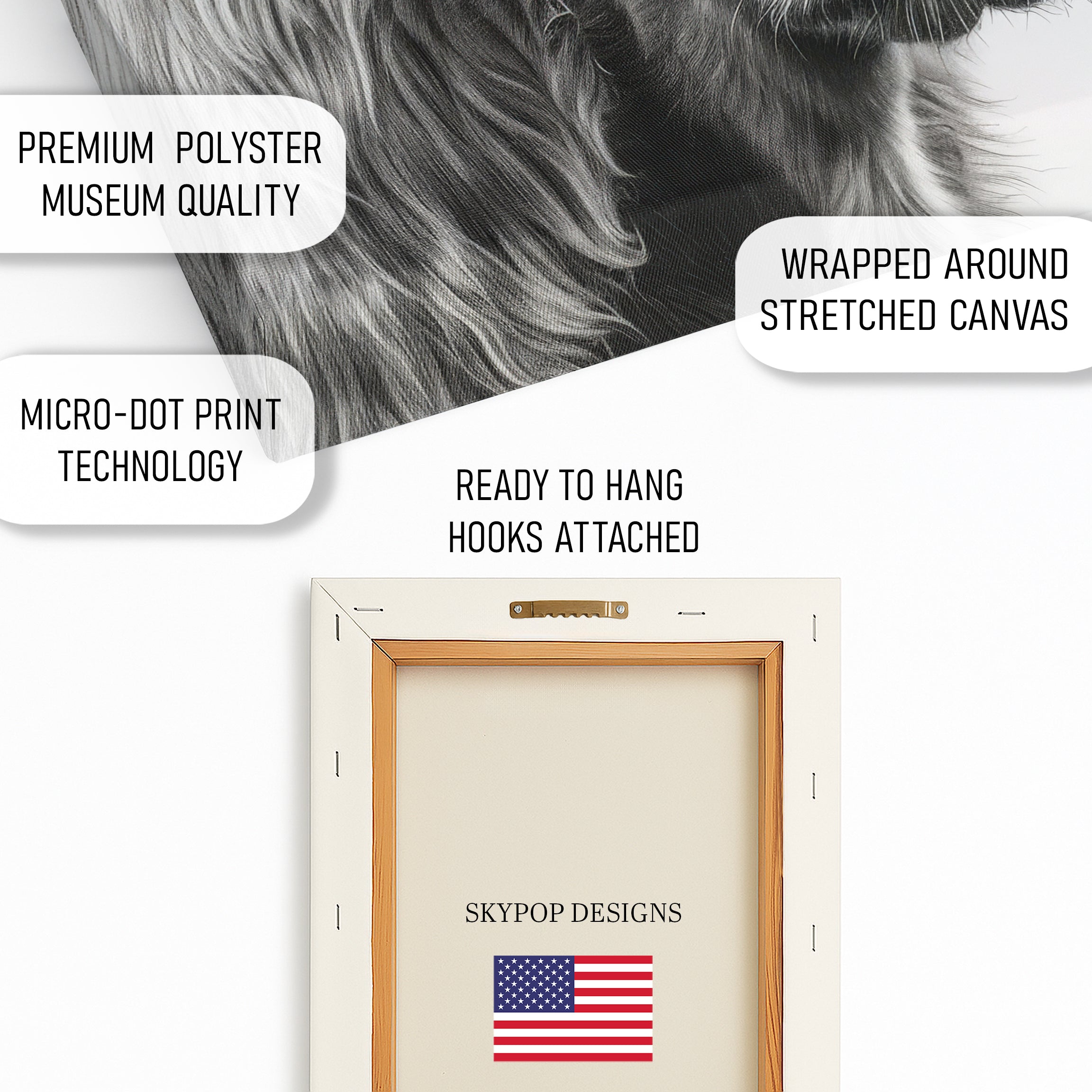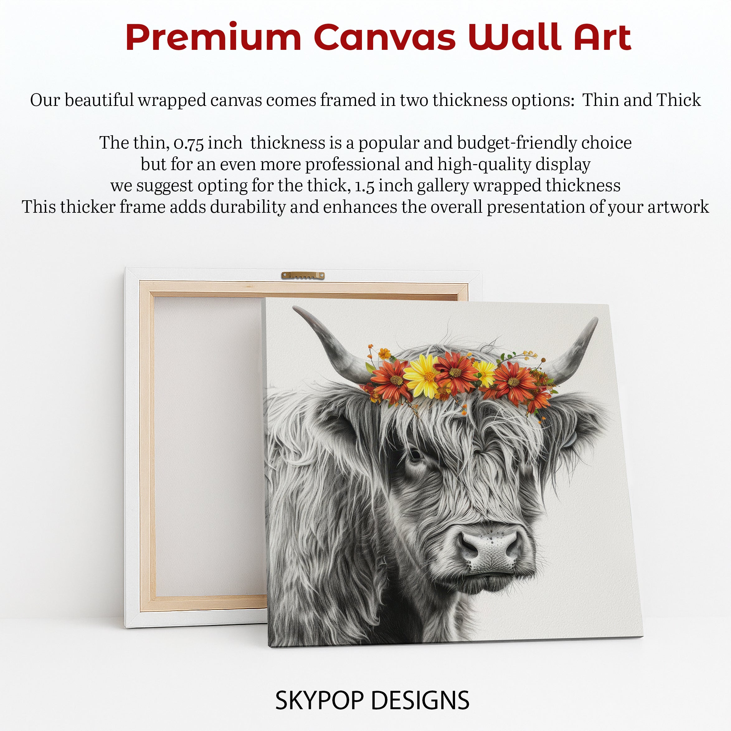 Elevate your space with this stunning Highland Cow canvas wall art, featuring a beautiful cow adorned with a vibrant floral crown. This captivating piece of animal art transforms any room with its striking detail and charming aesthetic. Printed on high-quality canvas, this artwork is perfect for creating a focal point in your living room, bedroom, or dining room. The blend of natural elements and the iconic Highland cow makes this poster a favorite for farmhouse and bohemian decor styles. The rich colors of the flowers-oranges, yellows, and reds-pop against the black and white rendering of the cow, evoking a sense of warmth and joy. This versatile wall art is ideal for any space needing a touch of rustic charm and natural beauty. It's a wonderful gift for cow lovers, nature enthusiasts, or anyone looking to add personality to their home decor for housewarmings or birthdays. The intricate textures in the cow's fur and the delicate details of the floral arrangement showcase exceptional craftsmanship, making this canvas wall art a true masterpiece. Whether you're aiming for a cozy farmhouse vibe or a free-spirited bohemian look, this eye-catching poster enhances your wall decor. Bring the outdoors in and inspire smiles with this unique blend of animal art and nature-inspired design. Transform your home's atmosphere with this captivating Highland Cow artwork today.