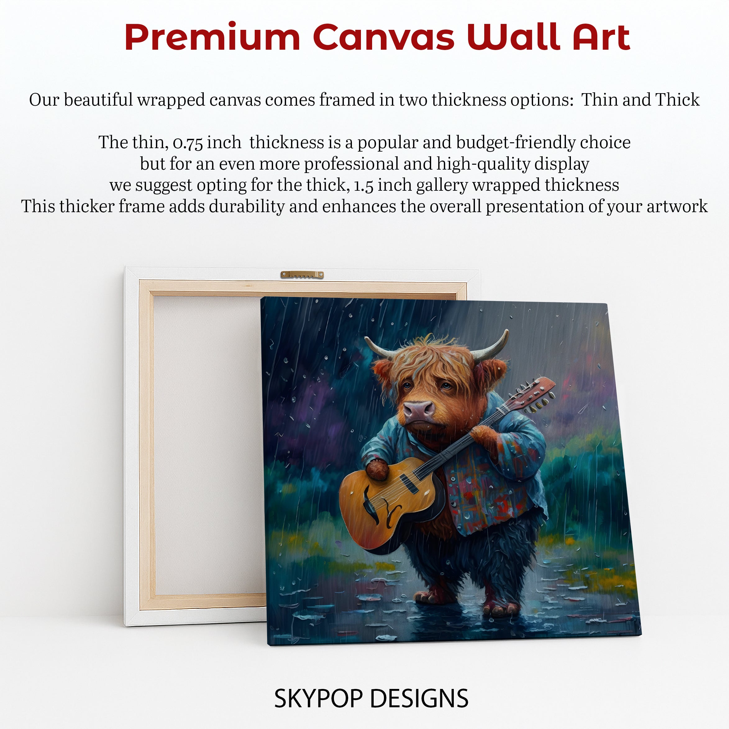 Keywords: Highland Cow Art, Canvas Wall Art, Animal Print, Whimsical Art, Contemporary Art, Bohemian Decor, Modern Decor, Farmhouse Decor, Living Room Art, Bedroom Art, Kids Room Art, Game Room Decor, Blue Art, Multicolor Art, Brown Art, Black Art, Rainy Day Art, Guitarist Art, Music Lover Gift, Animal Lover Gift, Birthday Gift, Housewarming Gift, Unique Wall Art, Wall Decor, Home Decor, Cozy Art, Inviting Ambiance, Expressive Art, Painterly Details, Quirky Charm