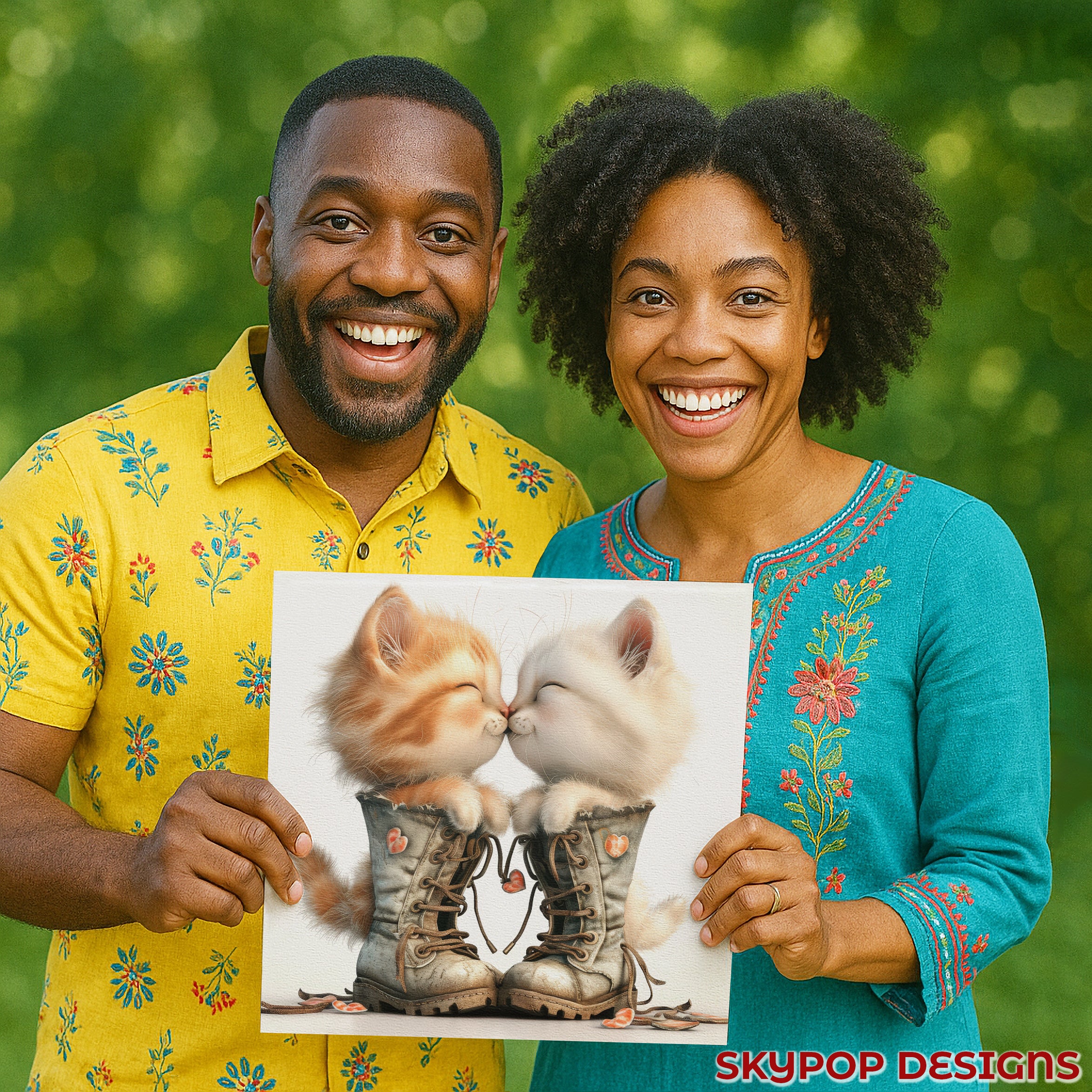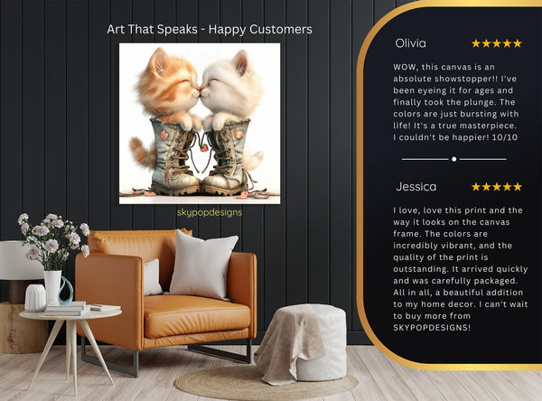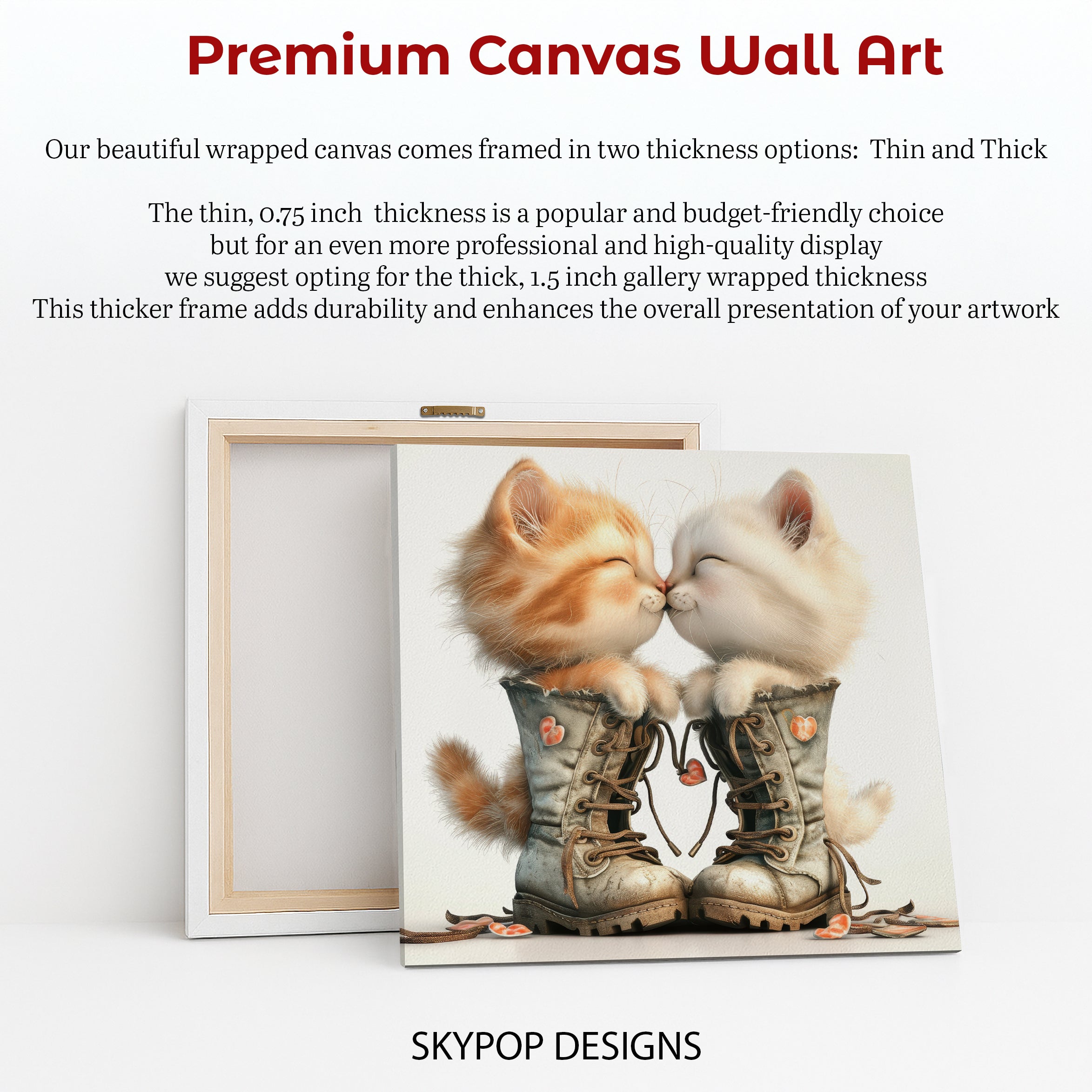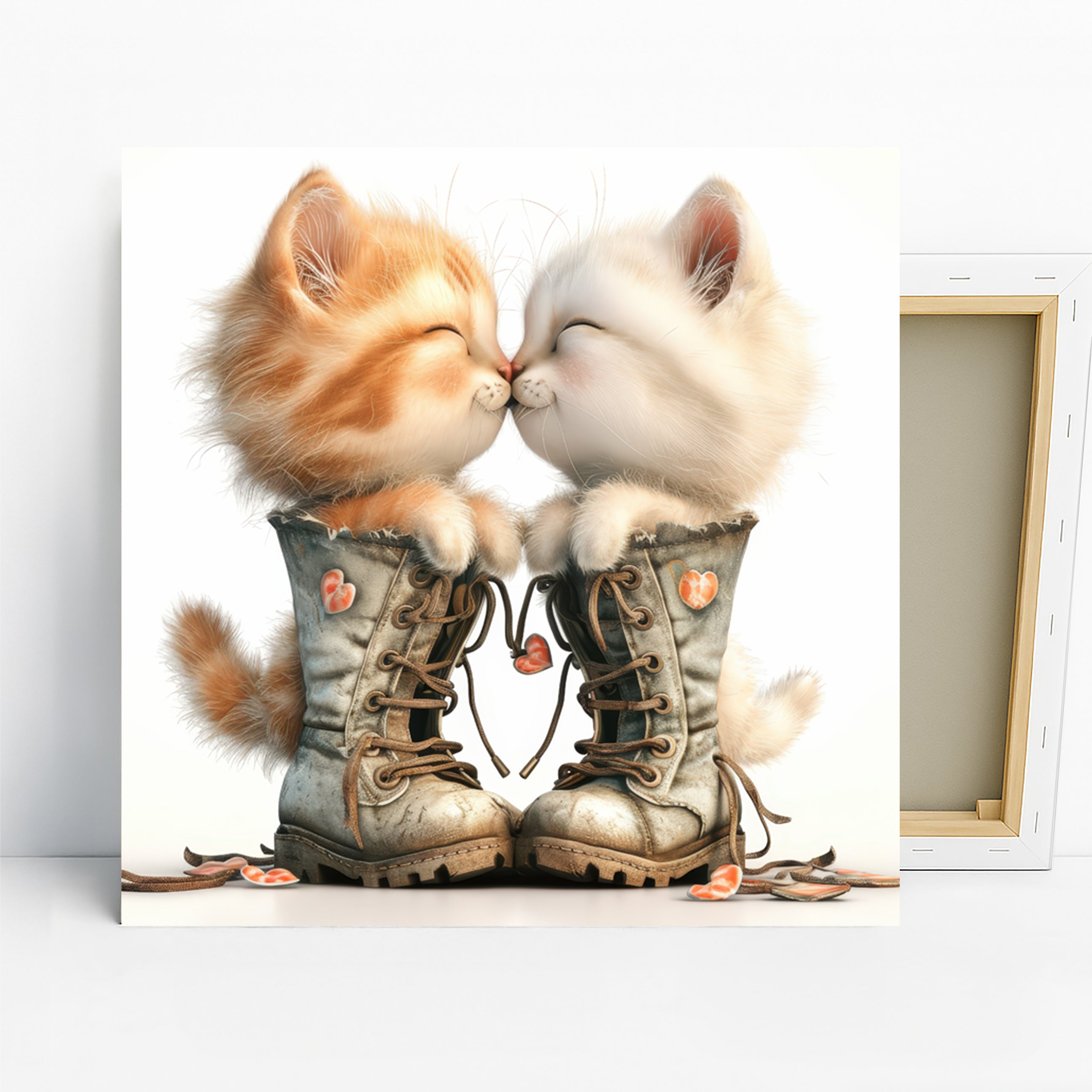 Capture the most heartwarming moments with this adorable kitten canvas wall art, featuring two sweet kittens sharing a tender kiss inside cozy boots. This captivating poster art transforms any room into a sanctuary of warmth and affection. The charming depiction of these fluffy companions, nestled in rustic boots adorned with sweet heart details, evokes a sense of pure joy and companionship. Perfect for adding a touch of whimsical magic to your contemporary living room or a cozy farmhouse bedroom, this versatile wall art enhances any decor style. The soft, loving colors and the endearing subject matter make this a truly unique piece that will inspire smiles and foster a feeling of love and comfort. Ideal as a delightful housewarming gift or a special present for any cat lover, this canvas wall art is sure to be cherished. It's not just wall decor; it's a celebration of simple pleasures and undeniable cuteness, making it a perfect addition to a child's room or a serene nursery. Enhance your home with this stunning piece of animal art that radiates positivity and sweet sentimentality. Elevate your living space with this charming kitten artwork today, bringing a touch of playful charm and heartfelt connection to your walls. This high-quality canvas print ensures the intricate details of the kittens' fur and the rustic texture of the boots are beautifully rendered for lasting enjoyment.