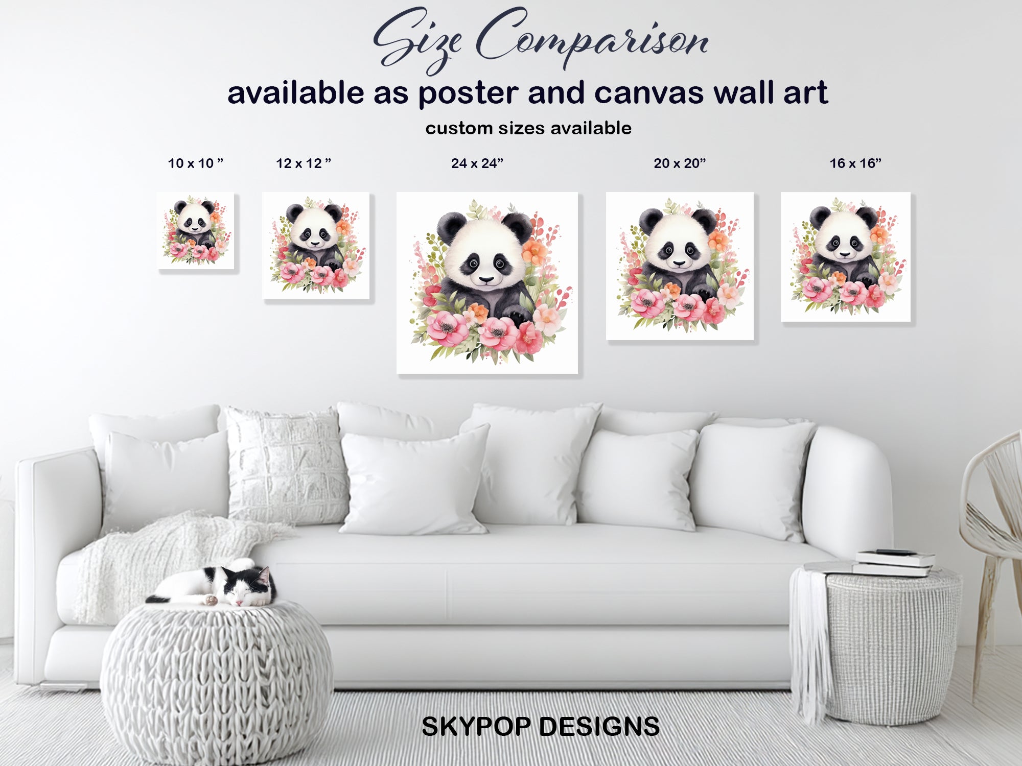 Transform your home with this charming panda canvas wall art, showcasing a sweet panda nestled amongst vibrant floral blooms. This delightful piece of animal art brings a touch of whimsical charm and natural beauty to any living space. The soft watercolor style and delicate color palette of pinks, greens, and touches of orange create a calming and joyful atmosphere. Perfect for a living room, cozy bedroom, or a cheerful children's room or nursery, this panda poster adds a pop of personality to your walls. It's an ideal addition to bohemian, farmhouse, or Scandinavian decor styles, easily enhancing your existing design. The detailed watercolor technique captures the gentle nature of the panda and the delicate details of the flowers, making this canvas wall art a captivating focal point. This versatile piece also makes a wonderful gift for baby showers, birthdays, or housewarmings. Our high-quality canvas prints ensure that the vibrant colors and intricate details are beautifully preserved. Elevate your home decor with this heartwarming panda artwork that brings a sense of peace and happiness. Add this unique wall art to your collection and create a welcoming, stylish sanctuary. This eye-catching canvas art is perfect for anyone who loves cute animals and floral designs. Bring the beauty of nature indoors with this stunning panda and flowers poster.