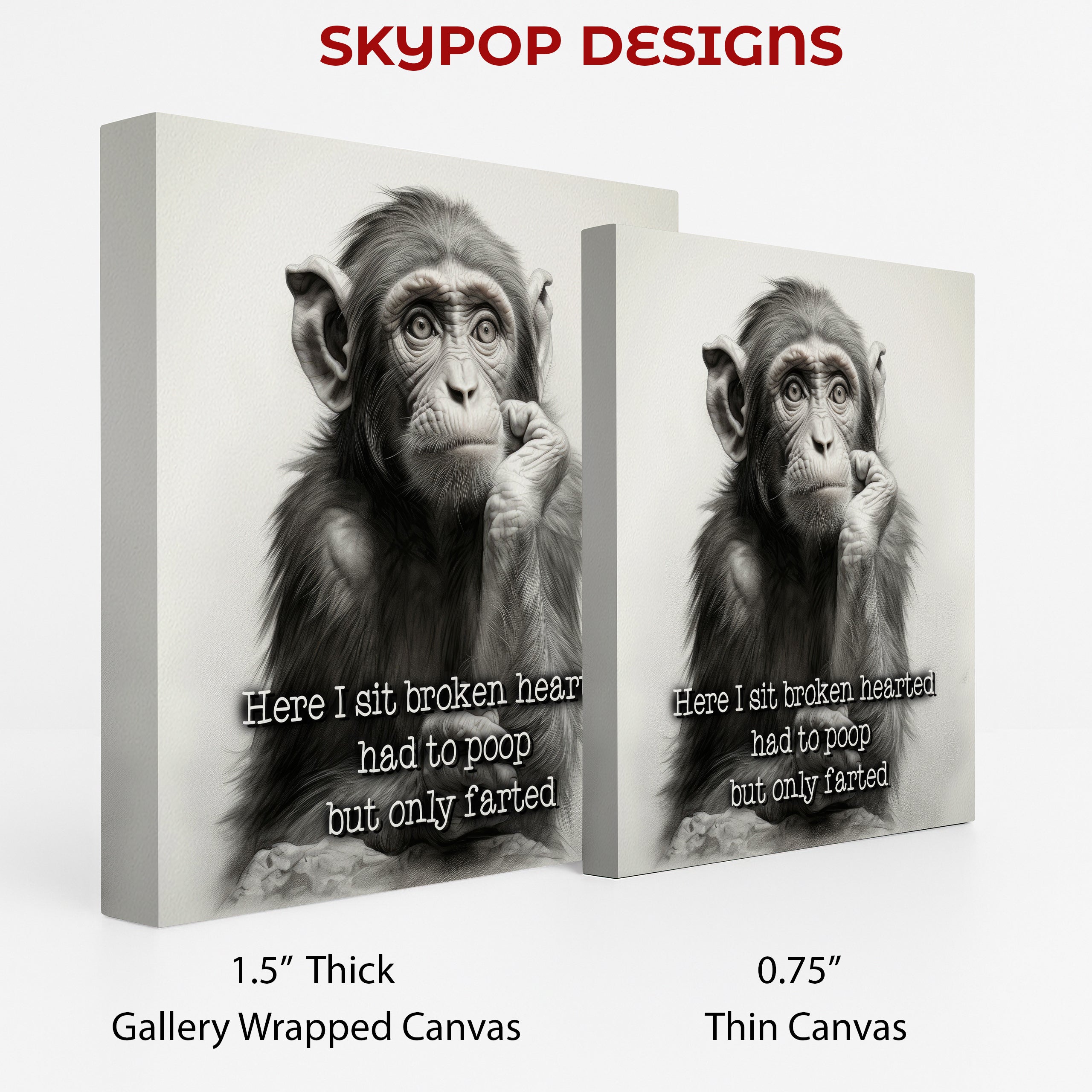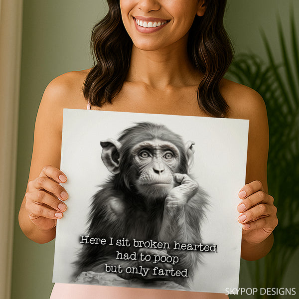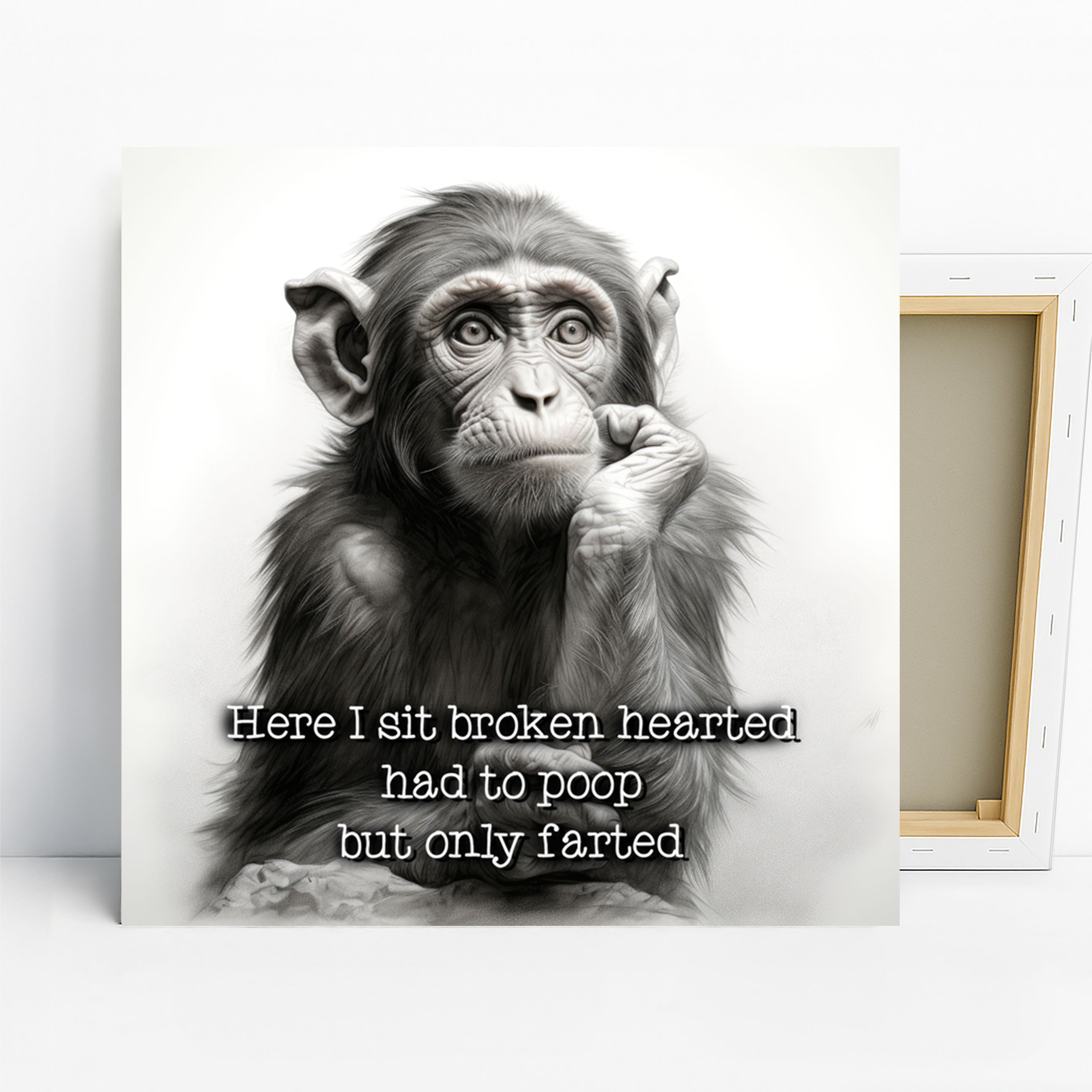 Keywords: Chimpanzee art, funny animal art, canvas wall art, black and white art, modern decor, contemporary art, bohemian decor, whimsical art, figurative art, animal print, living room art, bedroom decor, office wall art, game room decor, humorous art, unique wall decor, thoughtful chimpanzee, relatable quote art, monochromatic art, sketch style art, home decoration, wall poster, gift idea, birthday gift, housewarming gift, art collection, joy art, expressive art, primate art, funny gift