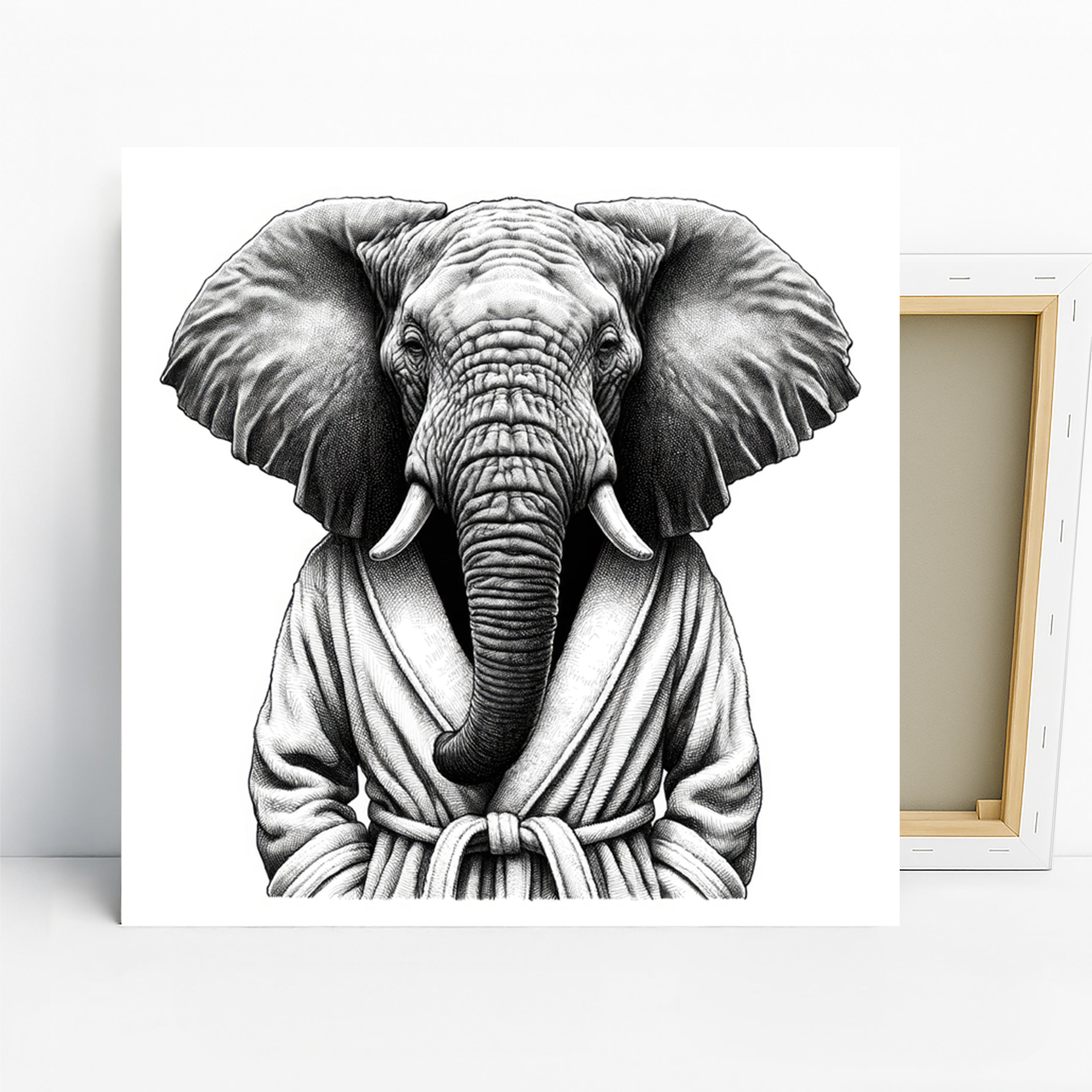 Discover this striking elephant canvas wall art that brings a touch of sophisticated whimsy to your home. The detailed black and white illustration showcases a dapper elephant dressed in a robe, offering a unique conversation starter. This captivating poster or canvas wall art combines animal art with a modern aesthetic, making it a perfect addition to contemporary living rooms or a stylish office space. The monochromatic palette evokes a sense of timeless elegance and can enhance the mood of any room, promoting calm and focus. This versatile artwork is ideal for those seeking to elevate their modern home decor with a distinct artistic statement. It's also a fantastic gift for animal lovers, art enthusiasts, or for housewarming celebrations, adding personality and charm to any wall. The intricate linework and shading on this elephant print showcase high-quality craftsmanship, ensuring a stunning visual impact. Whether you're looking to transform your bedroom into a sophisticated retreat or enhance your entryway with a bold piece, this canvas wall art delivers. Celebrate unique design and express your individual style with this memorable elephant poster. Make this captivating artwork the focal point of your decor and transform your space today.