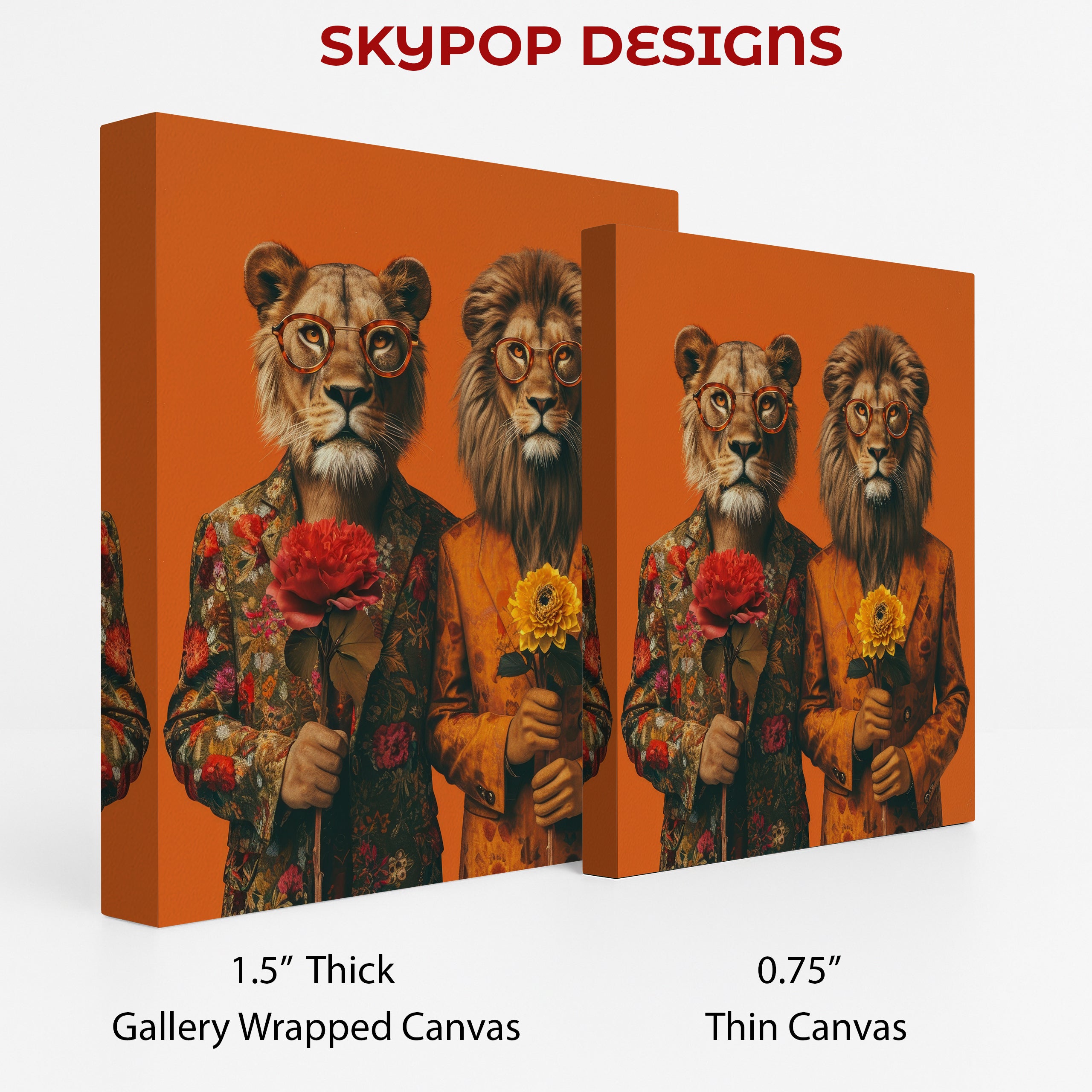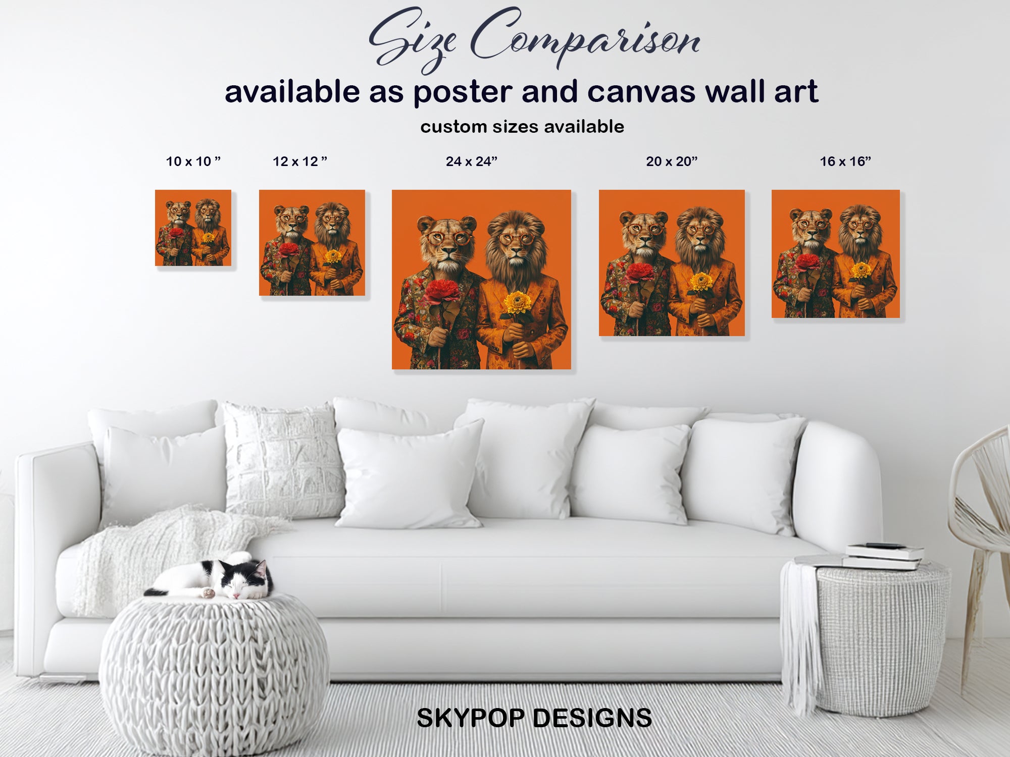Transform your space with this striking lion canvas wall art featuring a regal male and female lion styled in fashionable outfits. This unique poster showcases anthropomorphic animals with a modern twist, perfect for adding personality to your living room, bedroom, or office. The vibrant multicolor jackets and elegant floral accents evoke a bohemian and glam decor style, creating a captivating focal point. The contrasting orange background and the rich details of the lions’ appearances make this canvas wall art a truly eye-catching piece. This artwork is ideal for those who appreciate contemporary animal art and want to elevate their home decor with a touch of sophistication and whimsy. It's a great gift for art lovers or anyone celebrating a birthday or housewarming. The high-quality printing ensures the intricate patterns and textures of the lions' attire are beautifully captured, making this poster a standout addition to any collection. Enhance your interior design with this stunning canvas wall art that inspires conversation and admiration. Add a touch of daring elegance and natural beauty to your home today with this exceptional lion wall art.