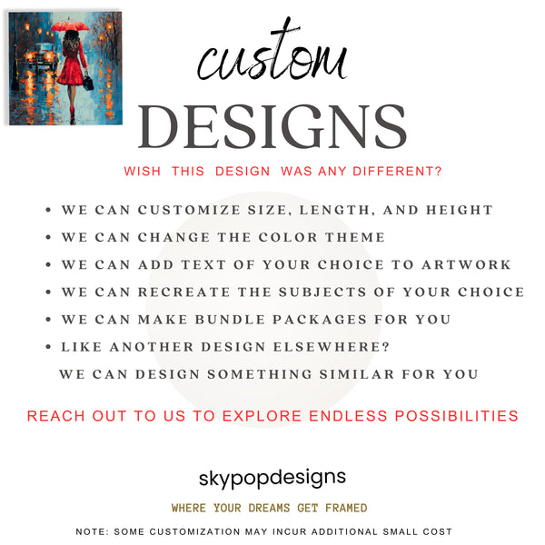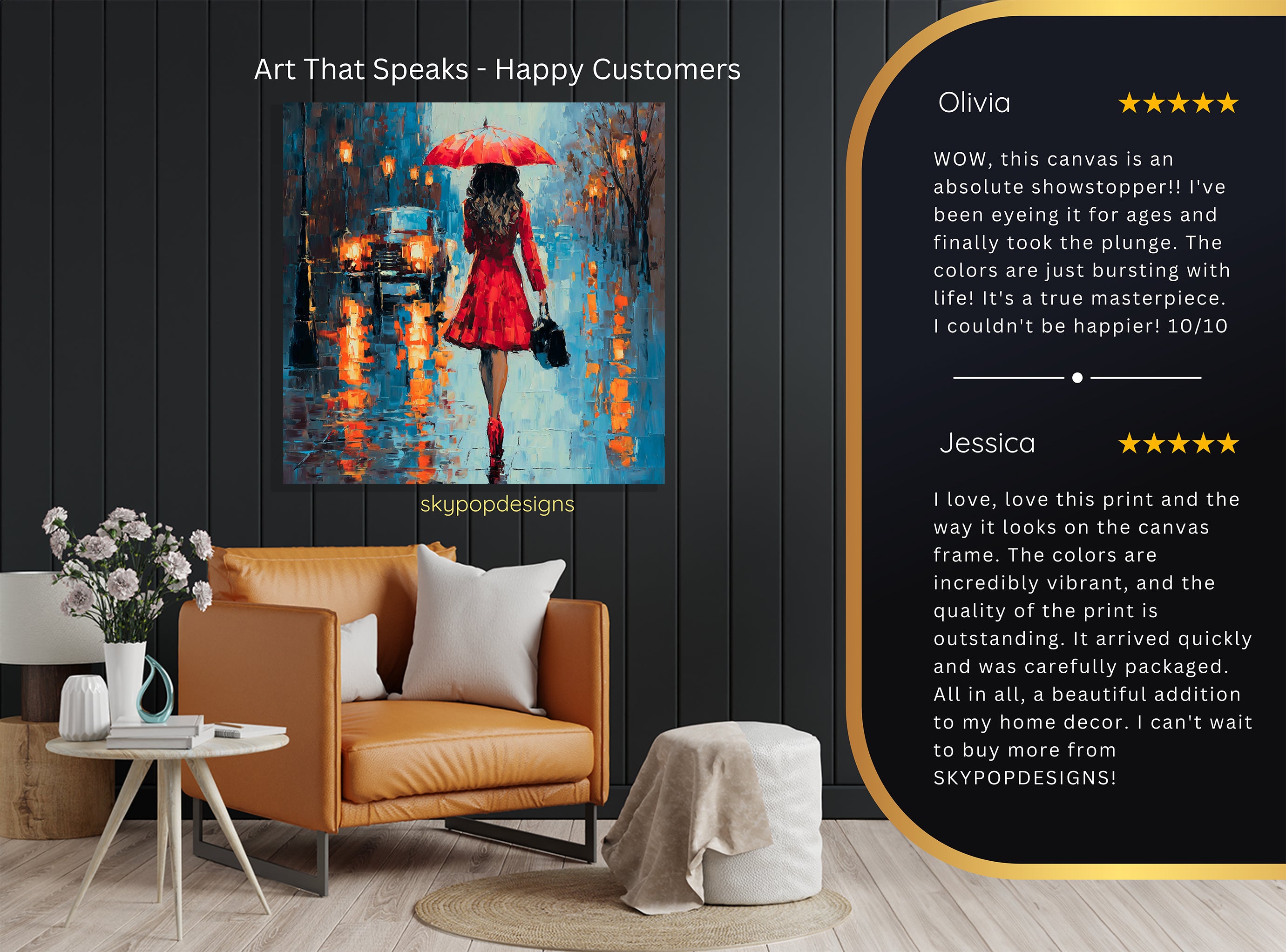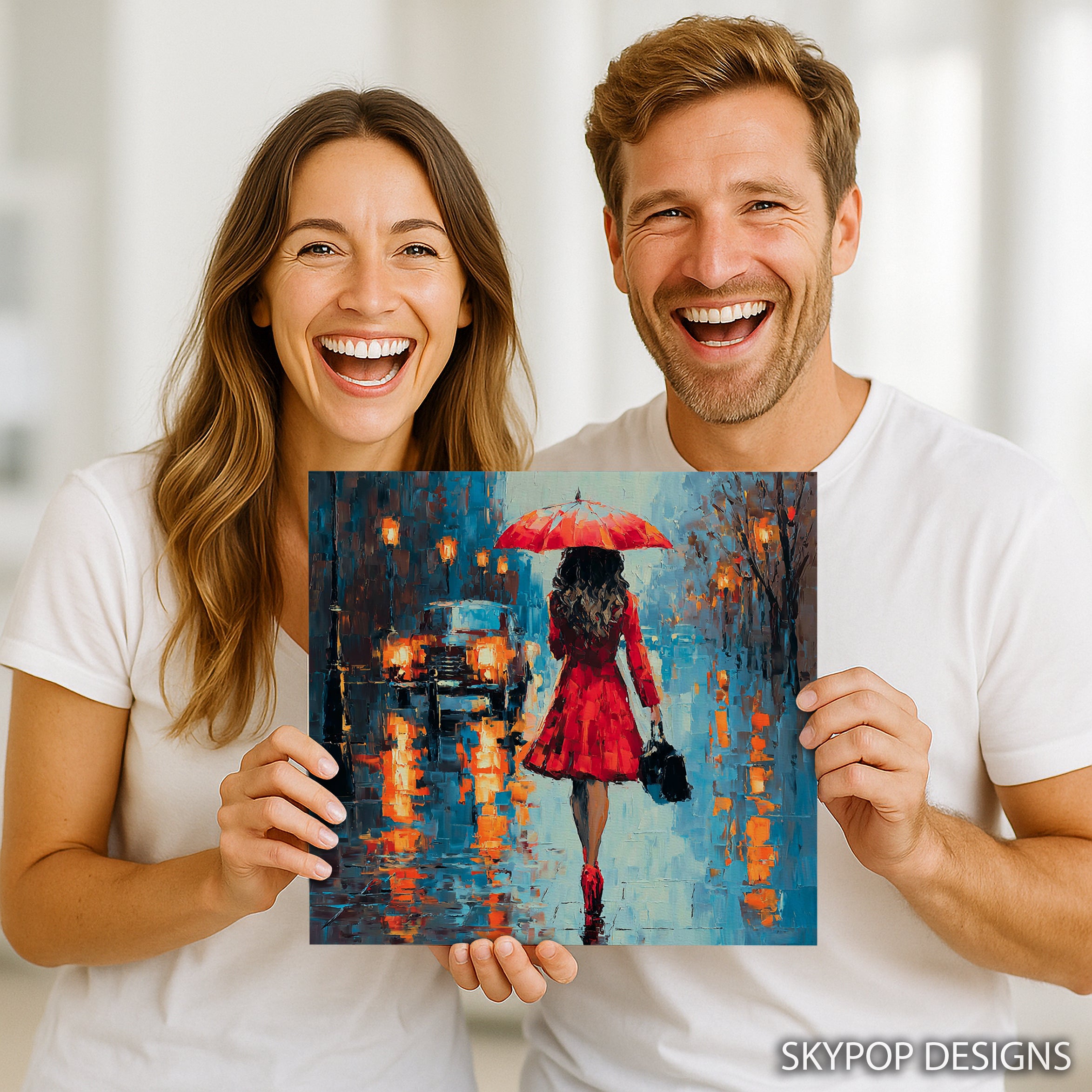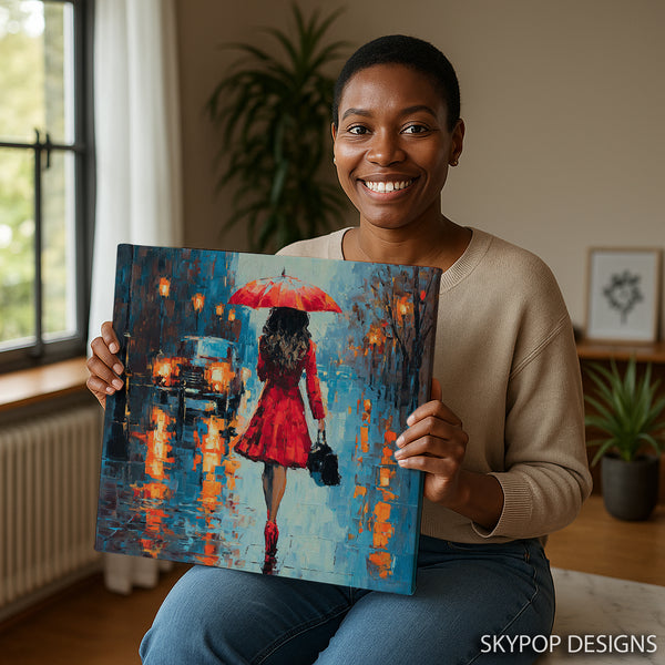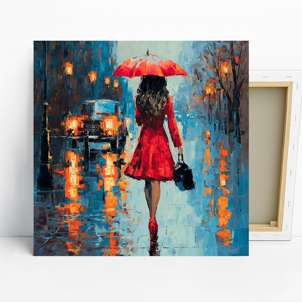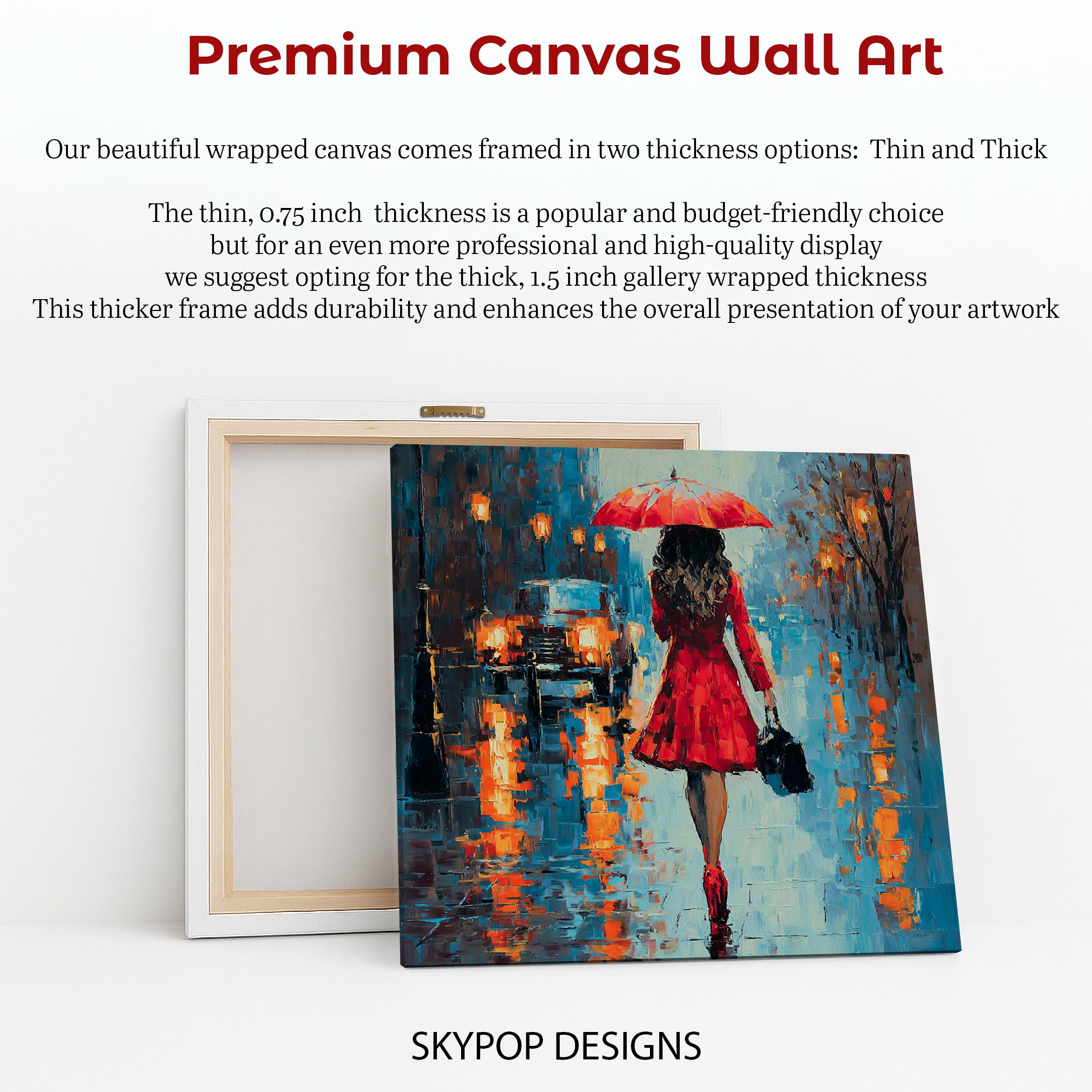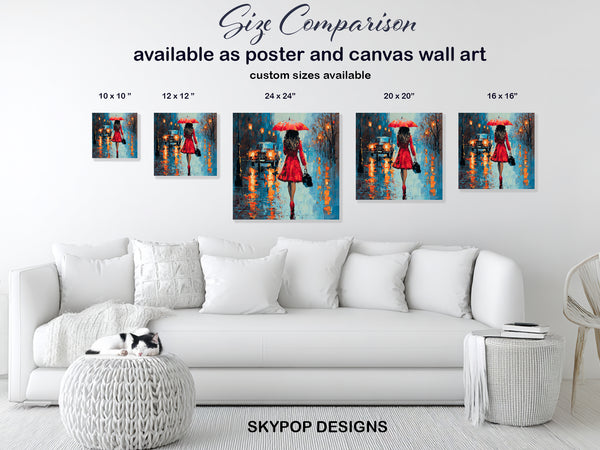 Keywords: Impressionism wall art, Figurative canvas, Contemporary art print, Modern decor, Glam art, Living room art, Bedroom decor, Entryway art, Rainy city art, Cityscape painting, Red dress art, Woman with umbrella, Urban romance, Atmospheric art, Bold brushstrokes, Vibrant colors, Red blue orange art, Glowing city lights, Wet street art, Wall art poster, Canvas wall art, Home decor accent, Interior design inspiration, Wall art gift, Unique home decor, Dramatic lighting art, Elegant wall art, Modern interior art, Urban art print, Sophisticated home decor