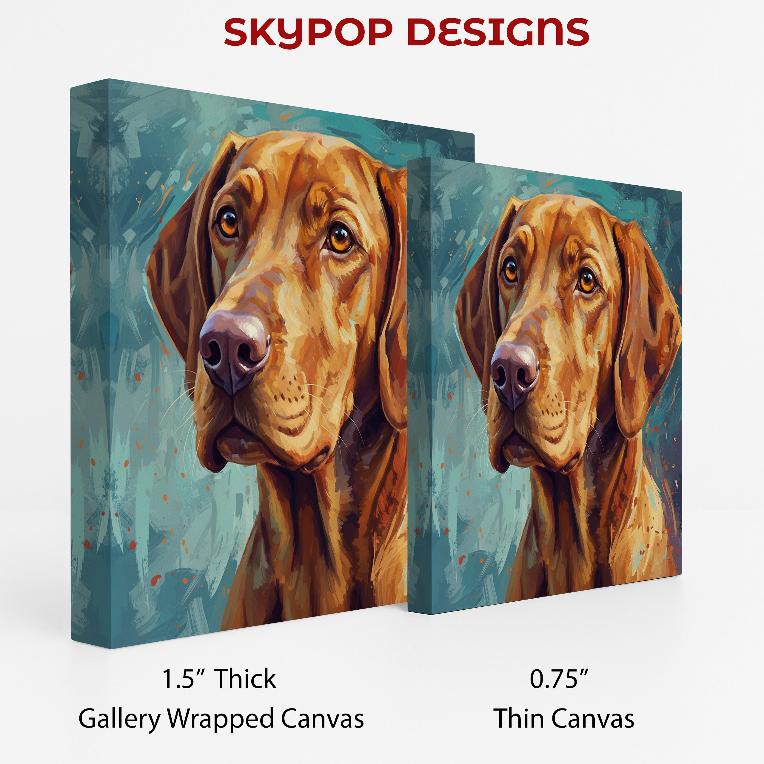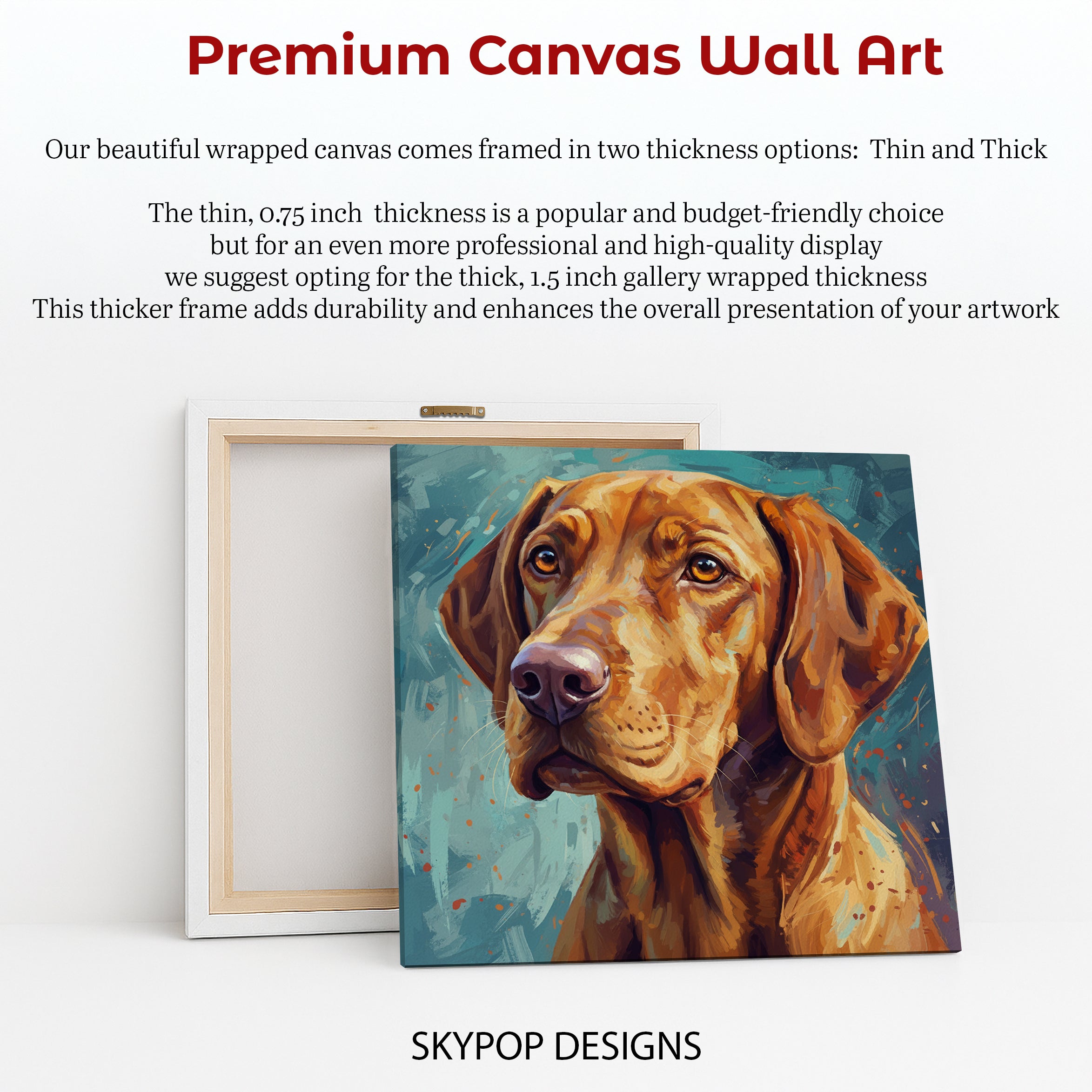 Keywords: Vizsla canvas art, dog portrait canvas, animal wall art, modern home decor, contemporary art, minimalist decor, living room art, bedroom wall art, office decor, entryway art, brown teal orange art, multicolor dog art, Vizsla poster, fine art print, abstract dog art, figurative art, pet portrait canvas, housewarming gift, gift for dog lovers, unique wall art, home interior design, colorful wall art, artistic dog breed, Vizsla owner gift, sophisticated decor, vibrant wall art, quality canvas print, emotional connection art, human-animal bond, dog breed art