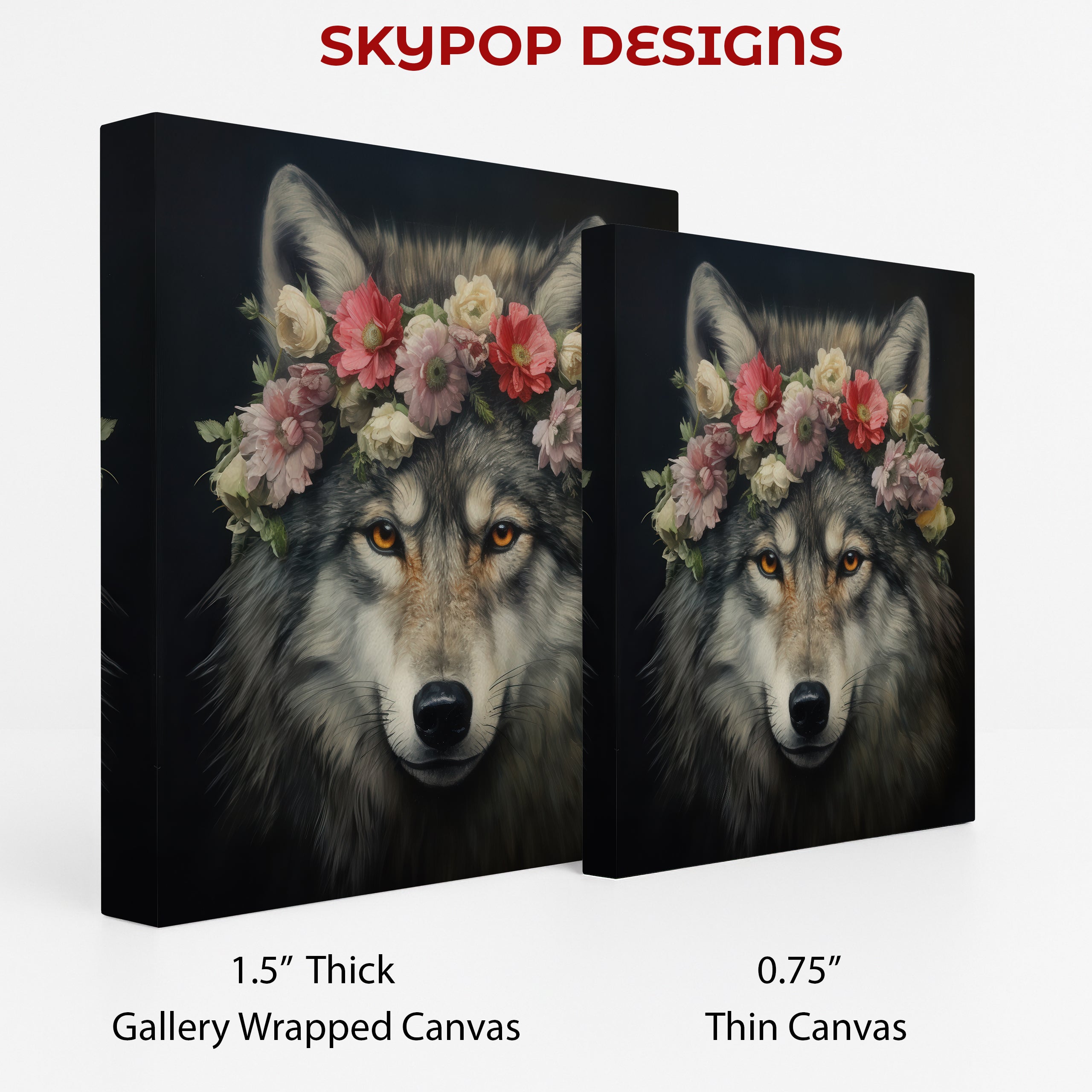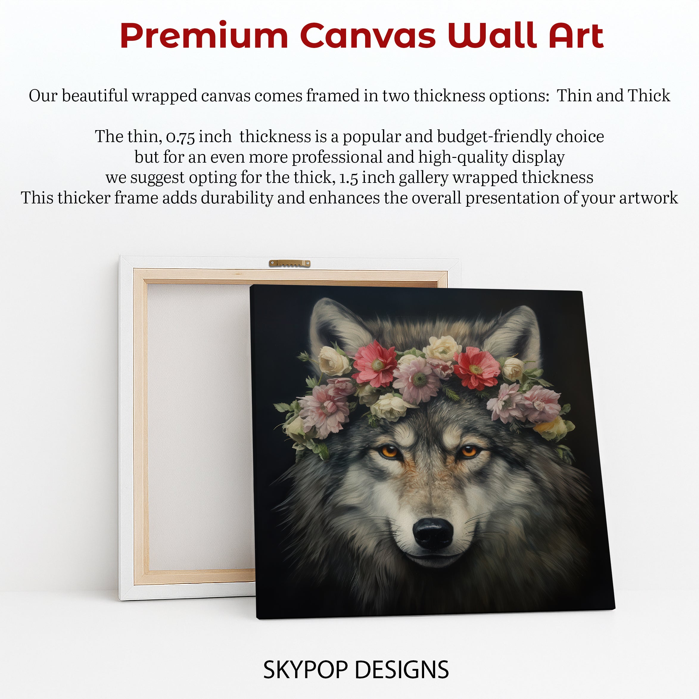 Keywords: wolf canvas art, animal wall art, nature art, floral art, wolf with flower crown, rustic decor, bohemian decor, contemporary decor, living room art, bedroom art, entryway art, office art, multicolor art, brown art, grey art, pink art, wolf poster, wildlife art, fine art prints, home decor, wall decor, gift for nature lovers, housewarming gift, birthday gift, holiday gift, unique wall art, canvas prints, wall art for sale, animal figurine decor, bohemian wall art