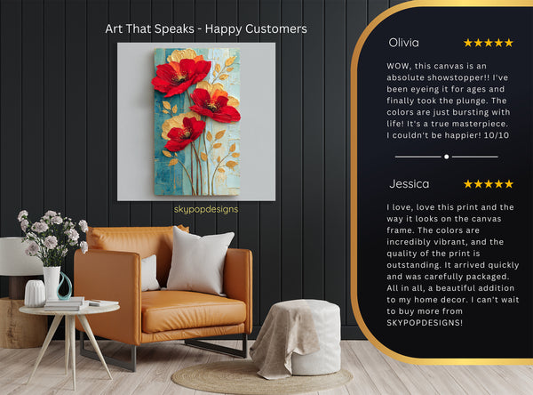 Transform your space with this stunning canvas wall art featuring bold red poppies and shimmering gold accents. This captivating piece of nature art, with its vibrant red and teal color palette, adds a touch of modern glamor and contemporary style to any room. The textured brushstrokes create a striking effect, making this poster or canvas wall art a true statement piece. Perfect for your living room, bedroom, entryway, or dining room, this artwork brings life and energy into your home. The rich red of the poppies symbolizes passion and beauty, while the gold details add a luxurious feel. This versatile wall art is ideal for contemporary and glam decor styles, offering a sophisticated look that complements any interior design. It’s also a fantastic gift idea for housewarmings, birthdays, or holidays, guaranteed to impress. Elevate your home today with this eye-catching canvas wall art that adds both color and depth. Enhance your walls with this unique floral art that captures the beauty of nature with stunning detail. This poster or canvas wall art is more than just decor; it's a feeling of warmth and vibrancy. Bring a sense of elegance and artistry into your home with this exquisite poppy artwork. The quality printing ensures the intricate textures and rich colors are preserved, making it a lasting addition to your decor. Discover exceptional wall art that truly transforms your living space.