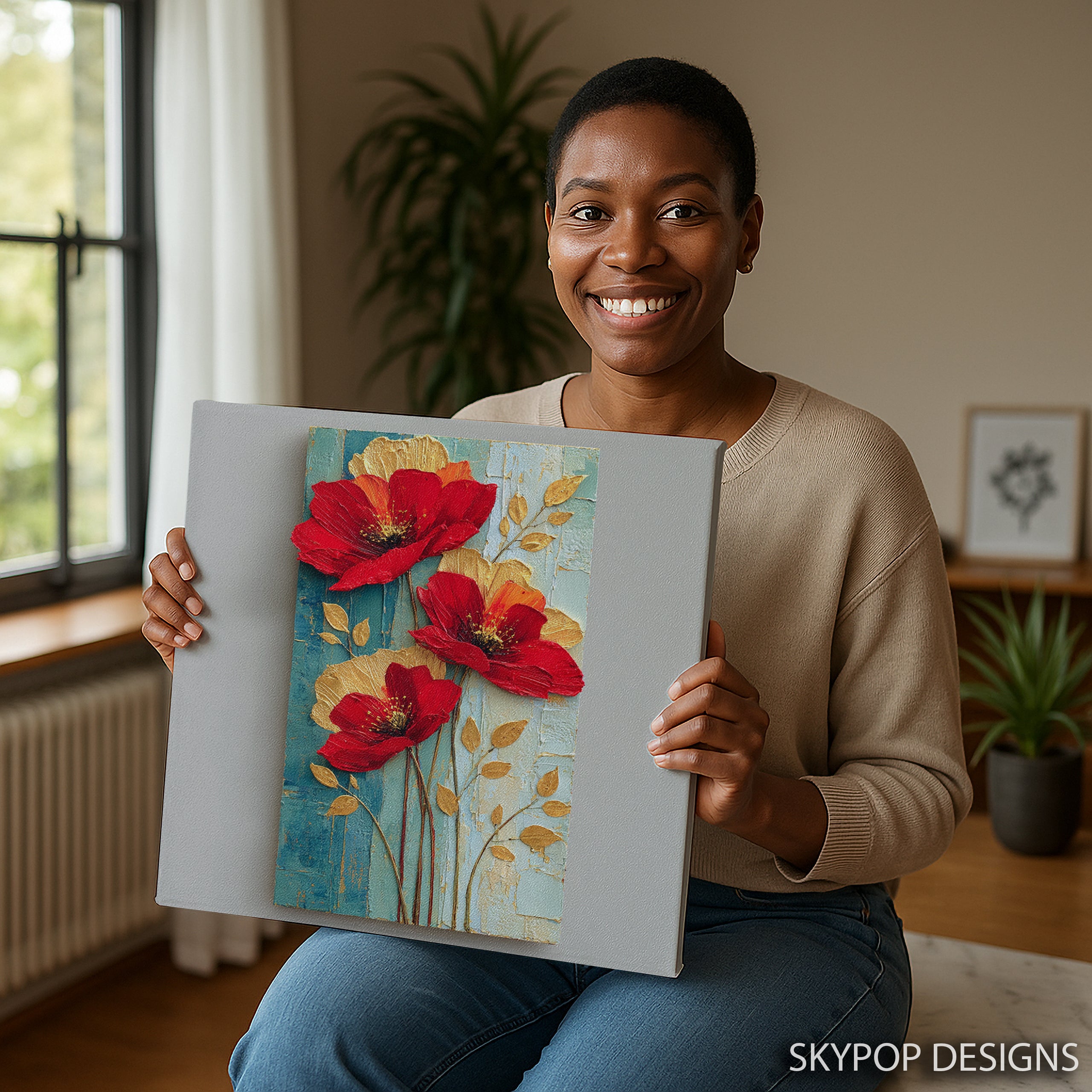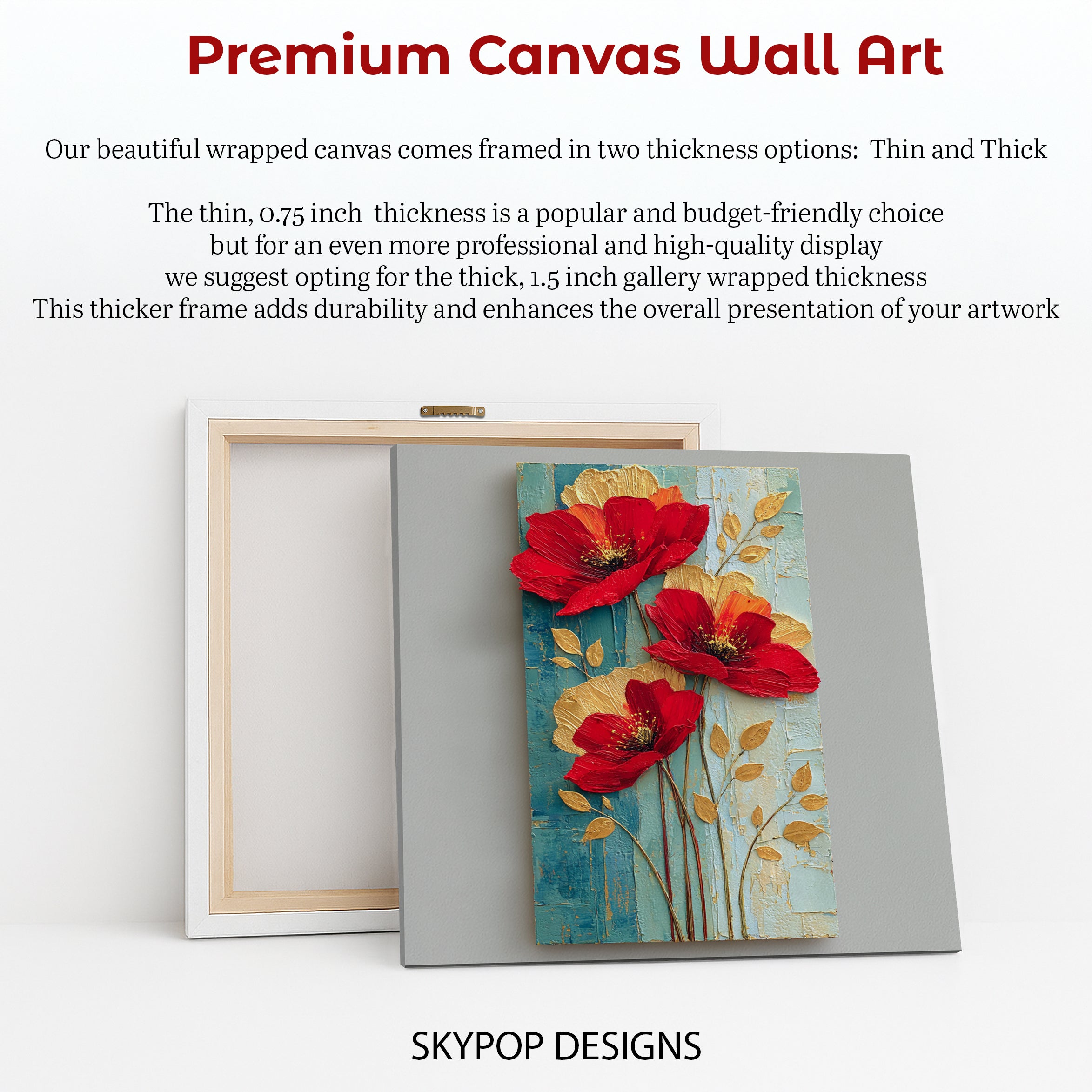 Keywords: Poppy Wall Art, Red Poppies Canvas, Floral Wall Art, Nature Art Canvas, Textured Wall Art, Contemporary Art, Modern Wall Decor, Glam Decor, Teal and Gold Art, Multicolor Wall Art, Living Room Art, Bedroom Wall Art, Entryway Decor, Dining Room Art, Statement Wall Art, Vibrant Red Art, Gold Accent Art, Canvas Poster, Home Decor Artwork, Interior Design Art, Wall Decor Ideas, Housewarming Gift, Birthday Gift Idea, Holiday Gift Art, Passion and Beauty Art, Luxurious Wall Art, Elegant Home Decor, Artistic Wall Piece, Poppy Artwork Canvas, Unique Wall Art