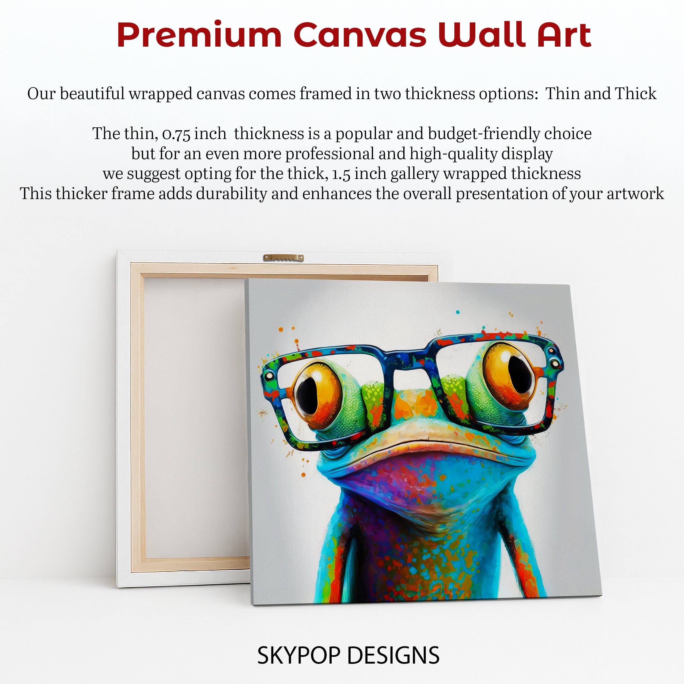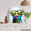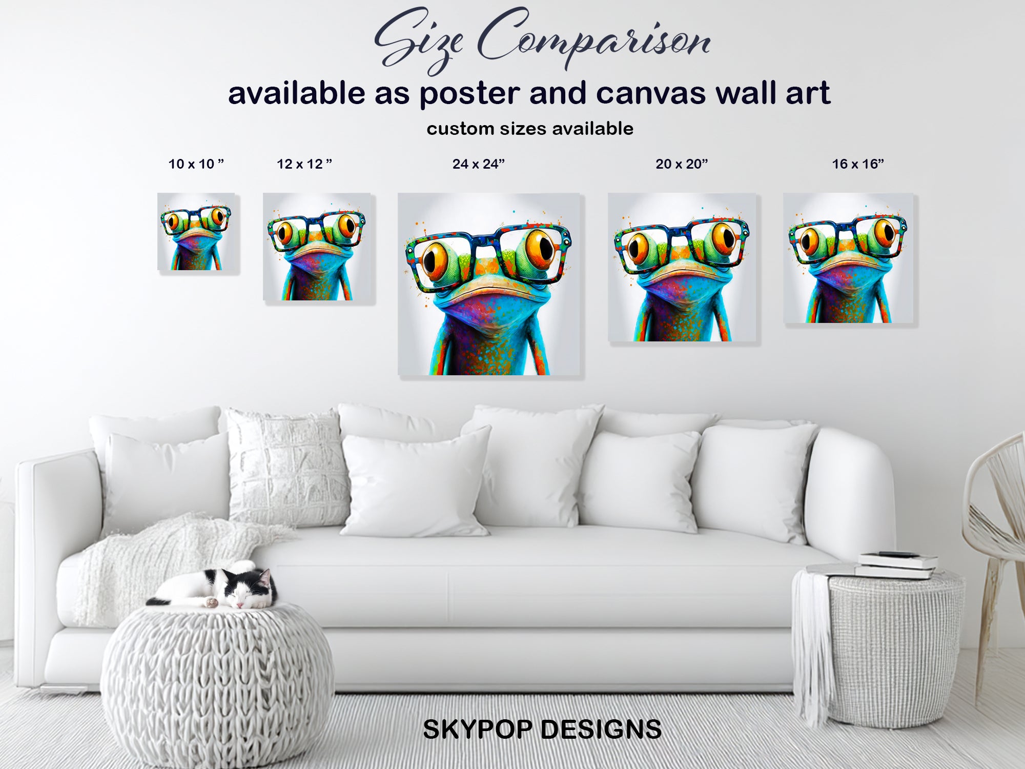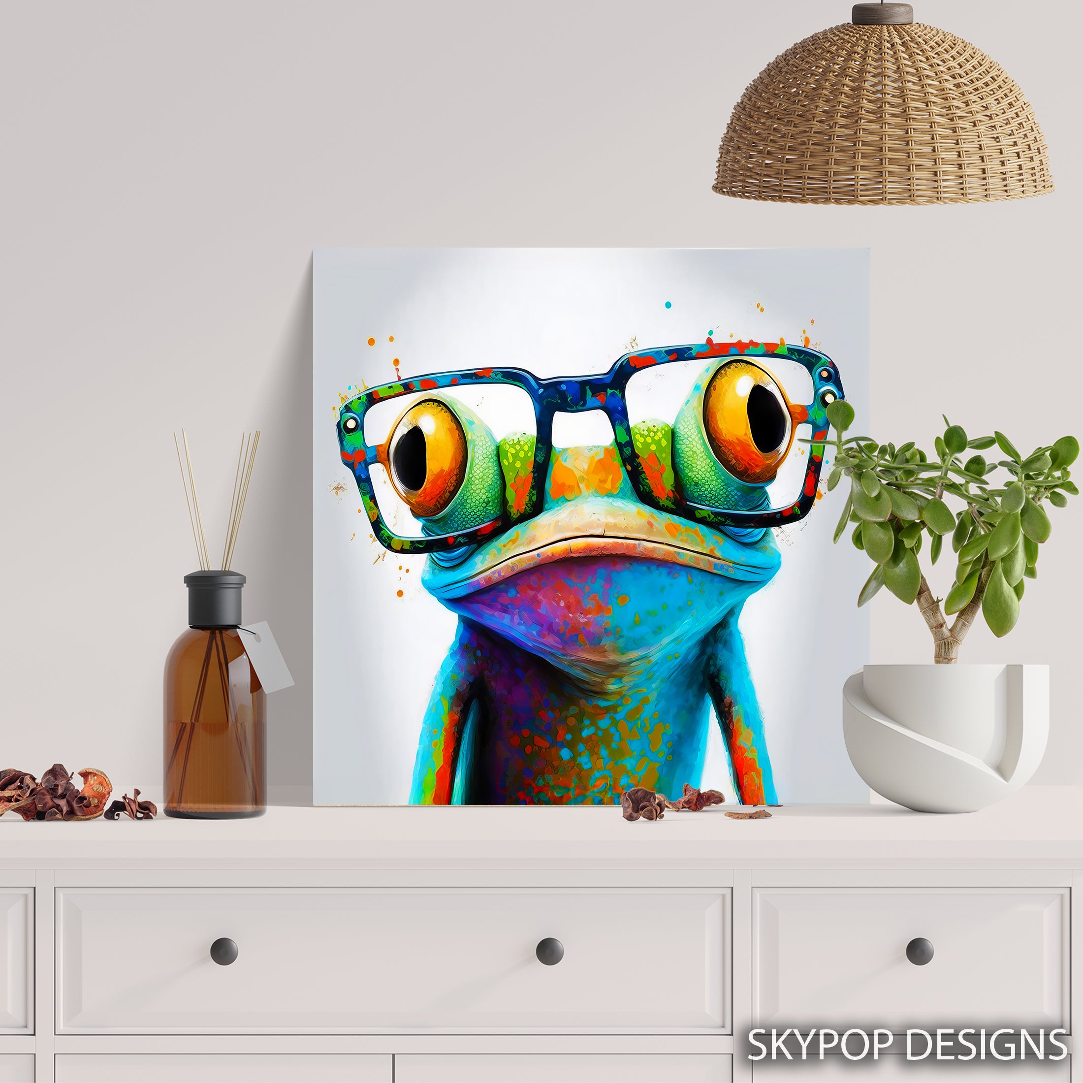 Bring a splash of personality to your space with this vibrant frog canvas wall art, featuring a cool amphibian rocking colorful, oversized glasses. This playful poster or canvas wall art instantly transforms any room with its bold colors and whimsical charm, creating a captivating focal point that sparks joy and conversation. Perfect for modern living rooms or creative office spaces, this unique piece celebrates individuality and brings a touch of fun to your decor. The striking multicolor palette, with prominent teal and orange hues, injects energy and optimism, making it an ideal addition for bohemian and contemporary styles alike. This high-quality canvas wall art captures the frog's expressive, large eyes, adding a delightful character and quirky appeal to your wall. Whether you're looking for a statement piece for your home office, a cheerful addition to your child's room, or a unique gift for a fellow frog lover, this artwork delivers. The dynamic watercolor-like splashes and abstract elements in this poster add a sophisticated, artful touch that complements a variety of interior designs. Showcase your love for quirky art and transform your environment with this lively frog canvas art. Its size versatility makes it a perfect fit for any wall, enhancing your home's aesthetic with its unique blend of pop art and whimsical animal themes. Elevate your decor and embrace the playful spirit of this eye-catching frog artwork today.