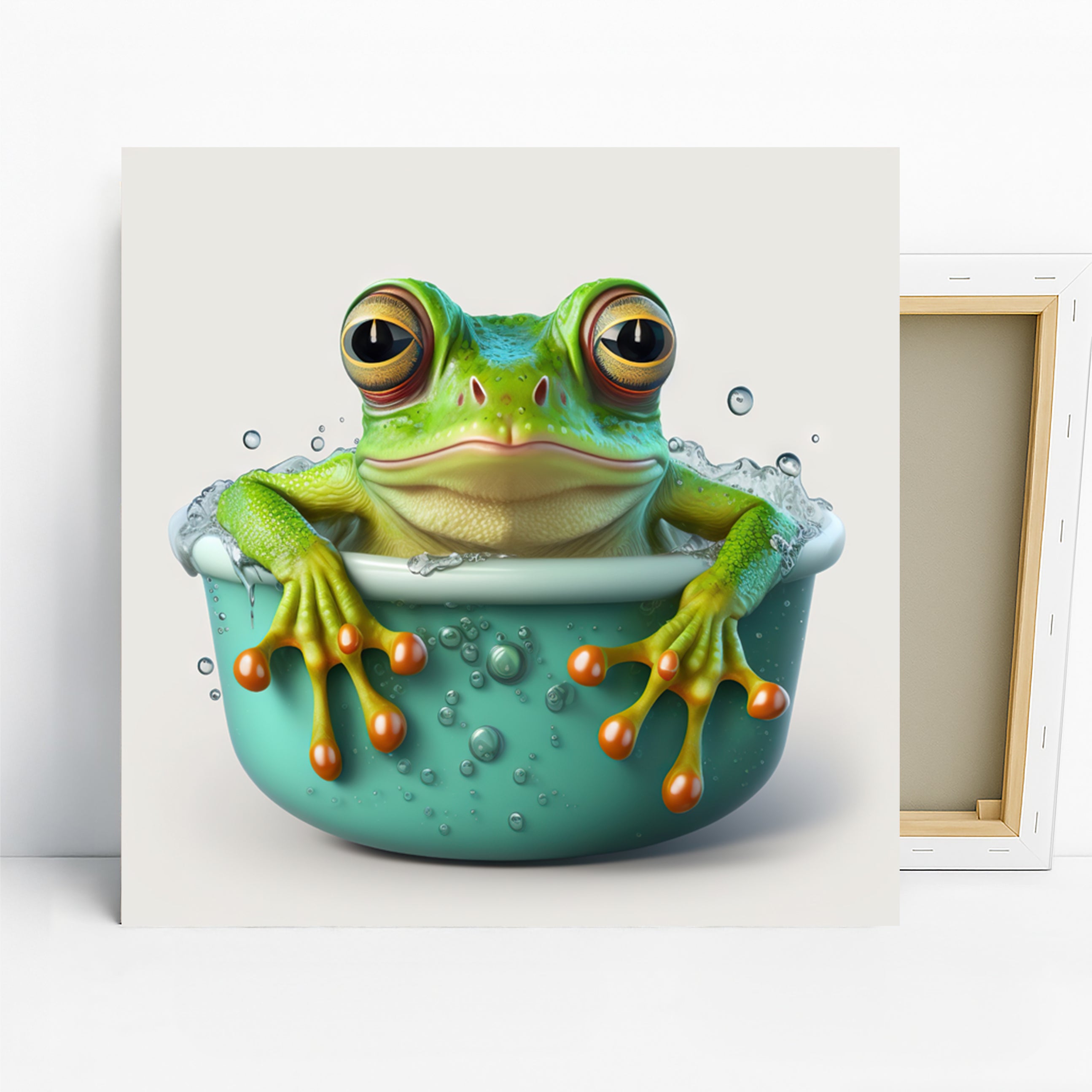 Turn your home into a playful sanctuary with this adorable frog canvas wall art, capturing a frog enjoying a bubbly bath. This charming poster or canvas wall art, featuring a vibrant green frog with big, curious eyes, adds a touch of whimsy and fun to any space. The striking teal bathtub and sparkling water bubbles create a captivating scene that is sure to bring a smile. Perfect for contemporary living rooms or as a fun accent in a child's bathroom, this animal art piece instantly elevates your decor. The rich green and bright orange accents on the frog's toes pop against the cool teal, creating a lively and engaging color scheme. This wall art is ideal for those seeking to inject personality and a bit of lightheartedness into their home, fitting seamlessly into bohemian or modern decor styles. The detailed rendering of the frog and the playful water effects make this canvas wall art a true conversation starter. It’s a fantastic option for a housewarming gift, birthday present, or holiday surprise for anyone who loves quirky animal art. Celebrate the small joys of life with this delightful frog canvas print, designed to add cheer and refresh your wall decor. Its unique subject matter and bright colors are perfect for brightening up any room, from a cozy guest room to a lively play area. Embrace this fun and vibrant poster to transform your bland walls into a cheerful display of personality and style. Add this eye-catching frog artwork to your collection and bring a splash of joy into your everyday life.