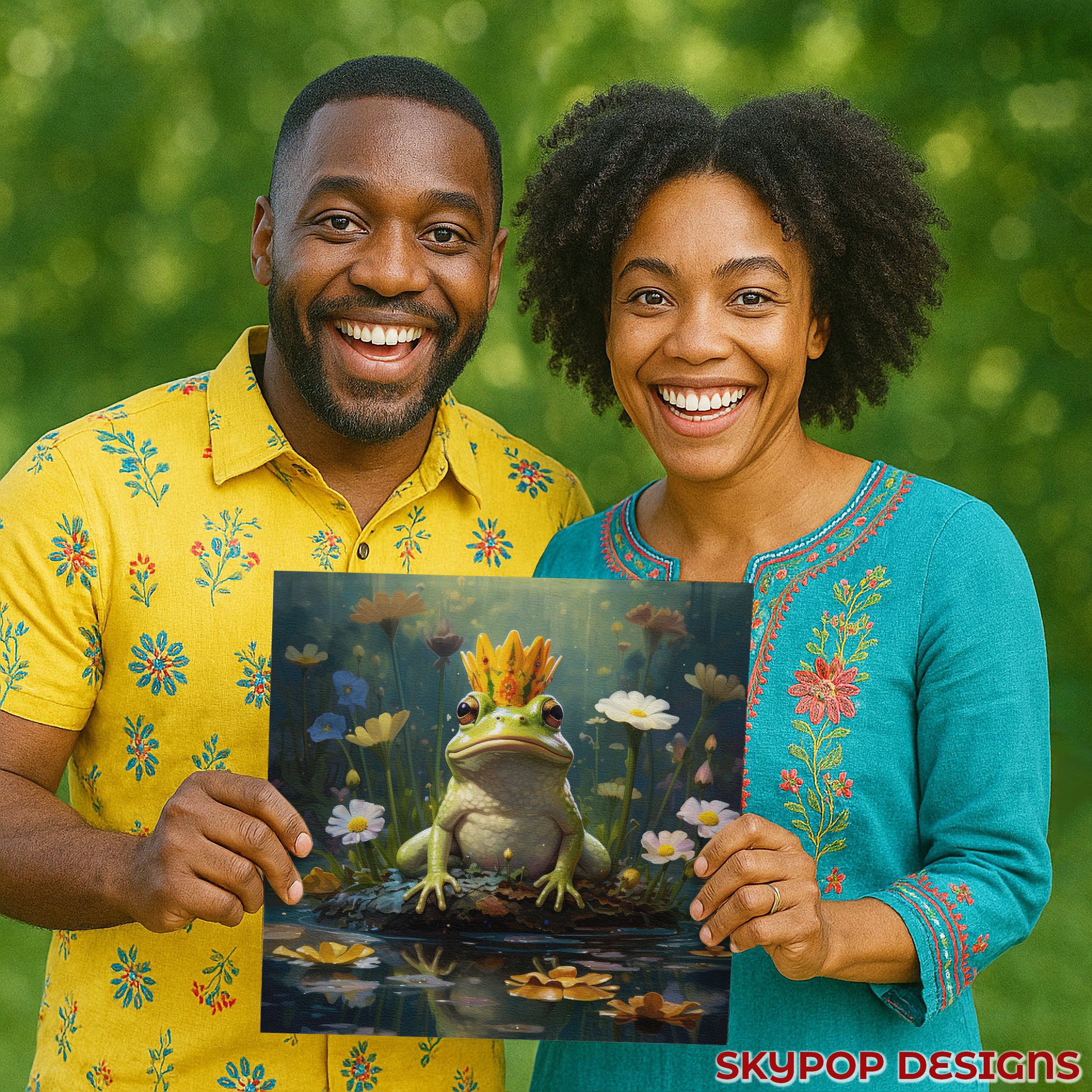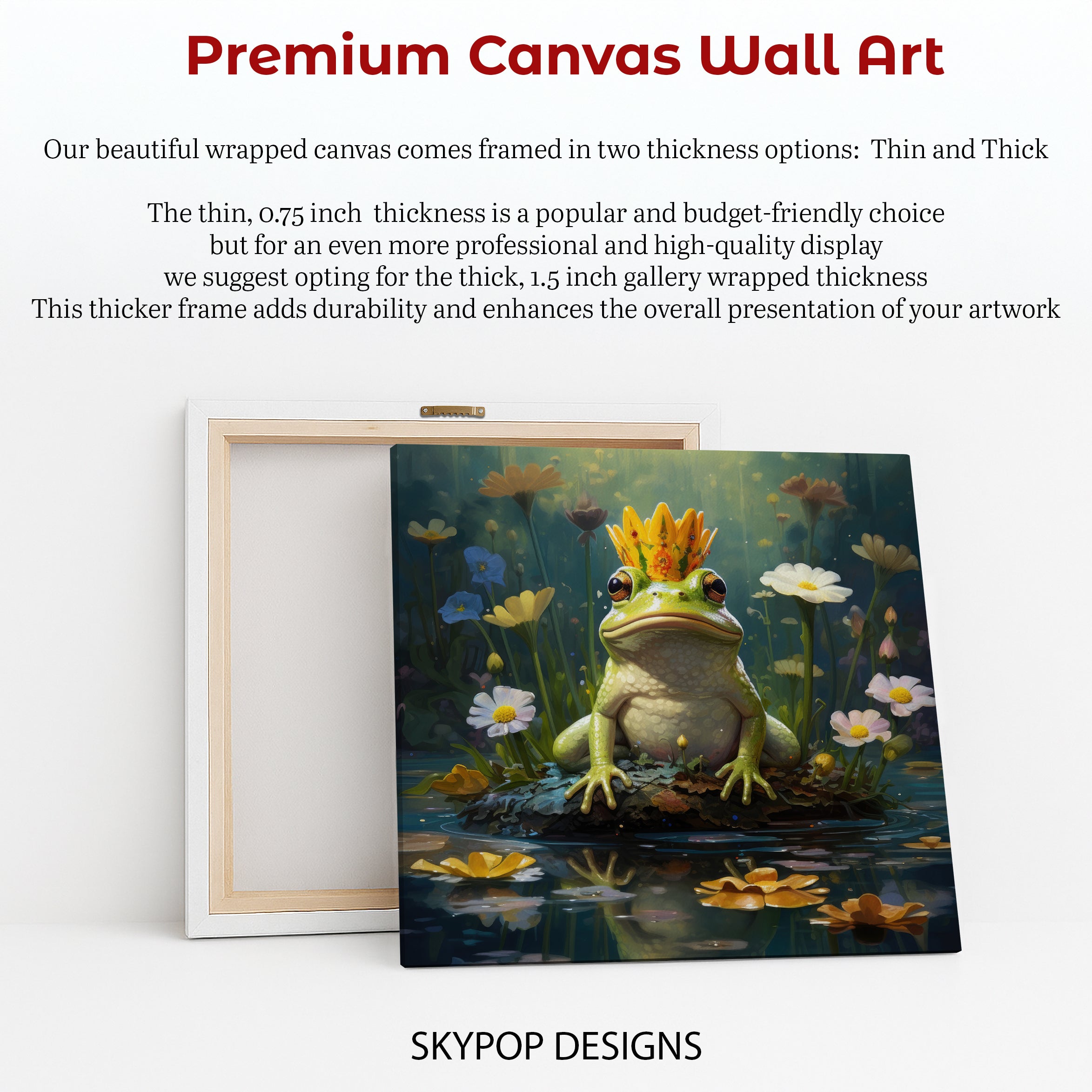 Keywords: Frog King Art, Whimsical Art, Nature Art, Animal Art, Bohemian Decor, Modern Decor, Mid-Century Modern Decor, Living Room Art, Bedroom Art, Children's Room Decor, Game Room Art, Green Art, Yellow Art, Blue Art, Multicolor Art, Frog Wall Art, Canvas Wall Art, Floral Pond Art, Regal Frog Art, Fantasy Art, Enchanting Art, Tranquility Art, Wonder Art, Gift for Nature Lovers, Housewarming Gift, Frog Prince Art, Colorful Wall Art, Designer Wall Art, Art Poster, Home Decor