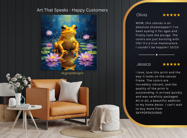 Keywords: Frog Art, Golden Frog, Pond Art, Canvas Wall Art, Nature Art, Whimsical Art, Pop Art, Bohemian Decor, Modern Decor, Contemporary Decor, Living Room Art, Bedroom Art, Bathroom Art, Sunroom Art, Orange Art, Blue Art, Multicolor Art, Yellow Art, Animal Art, Frog Poster, Home Decor, Wall Decor, Statement Art, Tranquil Art, Joyful Art, Gift Ideas, Housewarming Gift, Birthday Gift, Charming Decor, Vibrant Wall Art