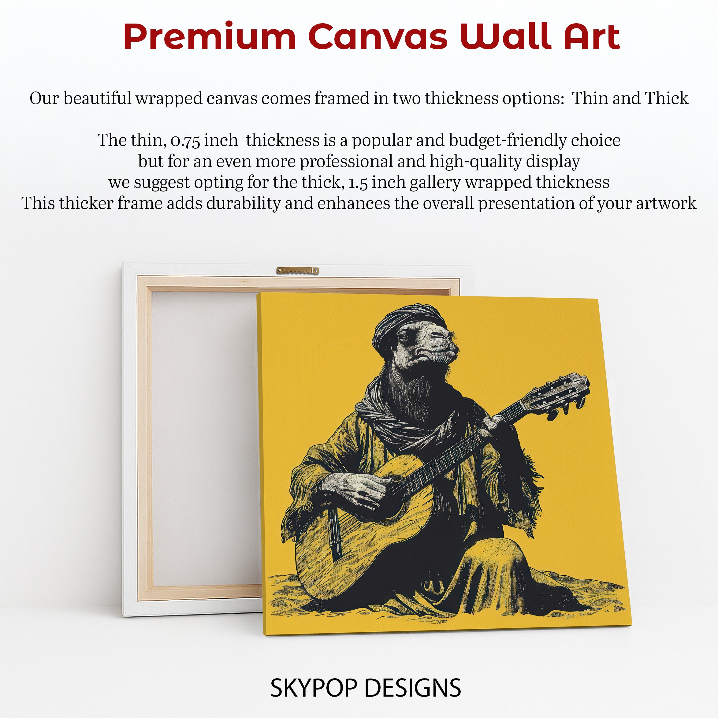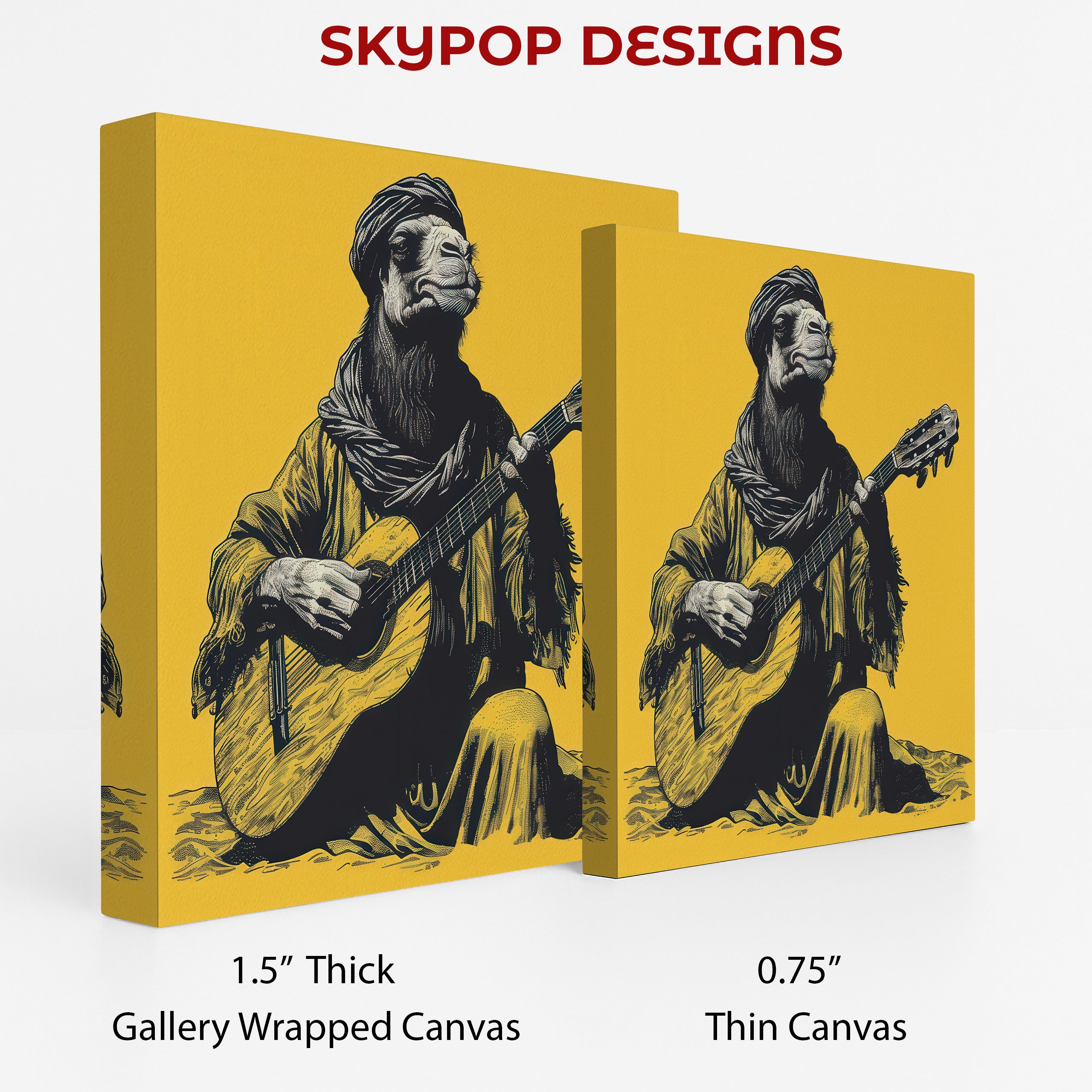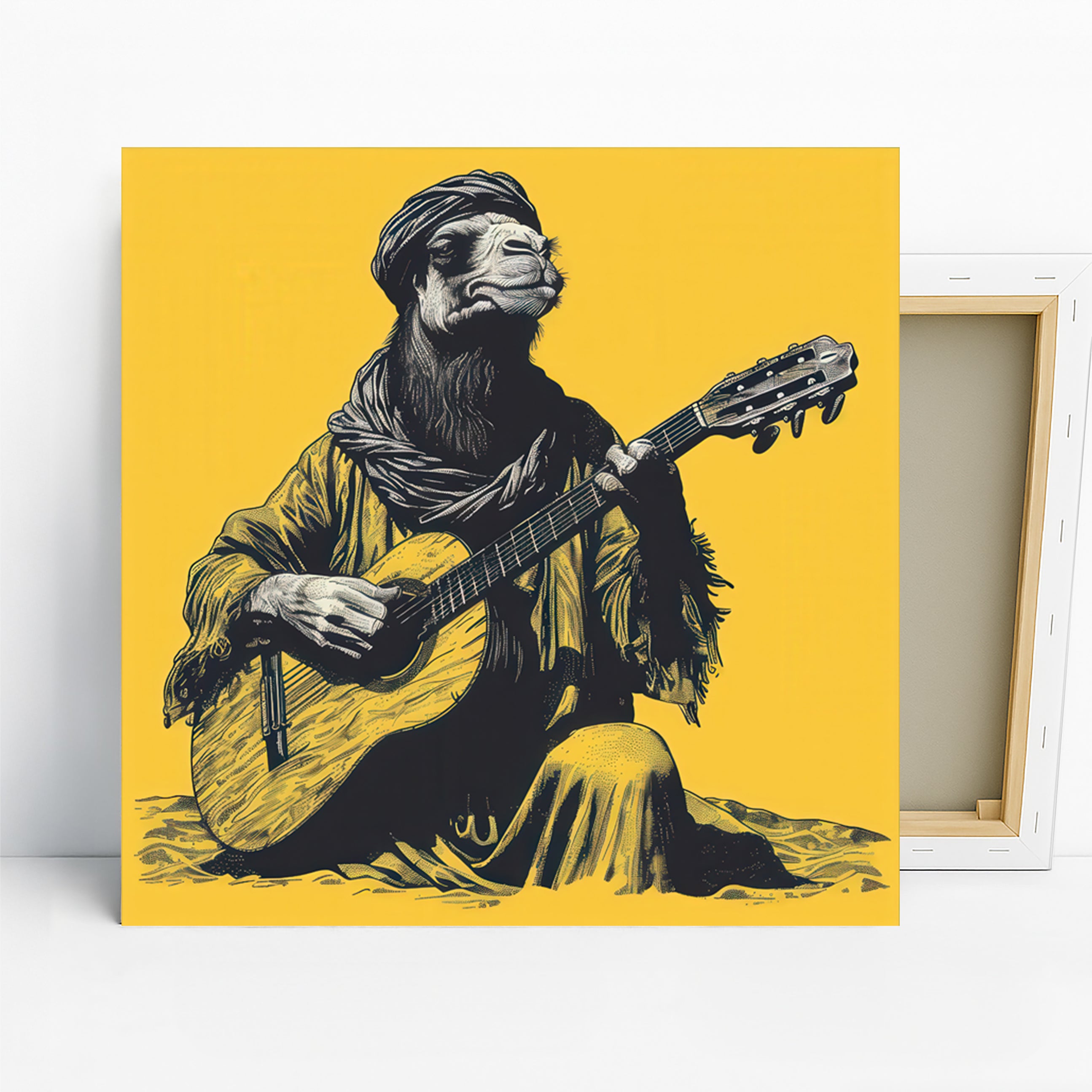 Transform your space with this captivating camel canvas wall art, featuring a musician camel serenading with a guitar. This striking piece, rendered in black and white with a vibrant yellow background, brings unique character to any room. The vintage art style and detailed linework create a fascinating focal point, perfect for living rooms, entryways, or even a home office. Elevate your decor with this eye-catching poster or canvas wall art that blends animal art with a touch of rustic charm. The bold color contrast and intricate shading enhance the artistic appeal, making it an ideal conversation starter. This unique artwork is perfect for those who appreciate quirky decor or have a love for musical themes. It makes a thoughtful gift for birthdays, housewarmings, or any occasion for art lovers. Enhance your walls with this high-quality canvas print that captures the whimsical essence of a desert musician. Add a splash of personality and warmth to your home with this striking camel artwork. Bring a creative and inspiring vibe to your personal sanctuary. Showcase your unique taste with this memorable piece of wall art.