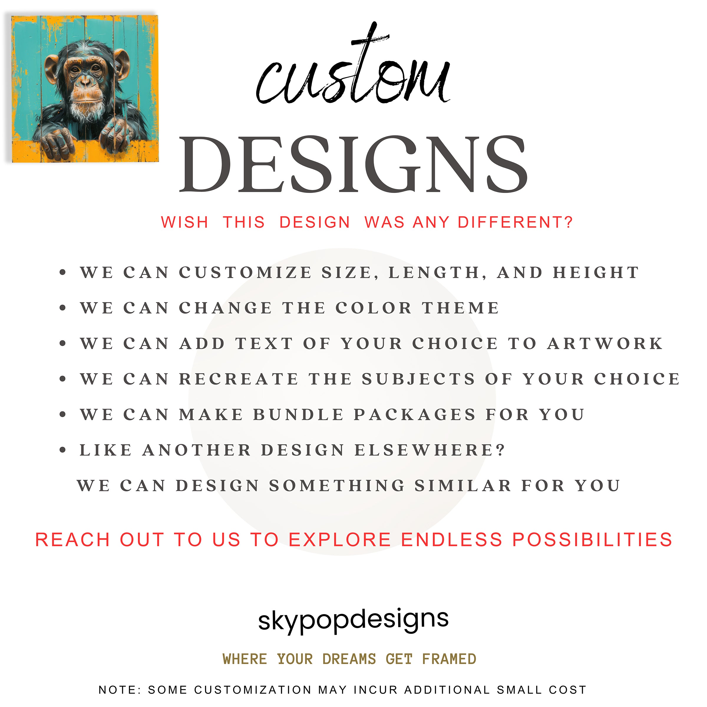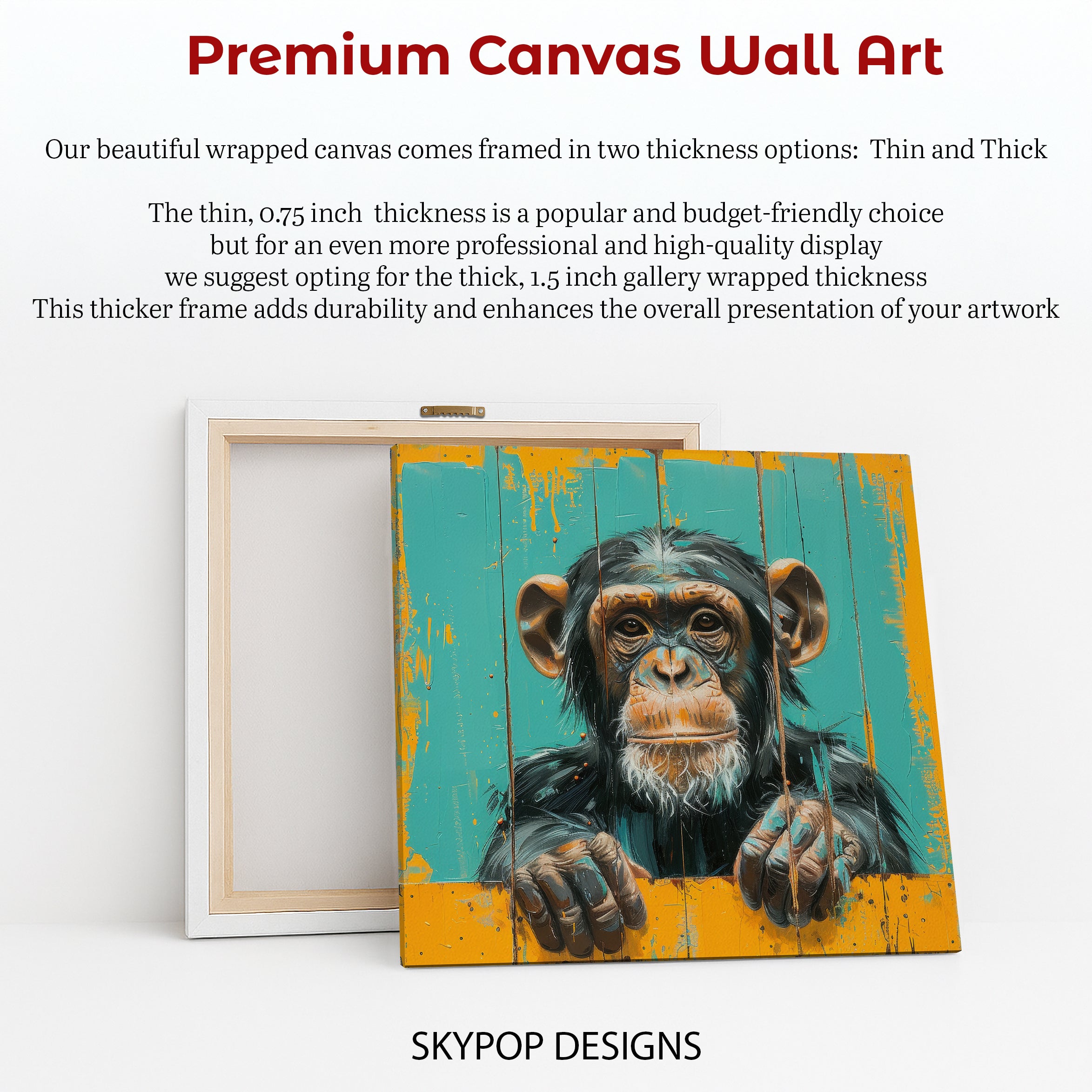 Keywords: Chimpanzee wall art, Pop art canvas, Teal yellow art, Abstract animal print, Graffiti style decor, Modern living room art, Bohemian bedroom decor, Eclectic wall hanging, Office art, Game room art, Multicolor animal art, Contemporary art poster, Curious chimpanzee, Urban aesthetic art, Statement wall art, Conversation starter decor, Playful home decor, Unique canvas print, Edgy art piece, Art lover gift, Animal enthusiast gift, Interior design accent, Vibrant wall art, High-quality print, Nature inspired art, Modern twist art, Bold teal print, Sunny yellow art, Chimpanzee poster, Animal artwork