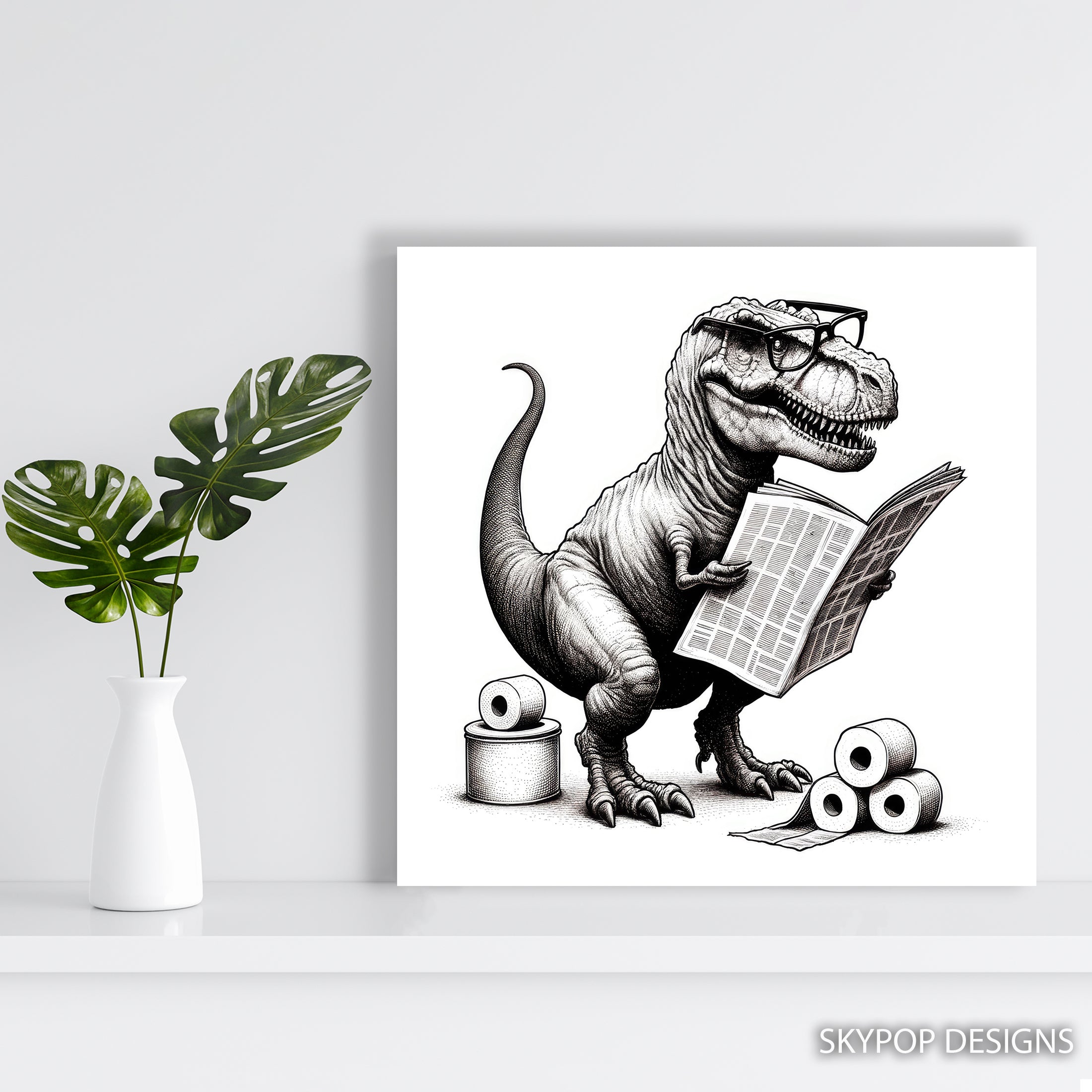 Bring a unique touch to your home with this striking dinosaur canvas wall art featuring a reading T-Rex. This eye-catching poster showcases a vintage-inspired illustration of a T-Rex wearing glasses and engrossed in a newspaper, complemented by rolls of toilet paper, adding a humorous and quirky element. The black and white color scheme lends a classic, sophisticated feel, while the pop art style makes it a conversation starter. Perfect for your living room, office, or game room, this canvas wall art will definitely elevate your space. It's an ideal gift for anyone who loves dinosaurs, humor, or retro decor, making it a great addition for housewarmings or birthdays. This versatile artwork fits seamlessly into modern and contemporary interiors, as well as eclectic or retro-styled spaces. The detailed linework and bold composition of this poster ensure it captivates attention and adds personality to any wall. Inspire laughter and thoughtful moments with this whimsical dinosaur art. Transform your home decor with this cool T-Rex print that’s sure to be a hit. Add this distinctive piece to your wall art collection and enjoy its playful charm daily.